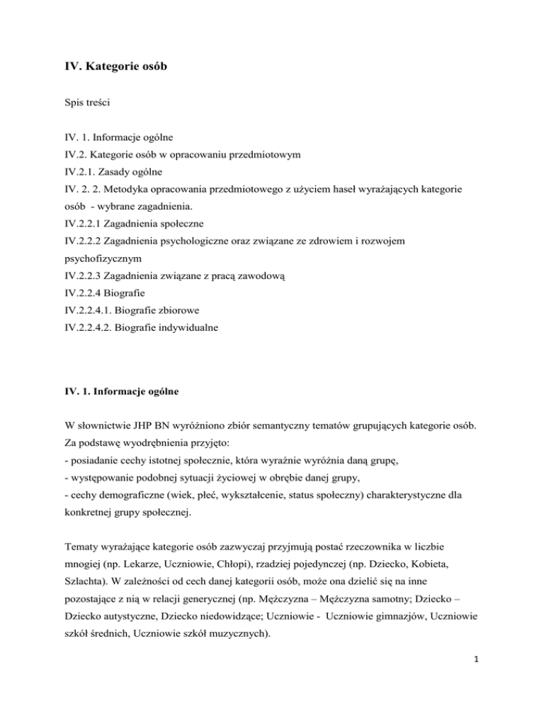 IV. Kategorie osób Spis treści IV. 1. Informacje ogólne IV.2. Kategorie osób w opracowaniu przedmiotowym IV.2.1. Zasady ogólne IV. 2. 2. Metodyka opracowania przedmiotowego z użyciem haseł wyrażających kategorie osób - wybrane zagadnienia. IV.2.2.1 Zagadnienia społeczne IV.2.2.2 Zagadnienia psychologiczne oraz związane ze zdrowiem i rozwojem psychofizycznym IV.2.2.3 Zagadnienia związane z pracą zawodową IV.2.2.4 Biografie IV.2.2.4.1. Biografie zbiorowe IV.2.2.4.2. Biografie indywidualne IV. 1. Informacje ogólne W słownictwie JHP BN wyróżniono zbiór semantyczny tematów grupujących kategorie osób. Za podstawę wyodrębnienia przyjęto: - posiadanie cechy istotnej społecznie, która wyraźnie wyróżnia daną grupę, - występowanie podobnej sytuacji życiowej w obrębie danej grupy, - cechy demograficzne (wiek, płeć, wykształcenie, status społeczny) charakterystyczne dla konkretnej grupy społecznej. Tematy wyrażające kategorie osób zazwyczaj przyjmują postać rzeczownika w liczbie mnogiej (np. Lekarze, Uczniowie, Chłopi), rzadziej pojedynczej (np. Dziecko, Kobieta, Szlachta). W zależności od cech danej kategorii osób, może ona dzielić się na inne pozostające z nią w relacji generycznej (np. Mężczyzna – Mężczyzna samotny; Dziecko – Dziecko autystyczne, Dziecko niedowidzące; Uczniowie - Uczniowie gimnazjów, Uczniowie szkół średnich, Uczniowie szkół muzycznych). 1 Wśród cech socjologicznych/demograficznych będących główną osią podziału na kategorie osób w JHP BN należy wymienić zwłaszcza: - wiek, np.: Niemowlę Dziecko Chłopcy Dzieci-żołnierze Dziecko chore Dziewczęta Noworodek Nastolatki Młodzież Ludzie w wieku średnim Ludzie starzy - płeć, np.: Chłopcy Mężczyzna Dziewczęta Kobieta Kobieta samotna Kobieta wiejska Mężczyzna Mężczyzna samotny - status społeczny, np.: Chłopi Intelektualiści Inteligencja (socjol.) Żebracy Dziady wędrowne Szlachta 2 Arystokracja Mieszczaństwo Celebryci Elita społeczna Renciści i emeryci - zawód, np.: Bibliotekarze Asystenci informacji naukowej Rolnicy Hodowcy bydła Pszczelarze Pracownicy domowi Opiekunki dziecięce Urzędnicy Pracownicy samorządowi Prawnicy Adwokaci Sędziowie Astronomowie Nauczyciele przedszkoli Nauczyciele nauczania początkowego Cukiernicy Fryzjerzy Górnicy eksploatacji podziemnej Konserwatorzy zabytków Konserwatorzy malarstwa Teatrolodzy Krytycy teatralni - zawód związany ze sztuką/działalnością artystyczną (przy tym typie kategorii osób do tematu dodawana jest cecha językowo-etniczna wskazująca na pochodzenie twórców), np.: Artyści 3 Aktorzy Muzycy Pisarze Operatorzy filmowi Scenografowie Tancerze Piosenkarze Graficy Artyści polscy Aktorzy polscy Muzycy niemieccy Operatorzy filmowi amerykańscy Scenografowie włoscy Tancerze rosyjscy Piosenkarze francuscy Graficy czescy - poziom wykształcenia, etap edukacji, np.: Uczniowie Uczniowie gimnazjów Uczniowie klas początkowych Uczniowie szkół muzycznych Uczniowie szkół podstawowych Uczniowie szkół ponadgimnazjalnych Uczniowie szkół specjalnych Uczniowie szkół średnich Uczniowie szkół zawodowych Studenci Klerycy Studenci niepełnosprawni Studenci zagraniczni Absolwenci szkół średnich Absolwenci szkół zawodowych Absolwenci gimnazjów 4 - choroba lub niepełnosprawność (podstawą podziału jest nazwa choroby lub rodzaj niepełnosprawności), np.: Cukrzycy Gruźlicy Chorzy na AIDS Nosiciele HIV Dziecko chore na padaczkę Niepełnosprawni umysłowo Dziecko niepełnosprawne umysłowo Dziecko autystyczne Dziecko z zespołem Aspergera Dziecko z zespołem Downa Młodzież niepełnosprawna fizycznie Młodzież głuchociemna Młodzież niedowidząca Młodzież niewidoma - pełniona funkcja, np.: Przywódcy i głowy państw Politycy Parlamentarzyści Posłowie do Parlamentu Europejskiego Oficerowie Generałowie Biskupi Diakoni Kapelani wojskowi Prymasi Proboszczowie Legaci i nuncjusze apostolscy Święci i błogosławieni Burmistrz Ławnicy 5 Radni Niektóre grupy osób należy opisywać za pomocą odpowiedniego hasła rzeczowego wskazującego na dziedzinę, obszar działalności. Wśród tematów, dla których nie zostało przewidziane utworzenie odpowiednich kategorii osób można wymienić np.: 150 |a Policja (brak tematu Policjanci) 150 |a Milicja (brak tematu Milicjanci) 150 |a Służba celna (brak tematu Celnicy, Pracownicy służby celnej) 150 |a Służba więzienna (brak tematu Pracownicy służb więziennych) 150 |a Straż gminna (brak tematu Strażnicy gminni) 150 |a Macierzyństwo (brak tematu Matki) 150 |a Ojcostwo (brak tematu Ojcowie) 150 |a Papiestwo (brak tematu Papieże) 150 |a Wojsko (brak tematu Wojskowi, Żołnierze) 150 |a Służba zagraniczna (brak tematu Pracownicy służby zagranicznej) 150 |a Ideologia (brak tematu Ideolodzy) 150 |a Feminizm(brak tematu Feministki) Uwaga: nazwy zakonów, zgromadzeń i związków wyznaniowych nie są traktowane jako kategorie osób i występują w opisie przedmiotowym jako hasło korporatywne, np.: 110 2 |a Salezjanie 110 2 |a Krzyżowcy z Czerwoną Gwiazdą 110 2 |a Benedyktynki Sakramentki 110 2 |a Cysterki 110 2 |a Wspólnota Kundaliniego 110 2 |a Kościół Ostatniego Testamentu. Nie wprowadza się do zasobu słownictwa JHP BN tematów wyrażających narody/grupy etniczne, o ile posiadają własną państwowość (np. Polacy, Czesi, Włosi, Egipcjanie, Wietnamczycy, Ekwadorczycy). Dokumenty na temat tych grup opracowuje się stosując: 6 - odpowiedni temat geograficzny oraz adekwatne do treści określniki, np: Polska. – ludność, Czechy - socjologia, Włochy - stosunki etniczne lub - odpowiedni temat z określnikiem geograficznym wyrażającym państwo, np.: Jakość życia – Egipt, Rodzina – Wietnam, Bezrobocie – Ekwador. Wprowadza się natomiast tematy wyrażające członków narodów i grup etnicznych: - nie posiadających własnej państwowości lub zamieszkujących wiele państw, np. Arabowie, Tatarz