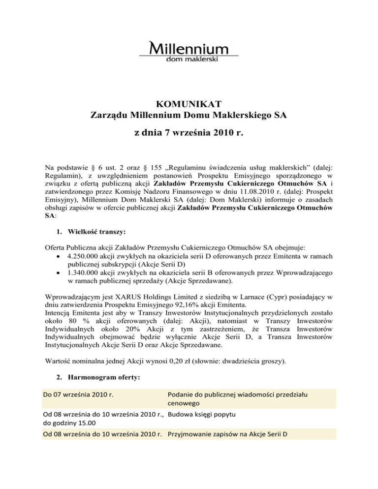KOMUNIKAT Zarządu Millennium Domu Maklerskiego SA z dnia 7 września 2010 r. Na podstawie § 6 ust. 2 oraz § 155 „Regulaminu świadczenia usług maklerskich” (dalej: Regulamin), z uwzględnieniem postanowień Prospektu Emisyjnego sporządzonego w związku z ofertą publiczną akcji Zakładów Przemysłu Cukierniczego Otmuchów SA i zatwierdzonego przez Komisję Nadzoru Finansowego w dniu 11.08.2010 r. (dalej: Prospekt Emisyjny), Millennium Dom Maklerski SA (dalej: Dom Maklerski) informuje o zasadach obsługi zapisów w ofercie publicznej akcji Zakładów Przemysłu Cukierniczego Otmuchów SA: 1. Wielkość transzy: Oferta Publiczna akcji Zakładów Przemysłu Cukierniczego Otmuchów SA obejmuje: 4.250.000 akcji zwykłych na okaziciela serii D oferowanych przez Emitenta w ramach publicznej subskrypcji (Akcje Serii D) 1.340.000 akcji zwykłych na okaziciela serii B oferowanych przez Wprowadzającego w ramach publicznej sprzedaży (Akcje Sprzedawane). Wprowadzającym jest XARUS Holdings Limited z siedzibą w Larnace (Cypr) posiadający w dniu zatwierdzenia Prospektu Emisyjnego 92,16% akcji Emitenta. Intencją Emitenta jest aby w Transzy Inwestorów Instytucjonalnych przydzielonych zostało około 80 % akcji oferowanych (dalej: Akcji), natomiast w Transzy Inwestorów Indywidualnych około 20% Akcji z tym zastrzeżeniem, że Transza Inwestorów Indywidualnych obejmować będzie wyłącznie Akcje Serii D, a Transza Inwestorów Instytucjonalnych Akcje Serii D oraz Akcje Sprzedawane. Wartość nominalna jednej Akcji wynosi 0,20 zł (słownie: dwadzieścia groszy). 2. Harmonogram oferty: Do 07 września 2010 r. Podanie do publicznej wiadomości przedziału cenowego Od 08 września do 10 września 2010 r., Budowa księgi popytu do godziny 15.00 Od 08 września do 10 września 2010 r. Przyjmowanie zapisów na Akcje Serii D w Transzy Inwestorów Indywidualnych Do 13 września 2010 r. Ustalenie i podanie do publicznej wiadomości ceny emisyjnej i ceny sprzedaży Akcji w poszczególnych transzach Od 14 września do 16 września 2010 r. Przyjmowanie zapisów na Akcje w Transzy Inwestorów Instytucjonalnych Najpóźniej 17 września 2010 roku Planowany przydział Akcji w Transzy Inwestorów Indywidualnych za pośrednictwem GPW Najpóźniej 17 września 2010 roku Przydział Akcji w Transzy Inwestorów Instytucjonalnych 3. Osoby uprawnione do składania zapisów na Akcje w Transzy Inwestorów Indywidualnych Inwestorami uprawnionymi do nabywania Akcji w Transzy Inwestorów Indywidualnych na zasadach określonych w Prospekcie Emisyjnym są następujący rezydenci i nierezydenci w rozumieniu prawa dewizowego: osoby fizyczne, osoby prawne oraz podmioty nieposiadające osobowości prawnej, posiadające zdolność do zaciągania zobowiązań i nabywania praw we własnym imieniu. 4. Zasady składania zapisów: 1) Inwestorzy mogą składać zapisy osobiście w Punktach Obsługi Klienta Domu Maklerskiego od 8 września 2010 r. do 10 września 2010 r. w godzinach pracy Punktów Obsługi Klienta Domu Maklerskiego. 2) Na podstawie Części XVIII pkt 2 lit. e) “Instrukcji korzystania z serwisu internetowego Millennium Domu Maklerskiego SA” oraz na podstawie Części I pkt 9 Komunikatu Prezesa Zarządu Millennium Domu Maklerskiego SA z dnia 21 maja 2010 r. w sprawie rodzajów i wymaganych elementów składanych dyspozycji oraz numerów telefonów do składania dyspozycji telefonicznych i faksowych Dom Maklerski informuje, że dopuszcza w terminie od 8 września 2010 r. do 10 września 2010 r. składanie przez Klientów za pomocą telefonu, faksu oraz Internetu dyspozycji wystawienia zapisu na zakup w ofercie publicznej akcji Zakładów Przemysłu Cukierniczego Otmuchów Spółka Akcyjna. W dniu 10 września 2010 r. dyspozycje internetowe mogą być składane do godz. 17.00, natomiast dyspozycje telefoniczne i faksowe mogą być składane w godzinach pracy Punktów Obsługi Klienta Domu Maklerskiego. 5. Zasady składania zapisów przez pełnomocników 1) Pełnomocnicy klientów posiadających pełnomocnictwo bez ograniczeń do dysponowania rachunkiem inwestycyjnym oraz pełnomocnicy posiadający pisemne pełnomocnictwo do złożenia zapisu, wystawione w formie aktu notarialnego lub zawierające podpis mocodawcy poświadczony notarialnie lub przez pracownika Domu Maklerskiego mogą składać zapisy osobiście w Punktach Obsługi Klienta Domu Maklerskiego od 8 września 2010 r. do 10 września 2010 r. w godzinach pracy Punktów Obsługi Klienta Domu Maklerskiego, 2) Na podstawie Części XVIII pkt 2 lit. e) “Instrukcji korzystania z serwisu internetowego Millennium Domu Maklerskiego SA” oraz na podstawie Części I pkt 9 Komunikatu Prezesa Zarządu Millennium Domu Maklerskiego SA z dnia 21 maja 2010 r. w sprawie rodzajów i wymaganych elementów składanych dyspozycji oraz numerów telefonów do składania dyspozycji telefonicznych i faksowych Dom Maklerski informuje, że dopuszcza w terminie od 8 września 2010 r. do 10 września 2010 r. składanie przez przez pełnomocników klientów posiadających pełnomocnictwo bez ograniczeń do dysponowania rachunkiem inwestycyjnym za pomocą telefonu, faksu oraz Internetu dyspozycji wystawienia zapisu na zakup w ofercie publicznej akcji Zakładów Przemysłu Cukierniczego Otmuchów Spółka Akcyjna. W dniu 10 września 2010 r. dyspozycje internetowe mogą być składane do godz. 17.00, natomiast dyspozycje telefoniczne i faksowe mogą być składane w godzinach pracy Punktów Obsługi Klienta Domu Maklerskiego, z zastrzeżenieniem pkt. 3). 3) Pełnomocnik posiadający pełnomocnictwo bez ograniczeń lub pełnomocnictwo do złożenia zapisu, wystawione w formie aktu notarialnego albo zawierające podpis mocodawcy poświadczony notarialnie lub przez pracownika Domu Maklerskiego do dysponowania rachunkiem inwestycyjnym prowadzonym przez Dom Maklerski na rzecz małżonków pozostających we wspólnocie majątkowej, może złożyć internetową dyspozycję wystawienia za