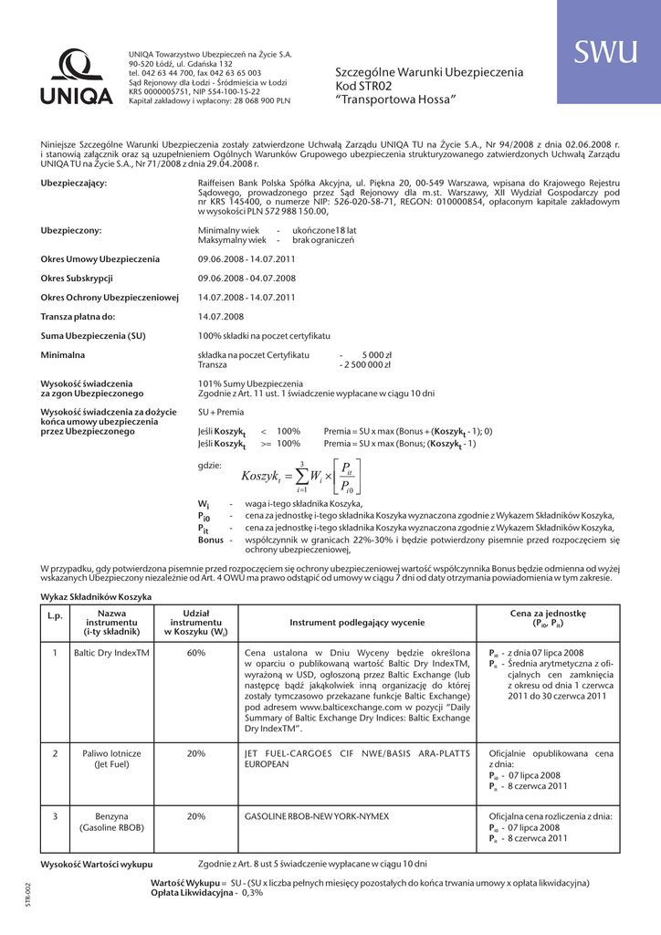 SWU UNIQA Towarzystwo Ubezpieczeń na Życie S.A. 90-520 Łódź, ul. Gdańska 132 tel. 042 63 44 700, fax 042 63 65 003 Sąd Rejonowy dla Łodzi - Śródmieścia w Łodzi KRS 0000005751, NIP 554-100-15-22 Kapitał zakładowy i wpłacony: 28 068 900 PLN Szczególne Warunki Ubezpieczenia Kod STR02 “Transportowa Hossa” Niniejsze Szczególne Warunki Ubezpieczenia zostały zatwierdzone Uchwałą Zarządu UNIQA TU na Życie S.A., Nr 94/2008 z dnia 02.06.2008 r. i stanowią załącznik oraz są uzupełnieniem Ogólnych Warunków Grupowego ubezpieczenia strukturyzowanego zatwierdzonych Uchwałą Zarządu UNIQA TU na Życie S.A., Nr 71/2008 z dnia 29.04.2008 r. Ubezpieczający: Raiffeisen Bank Polska Spółka Akcyjna, ul. Piękna 20, 00-549 Warszawa, wpisana do Krajowego Rejestru Sądowego, prowadzonego przez Sąd Rejonowy dla m.st. Warszawy, XII Wydział Gospodarczy pod nr KRS 145400, o numerze NIP: 526-020-58-71, REGON: 010000854, opłaconym kapitale zakładowym w wysokości PLN 572 988 150.00, Ubezpieczony: Minimalny wiek Maksymalny wiek Okres Umowy Ubezpieczenia 09.06.2008 - 14.07.2011 Okres Subskrypcji 09.06.2008 - 04.07.2008 Okres Ochrony Ubezpieczeniowej 14.07.2008 - 14.07.2011 Transza płatna do: 14.07.2008 Suma Ubezpieczenia (SU) 100% składki na poczet certyfikatu Minimalna ! - ukończone18 lat brak ograniczeń składka na poczet Certyfikatu Transza 5 000 zł - 2 500 000 zł Wysokość świadczenia za zgon Ubezpieczonego 101% Sumy Ubezpieczenia Zgodnie z Art. 11 ust. 1 świadczenie wypłacane w ciągu 10 dni Wysokość świadczenia za dożycie końca umowy ubezpieczenia przez Ubezpieczonego SU + Premia Jeśli Koszykt Jeśli Koszykt < 100% >= 100% Premia = SU x max (Bonus + (Koszykt - 1); 0) Premia = SU x max (Bonus; (Koszykt - 1) gdzie: Wi Pi0 Pit Bonus - waga i-tego składnika Koszyka, cena za jednostkę i-tego składnika Koszyka wyznaczona zgodnie z Wykazem Składników Koszyka, cena za jednostkę i-tego składnika Koszyka wyznaczona zgodnie z Wykazem Składników Koszyka, współczynnik w granicach 22%-30% i będzie potwierdzony pisemnie przed rozpoczęciem się ochrony ubezpieczeniowej, W przypadku, gdy potwierdzona pisemnie przed rozpoczęciem się ochrony ubezpieczeniowej wartość współczynnika Bonus będzie odmienna od wyżej wskazanych Ubezpieczony niezależnie od Art. 4 OWU ma prawo odstąpić od umowy w ciągu 7 dni od daty otrzymania powiadomienia w tym zakresie. Wykaz Składników Koszyka L.p. Nazwa instrumentu (i-ty składnik) Udział instrumentu w Koszyku (Wi) 1 Baltic Dry IndexTM 60% Cena ustalona w Dniu Wyceny będzie określona w oparciu o publikowaną wartość Baltic Dry IndexTM, wyrażoną w USD, ogłoszoną przez Baltic Exchange (lub następcę bądź jakąkolwiek inną organizację do której zostały tymczasowo przekazane funkcje Baltic Exchange) pod adresem www.balticexchange.com w pozycji “Daily Summary of Baltic Exchange Dry Indices: Baltic Exchange Dry IndexTM”. Pi0 - z dnia 07 lipca 2008 Pit - Średnia arytmetyczna z oficjalnych cen zamknięcia z okresu od dnia 1 czerwca 2011 do 30 czerwca 2011 2 Paliwo lotnicze (Jet Fuel) 20% JET FUEL-CARGOES CIF NWE/BASIS ARA-PLATTS EUROPEAN Oficjalnie opublikowana cena z dnia: Pi0 - 07 lipca 2008 Pit - 8 czerwca 2011 3 Benzyna (Gasoline RBOB) 20% GASOLINE RBOB-NEW YORK-NYMEX Oficjalna cena rozliczenia z dnia: Pi0 - 07 lipca 2008 Pit - 8 czerwca 2011 STR-002 Wysokość Wartości wykupu Instrument podlegający wycenie Cena za jednostkę (Pi0, Pit) Zgodnie z Art. 8 ust 5 świadczenie wypłacane w ciągu 10 dni Wartość Wykupu = SU - (SU x liczba pełnych miesięcy pozostałych do końca trwania umowy x opłata likwidacyjna) Opłata Likwidacyjna - 0,3%