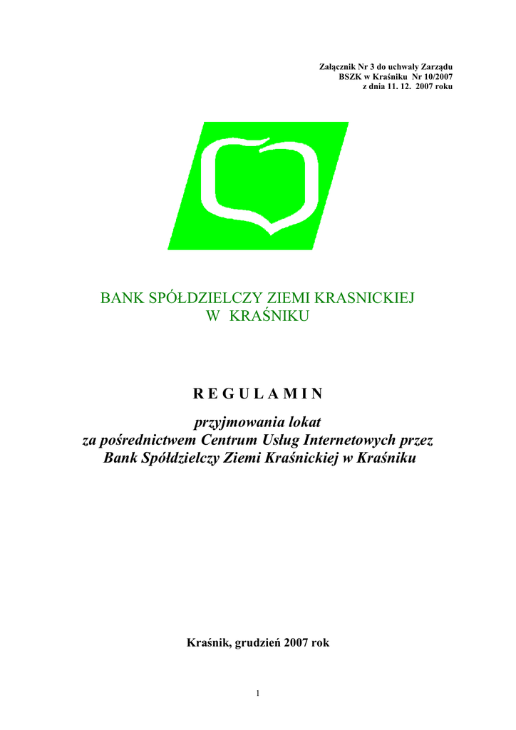 Załącznik Nr 3 do uchwały Zarządu BSZK w Kraśniku Nr 10/2007 z dnia 11. 12. 2007 roku BANK SPÓŁDZIELCZY ZIEMI KRASNICKIEJ W KRAŚNIKU REGULAMIN przyjmowania lokat za pośrednictwem Centrum Usług Internetowych przez Bank Spółdzielczy Ziemi Kraśnickiej w Kraśniku Kraśnik, grudzień 2007 rok 1 Rozdział I Postanowienia ogólne § l. Regulamin niniejszy stanowiący integralną część umowy w sprawie przyjmowania lokat terminowych za pośrednictwem Centrum Usług Internetowych, określa warunki zakładania, prowadzenia i zamykania lokat terminowych w złotych, za pośrednictwem Centrum Usług Internetowych. § 2. 1. Umowa o lokatę terminową może być zawarta przez posiadacza rachunku, czyli krajowe i zagraniczne osoby fizyczne, krajowe osoby prawne i inne krajowe podmioty prawa nie posiadające osobowości prawnej, zwane dalej posiadaczami lokaty. 2. Posiadacz rachunku otrzymuje jeden egzemplarz umowy w sprawie przyjmowania lokat terminowych za pośrednictwem Centrum Usług Internetowych potwierdzony podpisem osoby umocowanej. 3. Lokaty terminowe można założyć na następujące okresy umowne: - lokaty 1 - miesięczne - lokaty 2 - miesięczne - lokaty 3 - miesięczne - lokaty 4 - miesięczne - lokaty 5 - miesięczne - lokaty 6 - miesięczne - lokaty 12 - miesięczne - lokaty 24 - miesięczne i dłuższe 4. Minimalna kwota lokaty terminowej wynosi 100 zł. § 4. Obowiązujące stawki oprocentowania lokat terminowych określone są Uchwałą Zarządu Banku i podawane do wiadomości w formie ogłoszeń w placówkach Banku oraz na stronie www oferty Banku Rozdział II Prowadzenie lokaty terminowej § 5. 1. Okresem, rozliczeniowym jest okres umowny. 2. Początek okresu umownego wyznacza data realizacji zlecenia złożenia lokaty. Koniec okresu umownego wynika z daty realizacji zlecenia i okresu zadeklarowania. Początek i koniec okresu umownego należy sprawdzić po zrealizowaniu dyspozycji złożenia lokaty przez system. 3. W czasie trwania okresu rozliczeniowego nie przyjmuje się dopłat do kwoty lokaty. § 6. Posiadacz rachunku otrzymuje potwierdzenie ustanowienia i likwidacji lokaty w wyciągu z rachunku. § 7. Po upływie okresu umownego lokata może być odnowiona na kolejny okres lub nie podlegać odnowieniu, w zależności od dyspozycji Posiadacza rachunku. §8 Przy ustalaniu okresu umownego oraz przy naliczaniu odsetek przyjmuje się, że rok liczy 365 dni, a miesiąc faktyczną liczbę dni. § 9. 1. Zmiana wysokości oprocentowania lokat terminowych Banku będzie podawana do 2 wiadomości posiadaczy rachunków w formie komunikatu w placówkach Banku, na stronie www za pośrednictwem Centrum Usług Internetowych. Zmiana taka nie wymaga wypowiedzenia umowy. 2. Bank zastrzega sobie prawo do dokonywania zmiany stopy oprocentowania o ile zmianie ulegną niektóre lub wszystkie spośród niżej wymienionych czynników: - stopa oprocentowania kredytu lombardowego w NBP, - stopa redyskonta weksli w NBP, - rentowność bonów skarbowych, - stopa oprocentowania lokat na rynku międzybankowym - poziom kształtowania się rezerw obowiązkowych ustalanych przez Prezesa NBP, - stopa inflacji, §10. Oprocentowanie wkładów lokat może być ustalane jako stała lub zmienna stopa procentowa, w zależności od zasad ustalonych przez Bank. § 11. 1. Odsetki od wkładów lokat terminowych nalicza się: 1) na dzień, upływu zadeklarowanego okresu, 2) na dzień zadysponowania kwotą lokaty przed upływem zadeklarowanego okresu. 3) na dzień naruszenia warunków umowy lokaty terminowej. 2. Z braku odmiennej dyspozycji posiadacza odsetki dopisywane są do salda jego rachunku po zakończeniu okresu umownego (wraz z kwotą lokaty). § 12. Zadysponowanie kwotą lokaty terminowej przed upływem zadeklarowanego okresu powoduje jej zerwanie, a wkładca otrzymuje oprocentowanie w wysokości oprocentowania a vista, czyli płatnych na każde żądanie, od początku tego okresu do dnia poprzedzającego dzień wypłaty (włącznie), § 13. Minimalna kwota lokaty krótkoterminowej jest określana Uchwałą Zarządu Banku i podawana do wiadomości w formie komunikatu na tablicy ogłoszeń w placówkach Banku i stronie www za pośrednictwem Centrum Usług Internetowych. Rozdział III Zmiana postanowień umowy § 14. 1. Zmiany istotnych postanowień umowy w sprawie przyjmowania za pośrednictwem CUI lokat wymagają zastosowania trybu wypowiedzenia. 2. Wypowiedzenie, o którym mowa w pkt. 1 posiadacz otrzymuje wraz z informacją i drukiem oświadczenia. Informacja zawiera proponowane zmiany ze wskazaniem 14dniowego terminu (liczonego od dnia odbioru wypowiedzenia przez posiadacza), na złożenie przez niego otrzymanego oświadczenia Wypowiedzenie może być przesłane posiadaczowi rachunku listem poleconym lub w formie elektronicznej za pomocą Centrum Usług Internetowych – od chwili udostępnienia przez Bank. W przypadku drogi elektronicznej dzień odbioru wypowiedzenia, liczy się od dnia otwarcia korespondencji – „kliknięcie myszką” na korespondencję przychodzącą z Banku w Centrum Usług Internetowych. 3. Nie przekazanie do Banku (nie odesłanie listem poleconym, nie złożenie bezpośrednio w placówce pośredniczącej bądź nie przekazanie w formie elektronicznej - z autoryzacją kluczem autoryzacyjnym generowanym za pomocą tokena - od chwili udostępnienia takiej możliwości przez Bank) podpisanego oświadczenia w terminie określonym w pkt 2, oznacza wyrażenie zgody na proponowaną zmianę i powoduje uchylenie wypowiedzenia. 3 4. Złożenie przez posiadacza rachunku oświadczenia o odmowie przyjęcia zmian listem poleconym do Banku lub bezpośrednio w placówce pośredniczącej (bądź przekazanie w formie elektronicznej - z autoryzacją kluczem autoryzacyjnym generowanym za pomocą tokena, od chwili udostępnienia takiej możliwości przez Bank) powoduje rozwiązanie umowy po upływie 14-dniowego okresu liczonego od dnia doręczenia wypowiedzenia do Banku. W chwili rozwiązania 