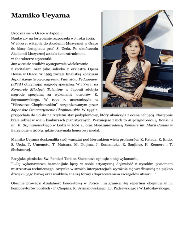 Mamiko Ueyama Urodziła sie w Osace w Japonii. Naukę gry na fortepianie rozpoczęła w 3 roku życia. W 1990 r. wstąpiła do Akademii Muzycznej w Osace do klasy fortepianu prof. S. Ueda. Po ukończeniu Akademii Muzycznej została tam zatrudniona w charakterze asystentki. Już w czasie studiów występowała wielokrotnie z recitalami oraz jako solistka z orkiestrą Opera House w Osace. W 1993 została finalistką konkursu Japońskiego Stowarzyszenia Pianistów Pedagogów (JPTA) otrzymując nagrodę specjalną. W 1994 r. na Koncercie Młodych Talentów w Japonii zdobyła nagrodę specjalną za wykonanie utworów K. Szymanowskiego. W 1997 r. uczestniczyła w "Wieczorze Chopinowskim" zorganizowanym przez Japońskie Stowarzyszenie Chopinowskie. W 1997 r. przyjechała do Polski na trzyletni staż podyplomowy, który ukończyła z oceną celującą. Następnie brała udział w wielu konkursach pianistycznych. Ważniejsze z nich to Międzynarodowy Konkurs im. K. Szymanowskiego w Łodzi w 2001 r., oraz Międzynarodowy Konkurs im. Marii Canals w Barcelonie w 2003r. gdzie otrzymała honorowy medal. Mamiko Ueyama doskonaliła swój warsztat pod kierunkiem wielu profesorów: K. Katada, K. Endo, S. Ueda, T. Umemoto, T. Matsura, M. Noijma, J. Romaniuka, R. Sanjinez, K. Kennera i T. Shebanovej. Rosyjska pianistka, Św. Pamięci Tatiana Shebanova opinuje o niej wykonaniu, "...Jej wykonawstwo harmonijnie łączy w sobie artystyczną dojrzałość z wysokim poziomem mistrzostwa technicznego. Artystka w swoich interpretacjach wyróżnia się wrażliwością na piękno dźwięku, jego barwę oraz wnikliwą analizą formy i dopracowaniem szczegółów utworu..." Obecnie prowadzi działalność koncertową w Polsce i za granicą. Jej repertuar obejmuje m.in. kompozytorów polskich - F. Chopina, K. Szymanowskiego, I.J. Paderwskiego i W.Lutosławskiego.