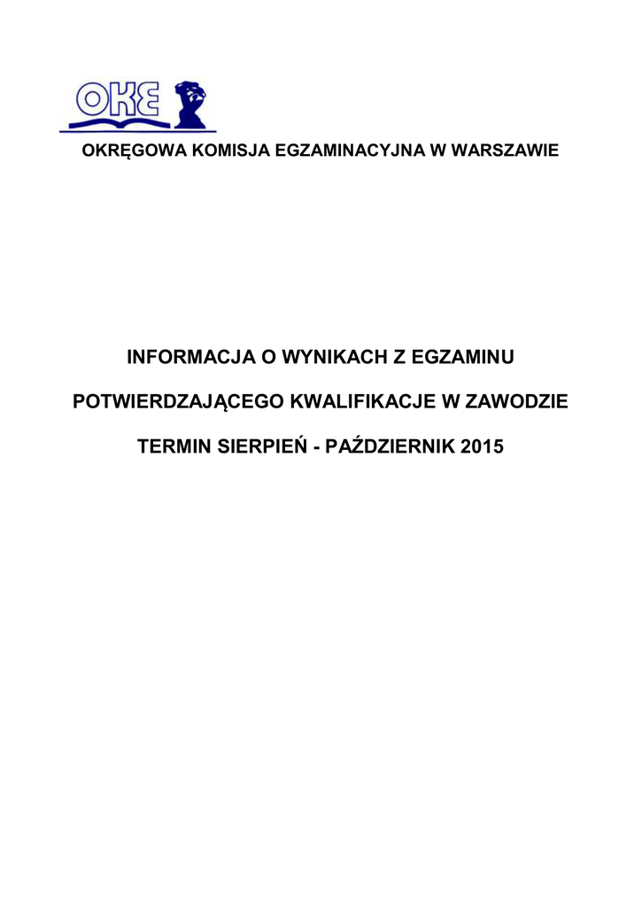 OKRĘGOWA KOMISJA EGZAMINACYJNA W WARSZAWIE INFORMACJA O WYNIKACH Z EGZAMINU POTWIERDZAJĄCEGO KWALIFIKACJE W ZAWODZIE TERMIN SIERPIEŃ - PAŹDZIERNIK 2015 1. OGÓLNE INFORMACJE O EGZAMINIE POTWIERDZAJĄCYM KWALIFIKACJE W ZAWODZIE Egzamin potwierdzający kwalifikacje w zawodzie jest egzaminem zawodowym, który został wdrożony do systemu egzaminów zewnętrznych w roku szkolnym 2012/2013. Zasady organizacji i przeprowadzania nowego egzaminu zawodowego są określone w rozporządzeniu Ministra Edukacji Narodowej z dnia 27 lutego 2015 roku w sprawie szczegółowych warunków i sposobu przeprowadzania egzaminu potwierdzającego kwalifikacje w zawodzie (Dz.U. z 2015 r., poz. 637) Egzamin potwierdzający kwalifikacje w zawodzie przeprowadzany jest dla: uczniów zasadniczych szkół zawodowych i techników oraz uczniów i słuchaczy szkół policealnych, absolwentów zasadniczych szkół zawodowych, techników i szkół policealnych, osób, które ukończyły kwalifikacyjny kurs zawodowy oraz osób dorosłych, które ukończyły praktyczną naukę zawodu dorosłych lub przyuczenie do pracy dorosłych. Egzamin potwierdzający kwalifikacje w zawodzie jest formą oceny poziomu opanowania przez zdającego wiedzy i umiejętności z zakresu danej kwalifikacji wyodrębnionej w zawodzie, ustalonych w podstawie programowej kształcenia w zawodach. Uczniowie/słuchacze szkół zawodowych zdają egzaminy w trakcie nauki szkolnej, po zakończeniu kształcenia z zakresu poszczególnej kwalifikacji wyodrębnionej w danym zawodzie. Termin egzaminu potwierdzającego kwalifikacje w zawodzie ustalony przez dyrektora komisji okręgowej, w uzgodnieniu z dyrektorem komisji centralnej zostaje ogłoszony na stronie internetowej OKE nie później niż na 5 miesięcy przed datą rozpoczęcia egzaminu. Egzamin potwierdzający kwalifikacje w zawodzie składa się z części pisemnej i części praktycznej. Część pisemna egzaminu trwa 60 minut. W tej części egzaminu zdający rozwiązują test pisemny opracowany na egzamin z zakresu danej kwalifikacji wyodrębnionej w zawodzie. Test zawiera 40 zadań zamkniętych z czterema odpowiedziami do wyboru. Rozwiązanie każdego zadania polega na wyborze jednej prawidłowej odpowiedzi. Część pisemna egzaminu jest przeprowadzana z wykorzystaniem arkuszy egzaminacyjnych i kart odpowiedzi lub z wykorzystaniem elektronicznego systemu (wymagane upoważnienie OKE). Wynik części pisemnej egzaminu zawodowego ustala komisja okręgowa, na podstawie: 1) odpowiedzi zapisanych i zarchiwizowanych w elektronicznym systemie przeprowadzania egzaminu zawodowego – w przypadku, gdy część pisemna egzaminu jest przeprowadzana z wykorzystaniem elektronicznego systemu przeprowadzania egzaminu zawodowego, 2) elektronicznego odczytu karty odpowiedzi – w przypadku gdy część pisemna egzaminu jest przeprowadzana z wykorzystaniem arkuszy egzaminacyjnych i kart odpowiedzi. Część praktyczna egzaminu przeprowadzana jest w formie testu praktycznego i polega na wykonaniu przez zdającego na stanowisku egzaminacyjnym zadania egzaminacyjnego zawartego w arkuszu egzaminacyjnym. 2 Część praktyczna egzaminu trwa nie krócej niż 120 minut i nie dłużej niż 240 minut. Czas trwania części praktycznej egzaminu dla poszczególnych kwalifikacji wyodrębnionych w zawodzie jest określony w Informatorze o egzaminie potwierdzającym kwalifikacje w zawodzie z zakresu danej kwalifikacji. Forma organizacji egzaminu: d jedynym rezultatem końcowym jest dokumentacja, dk jedynym rezultatem końcowym jest dokumentacja powstająca z wykorzystaniem komputera, w rezultatem końcowym jest wyrób lub usługa, wk rezultatem końcowym jest wyrób lub usługa powstająca z wykorzystaniem komputera. Liczba zmian egzaminu została określona poprzez formę egzaminu dla danej kwalifikacji, liczbę stanowisk egzaminacyjnych przygotowanych przez ośrodek egzaminacyjny oraz liczbę zdających egzamin z zakresu poszczególnych kwalifikacji w danym ośrodku. Dla zdających ze specjalnymi potrzebami edukacyjnymi czas trwania części pisemnej i części praktycznej egzaminu może być przedłużony, zgodnie z zapisem w Komunikacie Dyrektora Centralnej Komisji Egzaminacyjnej w sprawie szczegółowej informacji o sposobach dostosowania warunków i form przeprowadzania egzaminu potwierdzającego kwalifikacje w zawodzie do potrzeb i możliwości zdających ze specjalnymi potrzebami edukacyjnymi. Efekty wykonania przez zdających zadania egzaminacyjnego oceniają egzaminatorzy wpisani do ewidencji okręgowej komisji egzaminacyjnej stosując kryteria oceniania opracowane przez Centralną Komisję Egzaminacyjną dla danego egzaminu zawodowego. Egzaminator, w zależności od specyfiki zadania egzaminacyjnego z zakresu danej kwalifikacji ocenia: jakość rezultatu końcowego: wyrobu, usługi lub dokumentacji, pod względem spełnienia wymagań określonych w zadaniu egzaminacyjnym zawartym w arkuszu egzaminacyjnym, jakość rezultatu pośredniego, w przypadku gdy jego ocena ma bezpośredni wpływ na ocenę jakości rezultatu końcowego, a nie jest możliwa po wykonaniu zadania egzaminacyjnego zawartego w arkuszu egzaminacyjnym, przebieg wykonania zadania egzaminacyjnego zawartego w arkuszu egzaminacyjnym pod względem: przestrzegania przepisów bezpieczeństwa i higieny pracy, zgodności z metodami lub technologiami właściwymi do wykonania zadania egzaminacyjnego zawartego w arkuszu egzaminacyjnym. Wynik części praktycznej egzaminu zawodowego zdającego ustala komisja okręgowa po elektronicznym odczytaniu wypełnionej karty oceny na podstawie liczby punktów uzyskanych przez zdającego. Zdający zdał egzamin z zakresu danej kwalifikacji, jeżeli uzyskał: z części pisemnej – co najmniej 50% punktów możliwych do uzyskania (poprawnie rozwiązane co najmniej 20 zadań) oraz z części praktycznej – co najmniej 75% punktów możliwych do uzyskania. Wynik egzaminu ustala i ogłasza komisja okręgowa. Wynik ustalony przez