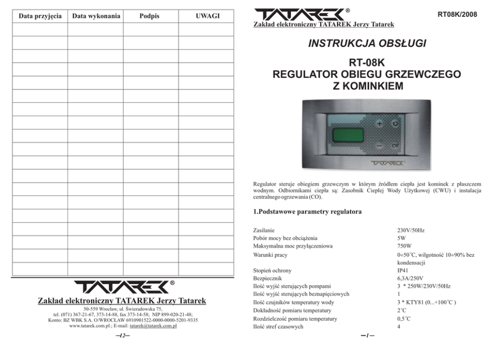 Data przyjęcia Data wykonania Podpis RT08K/2008 UWAGI Zakład elektroniczny TATAREK Jerzy Tatarek INSTRUKCJA OBSŁUGI RT-08K REGULATOR OBIEGU GRZEWCZEGO Z KOMINKIEM Regulator steruje obiegiem grzewczym w którym źródłem ciepła jest kominek z płaszczem wodnym. Odbiornikami ciepła są: Zasobnik Ciepłej Wody Użytkowej (CWU) i instalacja centralnego ogrzewania (CO). 1.Podstawowe parametry regulatora Zasilanie Pobór mocy bez obciążenia Maksymalna moc przyłączeniowa Warunki pracy Zakład elektroniczny TATAREK Jerzy Tatarek 50-559 Wrocław, ul. Świeradowska 75, tel. (071) 367-21-67, 373-14-88, fax 373-14-58; NIP 899-020-21-48; Konto: BZ WBK S.A. O/WROCŁAW 6910901522-0000-0000-5201-9335 www.tatarek.com.pl.; E-mail: [email protected] 12 230V/50Hz 5W 750W o 0¸50 C, wilgotność 10¸90% bez kondensacji IP41 6,3A/250V 3 * 250W/230V/50Hz 1 o 3 * KTY81 (0...+100 C ) o 2C o 0,5 C 4 Stopień ochrony Bezpiecznik Ilość wyjść sterujących pompami Ilość wyjść sterujących beznapięciowych Ilość czujników temperatury wody Dokładność pomiaru temperatury Rozdzielczość pomiaru temperatury Ilość stref czasowych 1 2. Zasada działania Regulator RT-08K steruje pompą ładującą zasobnik ciepłej wody użytkowej (P1). Pompa P1 pracuje gdy temperatura kominka przekroczy wartość „ZAŁ CWU” i ponadto jest wyższa od temp. zasobnika CWU (T2) o wartość parametru „DeltaCWU” (patrz PARAMETRY POZIOMU 1). Drugą funkcją jest sterowanie pompy obiegowej centralnego ogrzewania (P3). Pompa obiegowa pracuje gdy temperatura kominka przekroczy wartość „ZAŁ CO”. Możliwe jest załączenie funkcji priorytetu CWU patrz opis trybów pracy pompy CO. Regulator wyposażony jest w zegar sterujący priorytetem CWU w wybranych porach dnia.. DEKLARACJA ZGODNOŚCI CE Nr ref. 58.RT.01.2007/1/B ZAKŁAD ELEKTRONICZNY TATAREK Jerzy Tatarek ul. Świeradowska 75, 50-559 Wrocław deklaruje z pełną odpowiedzialnością, że: wyrób: Regulator Obiegu Grzewczego T1 model: RT-08K P1 spełnia wymagania zasadnicze zawarte w postanowieniach Dyrektywy EMC 2004/108/WE z 15 grudnia 2004 )Dz. U. Nr 82 poz 556 o kompatybilności elektromagnetycznej( oraz Dyrektywy LVD 2006/95/WE z dnia 12 grudnia 2006r Rozporządzenie Ministra Gospodarki z dnia 21 sierpnia 2007r. w sprawie zasadniczych wymagań dla sprzętu elektrycznego (Dz. U. Nr 155 poz. 1089) T2 Z P3 T3 Do oceny zgodności zastosowano następujące normy zharmonizowane: PN-EN 60730-2-1: 2002 - Rys.1a Podstawowy układ pracy regulatora T1 T2 T3 Z - zawór trójdrogowy zapewniający powrót ciepłej wody do kominka o stałej temperaturze minimalnej PN-EN 60730-1: 2012 PN-EN 55022: 2011 - Automatyczne regulatory elektryczne do użytku domowego i podobnegoCzęść 2-1: Wymagania szczegółowe dotyczące regulatorów elektrycznych do elektrycznych urządzeń domowych. Automatyczne regulatory elektryczne do użytku domowego i podobnegoCzęść 1: Wymagania ogólne. Kompatybilność elektromagnetyczna (EMC)- Urządzenia informatyczne Charakterystyki zaburzeń radioelektrycznych Poziomy dopuszczalne i metody pomiaru. P3 Z P3 P1 Zakład Elektroniczny TATAREK ma wdrożony system zarządzania i spełnia wymagania normy: ISO9001: 2000 CERTYFIKAT nr 133/2004 z 01.2004 Polska Izba Handlu Zagranicznego Rys.1b Układ pracy regulatora z wymiennikiem dla obwodu CO (pompa wymiennika i CO podłączone do wyjścia P3) T1 Ostatnie dwie cyfry roku, w którym naniesiono oznaczenie CE:12 Miejscowość wystawienia: T2 T3 Przedstawiciel producenta: Wrocław Mirosław Zasępa Data wystawienia: Stanowisko: Z P2 P3 P1 17.09.2012 Konstruktor Rys.1c Układ pracy regulatora z wymiennikiem ciepła dla obwodu CO i CWU 2 11 WARUNKI GWARANCJI Producent udziela gwarancji na okres [24] miesięcy od daty zakupu regulatora. Producent nie odpowiada za uszkodzenia mechaniczne powstałe z winy użytkownika. SAMOWOLNE DOKONYWANIE NAPRAW, PRZERÓBEK PRZEZ UŻYTKOWNIKA LUB INNE OSOBY NIEUPRAWNIONE DO ŚWIADCZENIA NAPRAW GWARANCYJNYCH POWODUJE UNIEWAŻNIENIE UPRAWNIEŃ DO GWARANCJI. Karta gwarancyjna jest ważna jeśli posiada wpisaną datę sprzedaży potwierdzoną pieczątką i podpisem sprzedawcy. Napraw gwarancyjnych i pogwarancyjnych dokonuje wyłącznie producent i na jego adres należy dostarczyć niesprawne egzemplarze. Ochrona gwarancyjna obejmuje terytorium UE Gwarancja na sprzedany towar konsumpcyjny nie wyłącza, nie ogranicza, ani nie zawiesza uprawnień kupującego wynikających z niezgodności towaru z umową (Dz. U. nr 141 poz 1176). UWAGA! WSZELKIE DOKONANE WE WŁASNYM ZAKRESIE PRZERÓBKI REGULATORA MOGĄ BYĆ PRZYCZYNĄ POGORSZENIA WARUNKÓW BEZPIECZEŃSTWA JEGO UŻYTKOWANIA I MOGĄ NARAZIĆ UŻYTKOWNIKA NA PORAŻENIE PRĄDEM ELEKTRYCZNYM LUB USZKODZENIE ZASILANYCH URZĄDZEŃ Przewód połączeniowy tego regulatora może być wymieniony wyłącznie przez producenta lub jego autoryzowany zakład serwisowy CWU KOM CO T1 T2 T3 P1 P2 P3 zasobnik Ciepłej Wody Użytkowej (bojler) KOMinek z płaszczem wodnym instalacja Centralnego Ogrzewania górny czujnik temperatury zasobnika/bufora CWU dolny czujnik temperatury zasobnika/bufora CWU czujnik temperatury płaszcza wodnego kominka pompa ładująca zasobnik CWU z kominka pompa pierwotnej strony wymiennika ciepła (pracuje gdy załączona jest P1 lub P3) pompa obiegowa CO 2.1 Praca pompy CO o Jeśli temperatura kominka przekroczy zadaną wartość 45 C (parametr „T.zał CO”), załączy się pompa CO. Wyłączenie pompy poniżej tej wartości powoduje szybsze nagrzewanie płaszcza wodnego powyżej punktu rosy i w efekcie zwiększenie trwałości kominka. W czasie ładowania zasobnika ciepłej wody użytkowej pompa CO może pracować cyklicznie (ograniczając ilość ciepła przekazywaną do instalacji CO) gdy ustawiony jest „Priorytet CWU”. Praca cykliczna polega na załączeniu pompy na okres 45sek a następnie zatrzymaniu na czas 4min (parametr „t.stopCO”) . Regulator zabezpiecza instalację przed zamarzaniem, automatycznie 