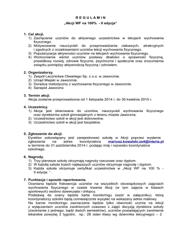 REGULAMIN „Akcji WF na 100% - II edycja” 1. Cel akcji. 1) Zachęcenie uczniów do aktywnego uczestnictwa w lekcjach wychowania fizycznego. 2) Motywowanie nauczycieli do przeprowadzania ciekawych, atrakcyjnych i zgodnych z oczekiwaniami uczniów lekcji wychowania fizycznego. 3) Popularyzacja aktywności uczniów na lekcjach wychowania fizycznego. 4) Wzmocnienie wśród uczniów postawy dbałości o sprawność fizyczną, prawidłowy rozwój, zdrowie fizyczne, psychiczne i społeczne oraz zrozumienia związku pomiędzy aktywnością fizyczną i zdrowiem. 2. Organizatorzy. 1) Zespół Lecznictwa Otwartego Sp. z o.o. w Jaworznie. 2) Urząd Miejski w Jaworznie. 3) Doradca metodyczny z wychowania fizycznego w Jaworznie. 4) Sanepid Jaworzno 3. Termin akcji. Akcja zostanie przeprowadzona od 1 listopada 2014 r. do 30 kwietnia 2015 r. 4. Uczestnicy. 1) Akcja jest skierowana do uczniów, nauczycieli wychowania fizycznego oraz dyrektorów szkół gimnazjalnych z terenu miasta Jaworzna. 2) Uczestnictwo szkół w akcji jest dobrowolne. 3) Uczestnictwo szkół w akcji jest bezpłatne. 5. Zgłoszenie do akcji. Dyrektor zobowiązany jest zarejestrować szkołę w Akcji poprzez wysłanie zgłoszenia na adres koordynatora [email protected] w terminie do 31 października 2014 r. podając imię i nazwisko koordynatora szkolnego. 6. Nagrody. 1) Trzy pierwsze szkoły otrzymają nagrody rzeczowe oraz dyplom. 2) W każdej szkole trzech najlepszych uczniów otrzymuje nagrodę i dyplom. 3) Każda szkoła otrzymuje certyfikat uczestnictwa w „Akcji WF na 100 % II edycja. ”. 7. Punktacja i sposób raportowania. Oceniana będzie frekwencja uczniów na wszystkich obowiązkowych zajęciach wychowania fizycznego w czasie trwania Akcji (w tym zajęcia w klasach sportowych) osobno dziewczęta i chłopcy. Podstawą do oceny będzie karta monitoringu (wzór w załączniku), którą koordynatorzy szkolni będą comiesięcznie wysyłać na wskazany adres mailowy. Na karcie monitoringu zaznaczane będzie tylko obecność ucznia na lekcji z wyłączeniem uczniów zwolnionych czasowo z zajęć decyzją dyrektora szkoły (zwolnienie z jednego, bądź dwóch semestrów), uczniów posiadających zwolnienie lekarskie powyżej 2 tygodni, np.: 28 (stan klasy wg dziennika lekcyjnego) – 2 (1 uczeń zwolniony decyzją dyrektora szkoły, 1 uczeń zwolniony przez lekarza na okres 3 tygodni) = 26 osób. 26 (stan klasy na lekcji wychowania fizycznego) – 5 (liczba osób nieobecnych i nie ćwiczących) = 21 osób (liczba osób obecnych na zajęciach). Frekwencja w danym dniu: 21 : 26 x 100% = 80,77% Jest brane pod uwagę nieprzygotowanie do lekcji, brak stroju czy czasowe zwolnienie od lekarza (do 3 tygodni), czy rodzica (opiekuna prawnego dziecka). Obecność uczniowi wpisujemy gdy jest zwolniony na konkursy, wycieczki szkolne czy zawody sportowe (jest obecny w szkole). Dozwolony jest zapis frekwencji klas połączonych w grupy (np. dziewczęta z klas I a i I b lub zajęć fakultatywnych). Monitorowane będą wszystkie zajęcia wychowania fizycznego będące w planie lekcji oraz wszyscy uczniowie (każda szkoła wybiera najlepszych 3 uczniów osobno w klasyfikacji dziewcząt i chłopców). 8. Postanowienia ogólne. 1) O innych sprawach nie wyszczególnionych w niniejszym regulaminie decydować będzie koordynator Akcji, 2) Niniejszy regulamin zostanie zamieszczony na stronie internetowej Urzędu Miejskiego w Jaworznie oraz Zespół Lecznictwa Otwartego Sp. z o.o. w Jaworznie. 3) Gala Finałowa odbywać się będzie w szkole, która wygra rywalizację. Kontakt: Mariusz Kowalski – koordynator Akcji [email protected] tel.: 693 380 467
