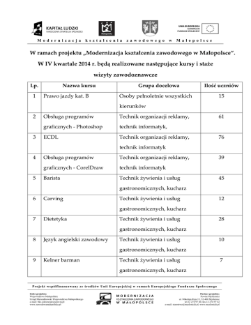 M o dern iza cj a ks zt a ł ce nia za w o do w eg o w M a ło po ls ce W ramach projektu „Modernizacja kształcenia zawodowego w Małopolsce”. W IV kwartale 2014 r. będą realizowane następujące kursy i staże wizyty zawodoznawcze Lp. 1 Nazwa kursu Prawo jazdy kat. B Grupa docelowa Ilość uczniów Osoby pełnoletnie wszystkich 15 kierunków 2 3 Obsługa programów Technik organizacji reklamy, graficznych - Photoshop technik informatyk, ECDL Technik organizacji reklamy, 61 76 technik informatyk 4 5 Obsługa programów Technik organizacji reklamy, graficznych - CorelDraw technik informatyk Barista Technik żywienia i usług 39 45 gastronomicznych, kucharz 6 Carving Technik żywienia i usług 12 gastronomicznych, kucharz 7 Dietetyka Technik żywienia i usług 28 gastronomicznych, kucharz 8 Język angielski zawodowy Technik żywienia i usług 10 gastronomicznych, kucharz 9 Kelner barman Technik żywienia i usług gastronomicznych, kucharz P ro je kt ws półf i na nsowa ny z e śro d kó w Un ii E uro pe j s ki e j w ra ma c h E uro pe j s ki ego Fu nd u sz u S połe cz nego Lider projektu: Województwo Małopolskie Urząd Marszałkowski Województwa Małopolskiego e-mail: [email protected] www.zawodowamalopolska.pl Partner projektu: Powiat Myślenicki ul. Mikołaja Reja 13, 32-400 Myślenice tel.12 274 97 40, fax.12 274 97 42 e-mail: [email protected], www.myslenicki.pl 7 M o dern iza cj a 10 ks zt a ł ce nia Produkcja i zdobienie tortów za w o do w eg o w M a ło po ls ce Technik żywienia i usług 21 gastronomicznych, kucharz 11 Sommelierski Technik żywienia i usług 7 gastronomicznych, kucharz 12 Staż wizyta zawodoznawcza Technik organizacji reklamy 18 Technik informatyk 32 Staż wizyta zawodoznawcza Technik żywienia i usług 38 Karczma Regionalna-Hotel gastronomicznych Agencja Reklamowa Schulz Brand Friendly w Krakowie 13 Staż wizyta zawodoznawcza Delphi Poland S.A. w Krakowie 14 „Gościnna Chata” WysowaZdrój P ro je kt ws półf i na nsowa ny z e śro d kó w Un ii E uro pe j s ki e j w ra ma c h E uro pe j s ki ego Fu nd u sz u S połe cz nego Lider projektu: Województwo Małopolskie Urząd Marszałkowski Województwa Małopolskiego e-mail: [email protected] www.zawodowamalopolska.pl Partner projektu: Powiat Myślenicki ul. Mikołaja Reja 13, 32-400 Myślenice tel.12 274 97 40, fax.12 274 97 42 e-mail: [email protected], www.myslenicki.pl