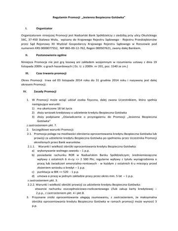 Regulamin Promocji „Jesienna Bezpieczna Gotówka” I. Organizator Organizatorem niniejszej Promocji jest Nadsański Bank Spółdzielczy z siedzibą przy ulicy Okulickiego 56C, 37-450 Stalowa Wola, wpisany do Krajowego Rejestru Sądowego - Rejestru Przedsiębiorców przez Sąd Rejonowy XII Wydział Gospodarczy Krajowego Rejestru Sądowego w Rzeszowie pod numerem KRS 0000077552, NIP 865-00-12-762, Regon 000507621, zwany dalej Bankiem. II. Postanowienia ogólne Niniejsza Promocja nie jest grą losową ani zakładem wzajemnym w rozumieniu ustawy z dnia 19 listopada 2009r. o grach hazardowych ( Dz. U. z 2009r. nr 201, poz. 1540 ze zm.) III. Czas trwania promocji Okres Promocji trwa od 03 listopada 2014 roku do 31 grudnia 2014 roku i nazywany jest dalej okresem Promocji. IV. Zasady Promocji 1. W Promocji może wziąć udział osoba fizyczna, dalej zwana Uczestnikiem, która spełnia następujące warunki: 1) ma ukończone 18 lat życia 2) złoży wniosek kredytowy o udzielenie kredytu Bezpieczna Gotówka 3) złoży podpisane „Oświadczenie o przystąpieniu do Promocji „Jesienna Bezpieczna Gotówka” z zastrzeżeniem pkt. 7. 2. Szczegółowe warunki Promocji: 2.1. Promocja polega na możliwości obniżenia oprocentowania kredytu Bezpieczna Gotówka lub prowizji za udzielenie kredytu Bezpieczna Gotówka po spełnieniu przez Uczestnika Promocji określonych przez Bank warunków. 2.1.1. Warunki i wielkość obniżki oprocentowania kredytu Bezpieczna Gotówka: a) wykonywanie wolnego zawodu – 1 p.p. b) posiadanie rachunku ROR w Nadsańskim Banku Spółdzielczym; średniomiesięczne wpływy z ostatnich 6 m-cy => 2 500 Pln; regularne wpływy z tytułu wynagrodzenia o pracę lub świadczeń emerytalno-rentowych - w każdym z ostatnich 6-u miesięcy przed złożeniem wniosku o kredyt – 1 p.p. c) punktacja w BIK => 520 - 1 p.p. d) umowa o pracę w jednym zakładzie pracy przez okres min. 5 lat – 1 p.p. z zastrzeżeniem pkt. 3. 2.2.2. Warunki i wielkość obniżki prowizji za udzielenie kredytu Bezpieczna Gotówka: otwarcie rachunku oszczędnościowo-rozliczeniowego i/lub zakup karty kredytowej – 2.p.p., z zastrzeżeniem pkt. 4 i pkt.8. 3. Przyznane zniżki oprocentowania ulegają zsumowaniu, z zastrzeżeniem, że maksymalna obniżka oprocentowania kredytu Bezpieczna Gotówka w ramach promocji może wynosić 3 p.p. 4. Jeżeli wysokość zniżki prowizji za udzielenie kredytu Bezpieczna Gotówka przekracza wysokość prowizji wynikającej z Taryfy prowizji i opłat za czynności bankowe w Nadsańskim Banku Spółdzielczym dla klientów indywidualnych, prowizja wynosi 0 %. 5. Skorzystanie ze zniżki oprocentowania kredytu Bezpieczne Gotówka wyklucza możliwość skorzystania ze zniżki prowizji za udzielenie kredytu Bezpieczna Gotówka. 6. Skorzystanie ze zniżki prowizji za udzielenie kredytu Bezpieczna Gotówka wyklucza możliwość skorzystania ze zniżki oprocentowania kredytu Bezpieczne Gotówka. 7. Skorzystanie z obniżenia oprocentowania kredytu Bezpieczna Gotówka z tytułu posiadania Karty Dużej Rodziny1 wyklucza możliwość udziału w niniejszej Promocji. 8. W przypadku likwidacji rachunku oszczędnościowo-rozliczeniowego lub rezygnacji z karty kredytowej - o których mowa w pkt. 2.2.2. - przed dniem spłaty ostatniej raty kredytu Bezpieczna Gotówka, Bank ma prawo żądać od Uczestnika zapłaty prowizji za udzielenie kredytu w wysokości przyznanej zniżki. V. Reklamacje 1. Reklamacje dotyczące spraw związanych z Promocją mogą być zgłaszane osobiście w oddziale Banku, drogą mailową lub telefonicznie. 2. Zgłaszane reklamacje powinny zawierać dokładny opis i powód reklamacji. 3. Reklamacje składane w formie pisemnej powinny zawierać także: imię, nazwisko, adres zamieszkania Uczestnika oraz telefon kontaktowy. 4. Bank rozpatruje reklamację niezwłocznie po jej otrzymaniu oraz udziela odpowiedzi. VI. Postanowienia końcowe 1. Przyjęcie Promocji oznacza akceptację zasad zawartych w niniejszym Regulaminie. 2. Niniejszy Regulamin jest jedynym dokumentem określającym zasady Promocji. 3. Regulamin wchodzi w życie z dniem 03 listopada 2014 roku. 1 Karta Dużej Rodziny – karta wydawana w ramach rządowego programu dla rodzin wielodzietnych zgodnie z Rozporządzeniem Rady Ministrów z dnia 27 maja 2014r. w sprawie szczegółowych warunków realizacji rządowego programu dla rodzin wielodzietnych.