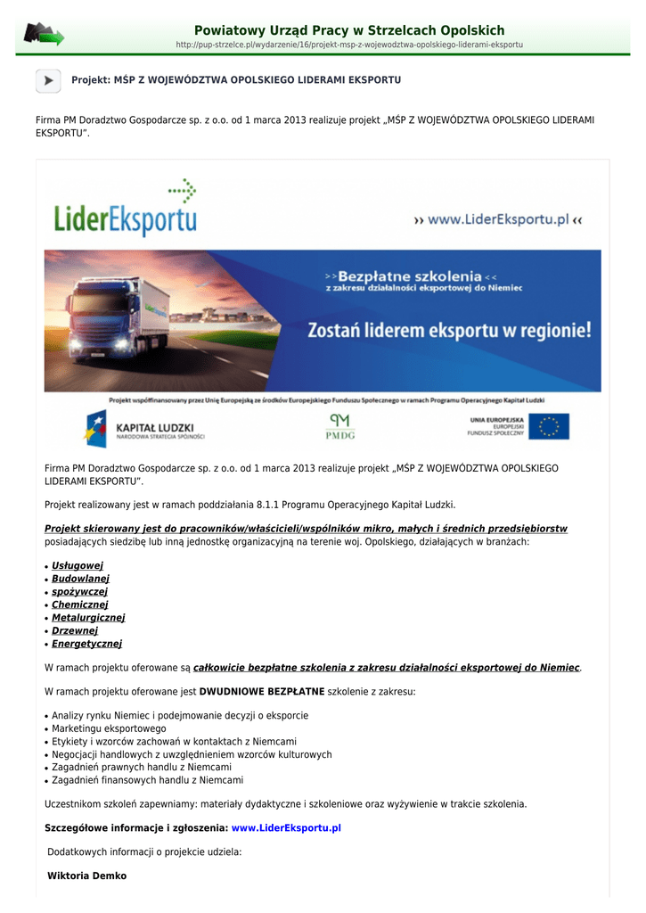 Powiatowy Urząd Pracy w Strzelcach Opolskich http://pup-strzelce.pl/wydarzenie/16/projekt-msp-z-wojewodztwa-opolskiego-liderami-eksportu Projekt: MŚP Z WOJEWÓDZTWA OPOLSKIEGO LIDERAMI EKSPORTU Firma PM Doradztwo Gospodarcze sp. z o.o. od 1 marca 2013 realizuje projekt „MŚP Z WOJEWÓDZTWA OPOLSKIEGO LIDERAMI EKSPORTU”. Firma PM Doradztwo Gospodarcze sp. z o.o. od 1 marca 2013 realizuje projekt „MŚP Z WOJEWÓDZTWA OPOLSKIEGO LIDERAMI EKSPORTU”. Projekt realizowany jest w ramach poddziałania 8.1.1 Programu Operacyjnego Kapitał Ludzki. Projekt skierowany jest do pracowników/właścicieli/wspólników mikro, małych i średnich przedsiębiorstw posiadających siedzibę lub inną jednostkę organizacyjną na terenie woj. Opolskiego, działających w branżach: ● ● ● ● ● ● ● Usługowej Budowlanej spożywczej Chemicznej Metalurgicznej Drzewnej Energetycznej W ramach projektu oferowane są całkowicie bezpłatne szkolenia z zakresu działalności eksportowej do Niemiec. W ramach projektu oferowane jest DWUDNIOWE BEZPŁATNE szkolenie z zakresu: ● ● ● ● ● ● Analizy rynku Niemiec i podejmowanie decyzji o eksporcie Marketingu eksportowego Etykiety i wzorców zachowań w kontaktach z Niemcami Negocjacji handlowych z uwzględnieniem wzorców kulturowych Zagadnień prawnych handlu z Niemcami Zagadnień finansowych handlu z Niemcami Uczestnikom szkoleń zapewniamy: materiały dydaktyczne i szkoleniowe oraz wyżywienie w trakcie szkolenia. Szczegółowe informacje i zgłoszenia: www.LiderEksportu.pl Dodatkowych informacji o projekcie udziela: Wiktoria Demko Specjalistka ds. organizacji szkoleń tel. 608 439 911 tel. (12) 395 74 27 E-mail: [email protected]