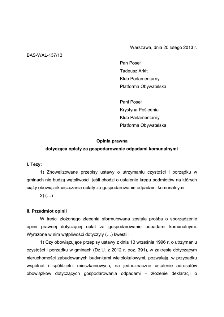 Warszawa, dnia 20 lutego 2013 r. BAS-WAL-137/13 Pan Poseł Tadeusz Arkit Klub Parlamentarny Platforma Obywatelska Pani Poseł Krystyna Poślednia Klub Parlamentarny Platforma Obywatelska Opinia prawna dotycząca opłaty za gospodarowanie odpadami komunalnymi I. Tezy: 1) Znowelizowane przepisy ustawy o utrzymaniu czystości i porządku w gminach nie budzą wątpliwości, jeśli chodzi o ustalenie kręgu podmiotów na których ciąży obowiązek uiszczania opłaty za gospodarowanie odpadami komunalnymi. 2) (…) II. Przedmiot opinii W treści złożonego zlecenia sformułowana została prośba o sporządzenie opinii prawnej dotyczącej opłat za gospodarowanie odpadami komunalnymi. Wyrażone w nim wątpliwości dotyczyły (…) kwestii: 1) Czy obowiązujące przepisy ustawy z dnia 13 września 1996 r. o utrzymaniu czystości i porządku w gminach (Dz.U. z 2012 r. poz. 391), w zakresie dotyczącym nieruchomości zabudowanych budynkami wielolokalowymi, pozwalają, w przypadku wspólnot i spółdzielni mieszkaniowych, na jednoznaczne ustalenie adresatów obowiązków dotyczących gospodarowania odpadami – złożenie deklaracji o wysokości opłaty za gospodarowanie odpadami, uiszczenie tej opłaty, oraz adresatów konsekwencji wynikających z niezłożenia deklaracji, złożenia deklaracji niezgodnej ze stanem faktycznym, nieuiszczenia opłaty lub uiszczenia opłaty w zaniżonej wysokości? 2) (…) Tytułem wstępu zauważyć należy, że dnia 25 stycznia 2013 r., a więc dzień po złożeniu zlecenia, została uchwalona ustawa nowelizująca ustawę o utrzymaniu czystości i porządku w gminach w zakresie dotyczącym właśnie opłaty za gospodarowanie odpadami. 13 lutego 2013 r. została ona podpisana przez Prezydenta. III. Podmioty objęte obowiązkiem uiszczania opłaty za gospodarowanie odpadami Wszystkie obowiązki związane z uiszczaniem opłaty za gospodarowanie odpadami, o których mowa w treści złożonego zlecenia, a które sformułowane zostały w rozdziale 3a ustawy o utrzymaniu czystości i porządku w gminach, obciążają właścicieli nieruchomości. Pojęciu właściciela nieruchomości ustawa przypisuje swoiste znaczenie. Wykracza ono poza treść przypisywaną pojęciu własności przez Kodeks cywilny. Art. 2 ust. 1 pkt 4 ustawy o utrzymaniu czystości i porządku w gminach wskazuje, że ilekroć w ustawie jest mowa o właścicielu nieruchomości rozumie się przez to także współwłaścicieli, użytkowników wieczystych oraz jednostki organizacyjne i osoby posiadające nieruchomości w zarządzie lub użytkowaniu, a także inne podmioty władające nieruchomością. Dodatkowo w art. 2 ust. 3 ustawa stanowi, że w przypadku nieruchomości zabudowanej budynkami wielolokalowymi, w których ustanowiono odrębną własność lokali, obowiązki właściciela nieruchomości obciążają osoby sprawujące zarząd nieruchomością wspólną, w rozumieniu przepisów ustawy z dnia 24 czerwca 1994 r. o własności lokali 1, lub właścicieli lokali, jeżeli zarząd nie został wybrany. W świetle treści art. 2 ustawy o utrzymaniu czystości i porządku w gminach nie budzi wątpliwości, że w budynkach, których właścicielem pozostaje wyłącznie 1 Dz. U. z 2000 r. Nr 80, poz. 903 ze zm. 2 spółdzielnia, to na niej, a nie jej członkach, ciążą obowiązki związane z ponoszeniem opłaty za gospodarowanie odpadami komunalnymi (art. 2 ust. 1 pkt 4). W przypadku, gdy w budynku wyodrębniona została własność niektórych lokali, obowiązki związane z ponoszeniem opłaty za gospodarowanie odpadami komunalnymi ciążą na zarządcy albo właścicielach lokali (art. 2 ust. 3). Stosownie do treści art. 241- 27 ustawy z dnia 15 grudnia 2000 r. o spółdzielniach mieszkaniowych 2 zarząd nieruchomościami wspólnymi stanowiącymi współwłasność spółdzielni jest wykonywany przez spółdzielnię jak zarząd powierzony, o którym mowa w art. 18 ust. 1 ustawy o własności lokali, choćby właściciele lokali nie byli członkami spółdzielni. W takim stanie faktycznym na spółdzielni ciąży obowiązek uiszczania opłaty za gospodarowanie odpadami komunalnymi. Większość właścicieli lokali w budynku lub budynkach położonych w obrębie danej nieruchomości, obliczana według wielkości udziałów w nieruchomości wspólnej, może jednak podjąć uchwałę, że w zakresie ich praw i obowiązków oraz zarządu nieruchomością wspólną będą miały zastosowanie przepisy ustawy z dnia 24 czerwca 1994 r. o własności lokali. Na podstawie art. 18 ust. 1 tej ustawy właściciele mogą powierzyć zarząd nieruchomością wspólną innemu podmiotowi. Podmiot ten będzie zobligowany do uiszczania opłaty za gospodarowanie odpadami komunalnymi. W sytuacji natomiast, gdy w określonym budynku lub budynkach położonych w obrębie danej nieruchomości została wyodrębniona własność wszystkich lokali, po wyodrębnieniu własności ostatniego lokalu stosuje się przepisy ustawy z dnia 24 czerwca 1994 r. o własności lokali, niezależnie od pozostawania przez właścicieli członkami spółdzielni. W takiej sytuacji właściciele mogą swobodnie wybrać podmiot, który będzie sprawował zarząd nieruchomością wspólną (i uiszczał przedmiotową opłatę). Nie jest przy tym wykluczone, że podmiotem tym stanie się spółdzielnia mieszkaniowa, która dotychczas była właścicielem nieruchomości. IV. (…) 2 Dz.U. z 2003 r. Nr 119, poz. 1116 ze zm. 3 V. Podsumowanie Znowelizowane przepisy ustawy o utrzymaniu porządku i czystości w gminach nie budzą wątpliwości, jeśli chodzi o ustalenie kręgu podmiotów na których ciąży obowiązek uiszczania opłaty za gospodarowanie odpadami. (…) Autor: Adam Karczmarek ekspert ds. legislacji w Biurze Analiz Sejmowych Akceptował: Wicedyrektor Biura Analiz Sejmowych Małgorzata Bajor-Stachańczyk 4