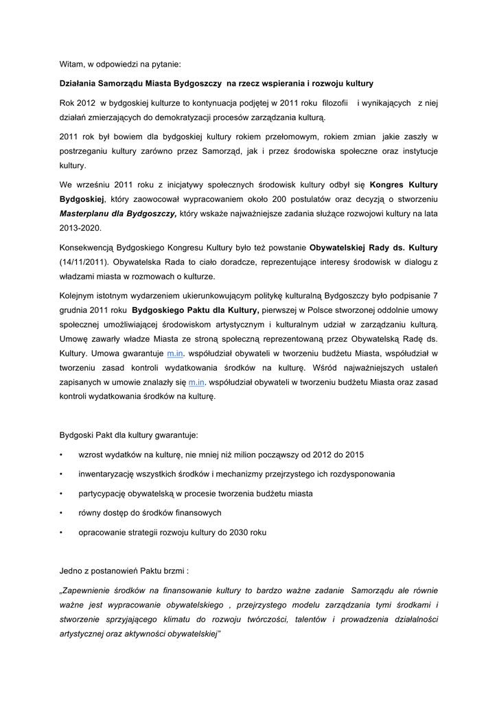 Witam, w odpowiedzi na pytanie: Działania Samorządu Miasta Bydgoszczy na rzecz wspierania i rozwoju kultury Rok 2012 w bydgoskiej kulturze to kontynuacja podjętej w 2011 roku filozofii i wynikających z niej działań zmierzających do demokratyzacji procesów zarządzania kulturą. 2011 rok był bowiem dla bydgoskiej kultury rokiem przełomowym, rokiem zmian jakie zaszły w postrzeganiu kultury zarówno przez Samorząd, jak i przez środowiska społeczne oraz instytucje kultury. We wrześniu 2011 roku z inicjatywy społecznych środowisk kultury odbył się Kongres Kultury Bydgoskiej, który zaowocował wypracowaniem około 200 postulatów oraz decyzją o stworzeniu Masterplanu dla Bydgoszczy, który wskaże najważniejsze zadania służące rozwojowi kultury na lata 2013-2020. Konsekwencją Bydgoskiego Kongresu Kultury było też powstanie Obywatelskiej Rady ds. Kultury (14/11/2011). Obywatelska Rada to ciało doradcze, reprezentujące interesy środowisk w dialogu z władzami miasta w rozmowach o kulturze. Kolejnym istotnym wydarzeniem ukierunkowującym politykę kulturalną Bydgoszczy było podpisanie 7 grudnia 2011 roku Bydgoskiego Paktu dla Kultury, pierwszej w Polsce stworzonej oddolnie umowy społecznej umożliwiającej środowiskom artystycznym i kulturalnym udział w zarządzaniu kulturą. Umowę zawarły władze Miasta ze stroną społeczną reprezentowaną przez Obywatelską Radę ds. Kultury. Umowa gwarantuje m.in. współudział obywateli w tworzeniu budżetu Miasta, współudział w tworzeniu zasad kontroli wydatkowania środków na kulturę. Wśród najważniejszych ustaleń zapisanych w umowie znalazły się m.in. współudział obywateli w tworzeniu budżetu Miasta oraz zasad kontroli wydatkowania środków na kulturę. Bydgoski Pakt dla kultury gwarantuje: • wzrost wydatków na kulturę, nie mniej niż milion począwszy od 2012 do 2015 • inwentaryzację wszystkich środków i mechanizmy przejrzystego ich rozdysponowania • partycypację obywatelską w procesie tworzenia budżetu miasta • równy dostęp do środków finansowych • opracowanie strategii rozwoju kultury do 2030 roku Jedno z postanowień Paktu brzmi : „Zapewnienie środków na finansowanie kultury to bardzo ważne zadanie Samorządu ale równie ważne jest wypracowanie obywatelskiego , przejrzystego modelu zarządzania tymi środkami i stworzenie sprzyjającego klimatu do rozwoju twórczości, talentów i prowadzenia działalności artystycznej oraz aktywności obywatelskiej” Partycypacja społeczna to jedna z najważniejszych zasad jakimi Miasto kieruje się zarówno w tworzeniu jak i realizacji wszystkich przyjętych kierunków polityki kulturalnej. Finansowanie zadań związanych z realizacja polityki kulturalnej Bydgoszczy wytycza Uchwała nr IX/86/95 Rady Miasta Bydgoszczy z dnia 1 marca 1995 roku o mecenacie Miasta nad kulturą i nauką , znowelizowana w 2005 roku oraz regulacje Bydgoskiego Paktu dla Kultury. W 2012 roku , w budżecie Miasta wydatki na kulturę (Dział 921) przewidziano w kwocie ogółem 35 168 365 złotych, z tego : - wydatki bieżące na kwotę 23 694 682 zł - wydatki inwestycyjne na kwotę 11 473 683 zł Budżet Biura Kultury Bydgoskiej w zakresie wydatków bieżących, w stosunku roku 2011 został zwiększony wydatków budżetu Miasta do wykonania o kwotę 2 415 099 złotych. Biorąc pod uwagę zwiększenie na zadania z zakresu ochrony zabytków o 500 000 zł , budżet zwiększono o kwotę 2 915 099 zł ) : · · Wzrosła wysokość dotacji podmiotowych dla instytucji kultury – łącznie o 1 657 972 zł Wzrosła wysokość dotacji na realizację zadań publicznych z zakresu kultury i ochrony dziedzictwa z przeznaczeniem na otwarty konkurs ofert – o 500 000 złotych. W 2011 roku dofinansowano 78 przedsięwzięć organizowanych przez 44 podmioty; w 2012 r. przewiduje się dofinansowanie 100 przedsięwzięć organizowanych przez 57 podmiotów. · Zwiększono kwotę przeznaczoną na stypendia i nagrody – o 207 127 złotych (z 213 412 zł w 2011 roku na 420 539 zł w 2012 r.) Uruchomiono nowe zasady wspierania działań artystycznych indywidualnych twórców kultury poprzez system stypendiów na realizację przedsięwzięć w zakresie twórczości artystycznej oraz upowszechniania kultury (wykonanie dzieła lub realizacja projektu artystycznego). W 2012 roku przeznaczono na realizację tej inicjatywy 300 000 złotych · Zwiększono dotację z budżetu Miasta na pomoc finansową instytucjom kultury dla których organizatorem jest Województwo Kujawsko-Pomorskie – o 50 000 złotych ( z 450 000 w 2011 roku na 500 000 w 2012 r.) . Dotacje otrzymały Filharmonia Pomorska , Opera Nova oraz Wojewódzki Ośrodek Kultury i Sztuki „Stara Ochronka” · W 2012 roku ograniczono wydatki bieżące Biura Kultury Bydgoskiej przeznaczone na indywidualne umowy zlecenia realizowane poza trybem konkursowym i stypendialnym oraz zakupy i usługi Poza wzrostem mechanizmów wydatków bieżących, w 2012 roku podjęto się procesu wdrażania przejrzystego rozdysponowywania środków finansowych z budżetu Miasta na działalność kulturalną. Przedstawiciele Urzędu oraz organizacji pozarządowych tworzyli wspólnie projekty regulaminów otwartych konkursów ofert oraz najważniejszych aktów prawnych z dziedziny kultury, wykorzystując wzajemne doświadczenia w tym zakresie. W kwietniu br. uruchomiono nowe zasady wspierania działań artystycznych indywidualnych twórców kultury poprzez system stypendiów na realizacje przedsięwzięć w zakresie twórczości artystycznej oraz upowszechniania kultury, takich jak wykonanie określonego dzieła lub realizacja projektu artystycznego W I edycji konkursu stypendialnego udzielono wsparcia 37 osobom na kwotę W II edycji konkursu stypendialnego udzielono wsparcia 30 artystom i działaczom kultury. Dzięki wprowadzeniu systemu stypendiów udało się po raz pierwszy w drodze konkursu wesprzeć inicjatywy indywidualnych twórców. Dofinanso