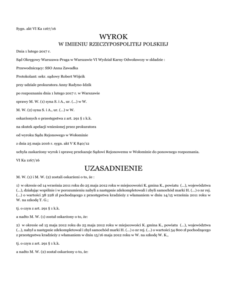 Sygn. akt VI Ka 1167/16 WYROK W IMIENIU RZECZYPOSPOLITEJ POLSKIEJ Dnia 1 lutego 2017 r. Sąd Okręgowy Warszawa-Praga w Warszawie VI Wydział Karny Odwoławczy w składzie : Przewodniczący: SSO Anna Zawadka Protokolant: sekr. sądowy Robert Wójcik przy udziale prokuratora Anny Radyno-Idzik po rozpoznaniu dnia 1 lutego 2017 r. w Warszawie sprawy M. W. (1) syna S. i A., ur. (...) w W. M. W. (2) syna S. i A., ur. (...) w W. oskarżonych o przestępstwa z art. 291 § 1 k.k. na skutek apelacji wniesionej przez prokuratora od wyroku Sądu Rejonowego w Wołominie z dnia 25 maja 2016 r. sygn. akt V K 840/12 uchyla zaskarżony wyrok i sprawę przekazuje Sądowi Rejonowemu w Wołominie do ponownego rozpoznania. VI Ka 1167/16 UZASADNIENIE M. W. (1) i M. W. (2) zostali oskarżeni o to, że : 1) w okresie od 14 września 2011 roku do 25 maja 2012 roku w miejscowości K. gmina K., powiatu (...), województwa (...), działając wspólnie i w porozumieniu nabyli a następnie zdekompletowali i zbyli samochód marki H. (...) o nr rej. (...) o wartości 38 228 zł pochodzącego z przestępstwa kradzieży z włamaniem w dniu 14/15 września 2011 roku w W. na szkodę T. G.; tj. o czyn z art. 291 § 1 k.k. a nadto M. W. (1) został oskarżony o to, że: 2) w okresie od 15 maja 2012 roku do 25 maja 2012 roku w miejscowości K. gmina K., powiatu (...), województwa (...), nabył a następnie zdekompletował i zbył samochód marki H. (...) o nr rej. (...) o wartości 54 800 zł pochodzącego z przestępstwa kradzieży z włamaniem w dniu 15/16 maja 2012 roku w W. na szkodę W. K., tj. o czyn z art. 291 § 1 k.k. a nadto M. W. (2) został oskarżony o to, że: 3) w nieustalonym dniu w okresie od 26 września 2013r. do 1 października 2013r. przy ul. (...) w miejscowości T. powiat (...) woj. (...) pomógł w ukryciu samochodu marki T. (...) o nr rej. (...) o wartości 34.418 zł pochodzącego z przestępstwa kradzieży z włamaniem w dniach 26/27 września 2013r. przy ul. (...) w W. na szkodę Z. N., tj. o czyn z art. 291 § 1 k.k. Sąd Rejonowy w Wołominie wyrokiem z dnia 25 maja 2016r. sygn. akt V K 840/12 : I. oskarżonego M. W. (1) uniewinnił od popełnienia obu zarzucanych mu czynów; II. oskarżonego M. W. (2) uniewinnił od popełnienia pierwszego z zarzucanych mu czynów; III. w ramach drugiego z zarzucanych oskarżonemu M. W. (2) czynów uznał go za winnego tego, że w nieustalonym dniu w okresie od 26 września 2013r. do 1 października 2013r. przy ul. (...) w miejscowości T. powiat (...) woj. (...) pomógł w ukryciu samochodu marki T. (...) o nr rej. (...) o wartości 34.418 zł pochodzącego z przestępstwa kradzieży z włamaniem w dniach 26/27 września 2013r. przy ul.(...) w W. na szkodę Z. N. przy czym na podstawie towarzyszących okoliczności powinien i mógł przypuszczać, że został on uzyskany za pomocą czynu zabronionego, a tak przypisany czyn stanowi występek określony w art. 292 § 1 kk i na mocy art. 66 § 1 i 2 kk i art. 67 § 1 kk w zw. z art. 4 § 1 kk postępowanie karne w zakresie tego czynu wobec M. W. (2) umorzył warunkowo na okres 1 (jednego) roku próby; IV. na mocy art. 230 § 2 kpk nakazał zwrócić M. W. (1) dowód rzeczowy w postaci części pociętych i wypalonych tablic rejestracyjnych wymienionych w wykazie dowodów rzeczowych nr 1/53/12 pod poz. 22; V. na mocy art. 230 § 2 kpk nakazuje zwrócić (...) ul. (...), (...) W., dowód rzeczowy w postaci szyby samochodowej samochodu o nr rej. (...) wymieniony w wykazie dowodów rzeczowych nr 1/53/12 pod poz. 43; VI. na mocy art. 230 § 2 kpk nakazał zwrócić M. W. (2) dowód rzeczowy w postaci pary rękawiczek wymieniony w wykazie dowodów rzeczowych nr 1/79/13 pod poz. 46; VII. zasądził od Skarbu Państwa na rzecz M. W. (1) kwotę 1170 zł tytułem zwrotu kosztów związanych z ustanowieniem obrońcy z wyboru; VIII. zasądził od oskarżonego M. W. (2) na rzecz Skarbu Państwa kwotę 633,57 zł tytułem kosztów sądowych w tym 100 zł opłaty; IX. kosztami postępowania w części uniewinniającej obciążył Skarb Państwa. Apelację od wyroku złożył Prokurator, który zaskarżył wyrok w całości na niekorzyść oskarżonych. Na podstawie art. 438 pkt 2 i 3 kpk wyrokowi temu zarzucił: - obrazę przepisów postępowania tj. art. 4 kpk, art. 7 kpk, 167 kpk, 366 kpk, 410 kpk polegającą na dowolnej ocenie dowodów mających istotne znaczenie dla rozstrzygnięcia sprawy, w tym przede wszystkim wyjaśnień oskarżonego M. W. (1), pominięcie istotnych okoliczności niekorzystnych dla oskarżonych oraz wadliwą ocenę tych dowodów, co miało wpływ na treść wyroku i w konsekwencji doprowadziło Sąd do błędnych ustaleń faktycznych oraz spowodowało niesłuszne uniewinnienie oskarżonych od popełnienia zarzucanych im czynów, podczas gdy analiza całokształtu ustalonych okoliczności oraz swobodna, a nie dowolna ocena dowodów pozwala na wyrażenie poglądu, iż oskarżony M. W. (1) dopuścił się popełnienia obydwu zarzucanych mu czynów z art.291 § 1 kk, zaś oskarżony M. W. (2) dopuścił się czynu z art.291 § 1 kk, od którego został uniewinniony; - błąd w ustaleniach faktycznych przyjętych za podstawę orzeczenia mogący mieć wpływ na treść tego orzeczenia, a polegający na przyjęciu, iż czyn z art.292 § 1 kk przypisany oskarżonemu M. W. (2) spełnia kryteria określone w art. 66 § 1 kk, pozwalające na warunkowe umorzenie postępowania, podczas gdy stopień zawinienia oraz wysoka społeczna szkodliwość przypisanego czynu wskazuje na niemożność warunkowego umorzenia postępowania, zaś zasadnym byłoby orzeczenie kary pozbawienia wolności z warunkowym zawieszeniem jej wykonania. W konkluzji Prokurator wnosił o uchylenie wyroku i przekazanie sprawy do ponownego rozpoznania Sądowi Rejonowemu w Wołominie. Sąd Okręgowy zważył, co następuje. Apelacja prokuratora, a tym samym zawarty w niej wniosek o uchylenie zaskarżonego wyroku co do oskarżonych M. W. (1) oraz M