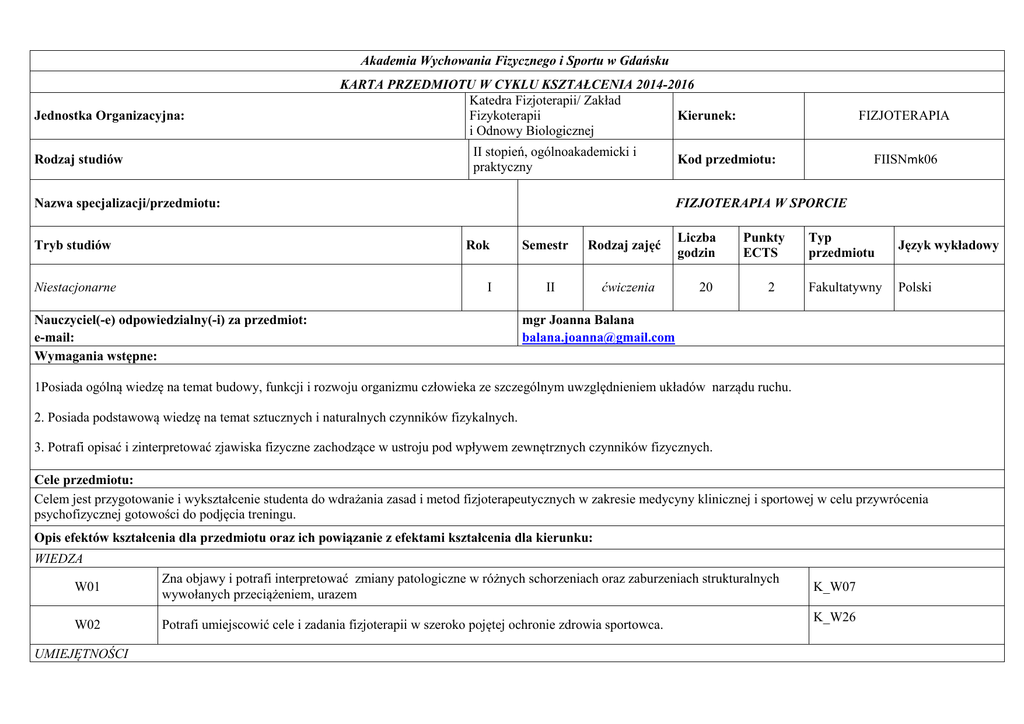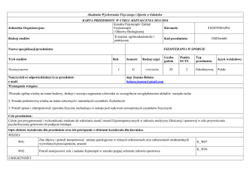Akademia Wychowania Fizycznego i Sportu w Gdańsku Jednostka Organizacyjna: KARTA PRZEDMIOTU W CYKLU KSZTAŁCENIA 2014-2016 Katedra Fizjoterapii/ Zakład Fizykoterapii Kierunek: i Odnowy Biologicznej II stopień, ogólnoakademicki i praktyczny Rodzaj studiów Nazwa specjalizacji/przedmiotu: Tryb studiów FIISNmk06 Kod przedmiotu: FIZJOTERAPIA W SPORCIE Rok Niestacjonarne FIZJOTERAPIA I Nauczyciel(-e) odpowiedzialny(-i) za przedmiot: e-mail: Wymagania wstępne: Semestr Rodzaj zajęć II ćwiczenia Liczba godzin 20 Punkty ECTS 2 Typ przedmiotu Język wykładowy Fakultatywny Polski mgr Joanna Balana [email protected] 1Posiada ogólną wiedzę na temat budowy, funkcji i rozwoju organizmu człowieka ze szczególnym uwzględnieniem układów narządu ruchu. 2. Posiada podstawową wiedzę na temat sztucznych i naturalnych czynników fizykalnych. 3. Potrafi opisać i zinterpretować zjawiska fizyczne zachodzące w ustroju pod wpływem zewnętrznych czynników fizycznych. Cele przedmiotu: Celem jest przygotowanie i wykształcenie studenta do wdrażania zasad i metod fizjoterapeutycznych w zakresie medycyny klinicznej i sportowej w celu przywrócenia psychofizycznej gotowości do podjęcia treningu. Opis efektów kształcenia dla przedmiotu oraz ich powiązanie z efektami kształcenia dla kierunku: WIEDZA W01 Zna objawy i potrafi interpretować zmiany patologiczne w różnych schorzeniach oraz zaburzeniach strukturalnych wywołanych przeciążeniem, urazem W02 Potrafi umiejscowić cele i zadania fizjoterapii w szeroko pojętej ochronie zdrowia sportowca. UMIEJĘTNOŚCI K_W07 K_W26 U01 Potrafi tworzyć, weryfikować i modyfikować program usprawniania sportowców u w szeroko pojętej ochronie zdrowia sportowca K_U08 U02 Potrafi identyfikować problemy zawodnika oraz grupy sportowej w zakresie odnowy biologicznej z wykorzystaniem fizjoterapeutycznych metod oddziaływania K_U04 K01 Potrafi określić priorytety i przestrzegać zasad etycznych w decyzjach i działaniach podejmowanych w stosunku do sportowca K_K06 K02 Potrafi propagować i aktywnie kreować zdrowy styl życia Promuje zachowania zdrowotne w działalności edukacyjnej i środowisku lokalnym sportowców K_K10, K_K11 KOMPETENCJE Kryteria i metody oceny osiągniętych efektów kształcenia I. PISEMNE ZALICZENIE TEORETYCZNE (test wyboru): W01, W02, 3.0 3.5 4.0 4.5 5.0 -Wykazał się wiedzą i prawidłowo odpowiedział na min 60-69% zakresu pytań w teście -Wykazał się wiedzą i prawidłowo odpowiedział na min 70-79 % zakresu pytań w teście -Wykazał się wiedzą i prawidłowo odpowiedział na min 80-84 % zakresu pytań w teście -Wykazał się wiedzą i prawidłowo odpowiedział na min 85-89 % zakresu pytań w teście -Wykazał się wiedzą i prawidłowo odpowiedział na min 90-100 % zakresu pytań w teście II. Przygotowanie i prezentacja artykułu naukowego z zakresu fizjoterapeutycznych metod oddziaływania w sporcie - kryterium oceny : ocena eksperta przygotowania studenta z danej tematyki, poprawność merytoryczna i językowa (U01, U02, K01, K02,) Aby uzyskać zaliczenie przedmiotu na ocenę dostateczną student musi osiągnąć wszystkie wymienione przedmiotowe efekty kształcenia. Metody i formy realizacji przedmiotu: Ćwiczenia praktyczne: praca w grupach, analizowanie przypadków, demonstrowanie i instruowania – odgrywanie ról sportowiec-terapeuta, trening wybranych metod fizjoterapii w sporcie, prezentacja artykułów naukowych Treści kształcenia: Ćwiczenia: Definicje odnowy biologicznej, cele i zadania. Metody i środki odnowy biologicznej. Zasady stosowania odnowy biologicznej. Typowe urazy w sporcie, zasady postępowania Podstawy teorii sportu (cel treningu, struktura rzeczowa, struktura czasowa). Fizjologiczne podstawy wysiłku fizycznego (klasyfikacja wysiłków fizycznych, zmęczenie). Zespół przetrenowania (rodzaje, skutki, objawy, profilaktyka). Zastosowania bodźców fizykalnych w sporcie – sauna sucha, krioterapia, hydroterapia w procesie treningowym. Masaż sportowy, cel i zadania, mechanizm działania. Masaż profilaktyczno – leczniczy stosowany w odnowie biologicznej. Ocena funkcjonalna zawodnika. Sportowy trening wzmacniający po urazach sportowych. Taping w profilaktyce i leczeniu schorzeń i urazów narządu ruchu u sportowców. Zaliczenie z oceną Forma zaliczenia: Literatura: Podstawowa: 1. Barszowski P., (2000): Wspomaganie procesu treningowego. Warszawa: COS. 2. Donatelii R., (2007): Rehabilitacja w sporcie. Warszawa: Wyd.ELSEVIER 3. Dziak A Tayara S.(2000): Urazy i uszkodzenia w sporcie, Warszawa: Wyd. Kasper 4. Gieremek K., Dec L.(2007): Zmęczenie i regeneracja sił. Odnowa biologiczna. Katowice: P.H. HAS-MED. 5. Jethon J.(1982): Fizjologiczne podstawy odnowy biologicznej w sporcie. Poradnik dla trenera. Warszawa: Instytut Sportu 6. Kolster B., Ebett – Paprotny G.( 2001): Poradnik fizjoterapeuty. Wrocław: Wyd. im. Ossolińskich 7. Magiera L. Walaszek R, (2003): Masaż sportowy z elementami odnowy biologicznej. Kraków: Wyd. Biosport. 8. Podgórski T. (1989): Masaż w rehabilitacji i sporcie. Warszawa: Wyd. AWF. 9. Ronikier A. (2008): Fizjologia wysiłku w sporcie, fizjoterapii i rekreacji, Warszawa: Wyd. COS 10. Straburzyńska-Lupa A., Straburzyński G. (2008): Fizjoterapia z elementami klinicznymi. Warszawa: Wyd. Lek. PZWL. Uzupełniająca: McMahon P.:(2008): Medycyna sportowa. Współczesne metody diagnostyki i leczenia, Warszawa: Wyd. Lek. PZWL. Scmidt R, WrisbergC. (2009): Czynności ruchowe człowieka, Warszawa: Wyd. COS Bomba T., Haff G.(2010): Periodyzacja teoria i metodyka treningu, Warszawa,: Wyd. COS Czasopisma Medina Sportiva, Sport Wyczynowy, Rehabilitacja Medyczna, Rehabilitacja w Praktyce, Fizjoterapia, Postępy Rehabilitacji, Praktyczna Fizjoterapia i Rehabilitacja Bilans punktów ECTS (1 pkt ECTS – 25-30 godz. pracy studenta): Aktywność Obciążenie studenta Udział w ćwiczeniach 20 godz. Przygotowanie się do ćwiczeń 15 godz. Przygotowanie prezentacji artykułu na