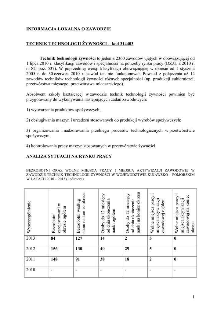 INFORMACJA LOKALNA O ZAWODZIE TECHNIK TECHNOLOGII ŻYWNOŚCI - kod 314403 Technik technologii żywności to jeden z 2360 zawodów ujętych w obowiązującej od 1 lipca 2010 r. klasyfikacji zawodów i specjalności na potrzeby rynku pracy (DZ.U. z 2010 r. nr 82, poz. 537). W poprzedniej wersji klasyfikacji obowiązującej w okresie od 1 stycznia 2005 r. do 30 czerwca 2010 r. zawód ten nie funkcjonował. Powstał z połączenia aż 14 zawodów techników technologii żywności różnych specjalności (np. produkcji cukierniczej, przetwórstwa mięsnego, przetwórstwa mleczarskiego). Absolwent szkoły kształcącej w zawodzie technik technologii żywności powinien być przygotowany do wykonywania następujących zadań zawodowych: 1) wytwarzania produktów spożywczych; 2) obsługiwania maszyn i urządzeń stosowanych do produkcji wyrobów spożywczych; 3) organizowania i nadzorowania przebiegu procesów technologicznych w przetwórstwie spożywczym; 4) kontrolowania pracy maszyn stosowanych w przetwórstwie żywności. ANALIZA SYTUACJI NA RYNKU PRACY Wyszczególnienie Bezrobotni zarejestrowani w okresie ogółem Bezrobotni według stanu na koniec okresu Osoby do 12 miesięcy od dnia ukończenia nauki ogółem Osoby do 12 miesięcy od dnia ukończenia nauki na koniec okresu Wolne miejsca pracy i miejsca aktywizacji zawodowej ogółem Wolne miejsca pracy i miejsca aktywizacji zawodowej na koniec okresu BEZROBOTNI ORAZ WOLNE MIEJSCA PRACY I MIEJSCA AKTYWIZACJI ZAWODOWEJ W ZAWODZIE TECHNIK TECHNOLOGII ŻYWNOŚCI W WOJEWÓDZTWIE KUJAWSKO – POMORSKIM W LATACH 2010 – 2013 (I półrocze) 2013 84 127 14 2 5 0 2012 156 130 40 29 5 0 2011 148 91 38 18 2 0 2010 - - - - - - 1 W I półroczu 2013 roku na jedną ofertę pracy przypadało 16,8 bezrobotnych zarejestrowanych w tym okresie. W roku 2012 na jedną ofertę przypadało 31,2 bezrobotnych, w 2011 roku na jedną ofertę przypadało 74,0 bezrobotnych zarejestrowanych w okresie. W 2010 roku zawód o nazwie technik technologii żywności nie funkcjonował. Większa liczba nowych rejestracji bezrobotnych niż zgłoszonych wolnych miejsc pracy lub aktywizacji zawodowej spowodowała, że w latach 2011 i 2012 zawód ten został sklasyfikowany jako zawód nadwyżkowy1, tzn. taki, na który na rynku pracy istnieje mniejsze zapotrzebowanie niż liczba osób poszukujących pracy w tym zawodzie. WYNIKI BADAŃ PRACODAWCÓW2 W badaniach ankietowych pracodawców w latach 2012 i 2011, pracodawcy nie zgłaszali planów zatrudnienia lub zwolnienia osób w zawodzie technik technologii żywności. WYNIKI BADAŃ USŁUG SZKOLENIOWYCH W latach 2010/11/12 ani Powiatowe Urzędy Pracy ani instytucje szkoleniowe nie planowały i nie organizowały szkoleń lub kursów o tematyce związanej z zawodem technika technologii żywności Adres do Rejestru Instytucji Szkoleniowych : http//ris.praca.gov.pl/ris/index.ftl ANALIZA KSZTAŁCENIA W ZAWODZIE, OFERTA KSZTAŁCENIA – SYSTEM OŚWIATY SZKOLNEJ I POZASZKOLNEJ Wg danych pochodzących z Systemu Informacji Oświatowej udostępnianych przez Centrum Informatyczne Edukacji na stronie www.cie.men.gov.pl w województwie kujawskopomorskim zawód ten można zdobyć w 11 szkołach, wyłącznie w technikach publicznych. Z tego 4 szkoły posiadają status techników uzupełniających, a więc szkół, których działalność jest wygaszana, zgodnie z obowiązującymi przepisami, tzn. , m.in. , że nie przeprowadza się do nich naboru. Z danych uzyskanych z Systemu Informacji Oświatowej w roku szkolnym 2011/2012 w województwie kujawsko - pomorskim w zawodzie technik technologii żywności ukończyło naukę 188 osób. Na dzień 30 września 2012 roku naukę w tych samych szkołach kontynuowało jeszcze 737 osób. 1 Podziału na zawody deficytowe, zrównoważone i nadwyżkowe dokonuje się na podstawie wskaźnika intensywności nadwyżki (deficytu) wyrażonego jako iloraz liczby zgłoszonych wolnych miejsc pracy i miejsc aktywizacji zawodowej w badanym okresie, w danym zawodzie i liczby zarejestrowanych bezrobotnych w badanym okresie, w danym zawodzie. Zawody deficytowe to takie, dla których wskaźnik przekracza wartość 1,1; zawody zrównoważone to te, dla których wartość wskaźnika mieści się w przedziale od 0,9 do 1,1; natomiast zawody nadwyżkowe to te, w których przypadku wskaźnik wynosi poniżej 0,9. 2 Badanie 2000 pracodawców jest realizowane w ramach projektu WUP Rynek Pracy pod Lupą. Raport z badania pracodawców w 2010, 2011 i 2012 r. znajduje się na stronie internetowej WUP. 2 W roku szkolnym 2010/2011 w województwie kujawsko - pomorskim w zawodzie technik technologii żywności ukończyło naukę 208 osób. Na dzień 30 września 2011 roku naukę w tych samych szkołach kontynuowały jeszcze 752 osoby . Z kolei w roku szkolnym 2009/2010 w województwie kujawsko - pomorskim w zawodzie technik technologii żywności ukończyło naukę 175 osób. Na dzień 30 września 2010 roku naukę w tych samych szkołach kontynuowały jeszcze 863 osoby. Rozporządzenie Ministra Edukacji Narodowej z dnia 23 grudnia 2011 roku w sprawie klasyfikacji zawodów szkolnictwa zawodowego określa, że zawód technik technologii żywności od 1 września 2012 roku można zdobyć w 4-letnim technikum oraz na kwalifikacyjnych kursach zawodowych . Kwalifikacyjny kurs zawodowy to kurs prowadzony według programu nauczania uwzględniającego podstawę programową kształcenia w zawodach w zakresie jednej kwalifikacji. Minimalna liczba godzin kształcenia na tym kursie jest równa minimalnej liczbie godzin kształcenia zawodowego określonej w podstawie programowej kształcenia w zawodach dla danej kwalifikacji. W ramach różnych zawodów wyodrębniono poszczególne kwalifikacje, z których każda obejmuje określony zasób wiedzy, umiejętności zawodowych oraz kompetencji personalnych i społecznych, opisanych w podstawie programowej kształcenia w zawodach. Podmiot prowadzący kwalifikacyjny kurs zawodowy jest obowiązany uwzględnić w 