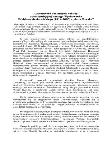Uroczystość odsłonięcia tablicy upamiętniającej naszego Wychowanka Zdzisława Jeziorańskiego (1914-2005) - „Jana Nowaka” słynnego „Kuriera z Warszawy”. W związku z przypadającym w tym roku 100-leciem jego urodzin, Senat RP ogłosił rok 2014 Rokiem Jana Nowaka Jeziorańskiego. Uroczystość, która odbyła się 19 listopada 2014 r. w naszym Liceum była jednym z elementów honorowania naszego maturzysty z 1932 r. - wybitnego Polaka. W sali gimnastycznej Liceum gdzie zebrali się przedstawiciele poszczególnych klas odbyły się uroczystości poprzedzające odsłonięcie tablicy pamiątkowej Zdzisława Jeziorańskiego. Uroczystości zaszczycili obecnością marszałek Senatu RP Bogdan Borusewicz, senator Aleksander Świeykowski, przyjaciel rodziny mecenas Jacek Taylor (przyjechał z Gdańska), burmistrz Pragi Płd. Jarosław Karcz. Obecni byli także Członkowie Honorowi Stowarzyszenia: b.dyrektor - Barbara Taff i Danuta Kais oraz historiograf Szkoły Ryszard Pasternak. Były reprezentowane władze oświatowe dzielnicy oraz dyrekcje zaprzyjaźnionych szkół. Z grona pedagogicznego zapadli w pamięć historycy: wicedyrektor Kamila Załuska, Tadeusz Bąk i Krzysztof Kotwicki, silnie zaangażowani w oprawę uroczystości. Stowarzyszenie reprezentowali prezes Andrzej Niemierko, wiceprezes Janusz Brodowski, sekretarz Jerzy Kalinowski, skarbnik Andrzej Wlazłowski i Janusz Hancke oraz grono Wychowanków z Piotrem Korolkiewiczem (r.mat.1959) na czele, który przyjechał z Uppsali (Szwecja). Był on także autorem zdjęć, które dołączamy do tego tekstu. Uroczystość rozpoczęło wystąpienie dyrektor Liceum Marzenny Zaworskiej, po czym głos zabrał prezes Stowarzyszenia Wychowanków Andrzej Niemierko (tekst wystąpienia w załączeniu). Wystąpienia gości otworzył senator Aleksander Świeykowski, który kiedyś pracował w Radiu Wolna Europa, a następnie Jacek Taylor (pod kierunkiem jego ojca Jeziorański studiował ekonomię w Poznaniu) oraz burmistrz Jarosław Karcz. Część artystyczna słowno-muzyczna w wykonaniu odwoływała się do fragmentów życia Jeziorańskiego. żywiołowym aplauzem, co było niemałą zasługą Krzysztofa którego kierunkiem ten program był przygotowywany. W salę dotarł marszałek Borusewicz. uczniów Liceum Spotkała się z Kotwickiego, pod międzyczasie na Po programie artystycznym nastąpiło odsłonięcie tablicy, ufundowanej przez Stowarzyszenie i wykonanej dzięki niestrudzonym zabiegom naszego kolegi Janusza Hancke. Odsłonięcia tablicy dokonał marszałek Borusewicz w towarzystwie senatora Świeykowskiego i mecenasa Taylora. Marszałek Senatu i prezes Stowarzyszenia w kilku słowach podsumowali uroczystość. Nasępnie goście przeszli do bocznego korytarza, w którym nastąpiło otwarcie okolicznościowej wystawy „Nauczyciel i uczeń”. Pomysłodawcą była wicedyrektor Kamila Załuska, a materiały archiwalne wraz z opisami przekazało Stowarzyszenie Wychowanków. Obejmowały one zdjęcia z czasów nauczyciela matematyki „Jasia” Wysockiego - ulubieńca uczniów Szkoły Konopczyńskiego a potem Mickiewicza, wspominanego też w „Kurierze z Warszawy” oraz Zdzisława Jeziorańskiego - jego ucznia. Uroczystości zakończyło spotkanie przy kawie. * * * Wystąpienie prezesa Stowarzyszenia Wychowanków Andrzeja Niemierko: Primus inter pares Nasza Szkoła może poszczycić się wieloma wybitnymi Wychowankami. Przy różnych okazjach chwalimy się nimi - bo to podnosi prestiż tego przybytku oświaty szkolnej - jak określano ją kiedyś za czasów Szkoły Emiliana Konopczyńskiego. Wśród tych wybitnych Wychowanków wyróżnia się jeden - Zdzisław Jeziorański. Bardziej znany jako Jan Nowak-Jeziorański, bo pod takim nazwiskiem wszedł do historii, ale także znany jako Zdziś - bo tak zwracali się do Niego koledzy. Primus inter pares - można powiedzieć - pierwszy wśród równych sobie. Jego zasługi dla Polski są powszechnie znane. Był Wielkim Polakiem, Autorytetem Narodu Polskiego. Odważnie i nieustępliwie walczył o pozycję Polski w świecie w trudnym okresie historii naszej Ojczyzny. Powtarzał często: „Zawsze czułem, że los mego kraju jest związany z moim losem”. A w jednym z ostatnich wywiadów wyznał, że „swego życia nie zmieniłbym na żadne inne”. W Szkole zapamiętaliśmy Go jako serdecznego „starszego Kolegę”, który często dawał dowody niezwykłego przywiązania i pamięci do Swej - jak mawiał - „starej, kochanej budy na Sewerynówku”. Pisał o tym zresztą nie tylko w słynnym pamiętniku „Kurierze z Warszawy” ale i w listach, które kierował do nas z dalekiego Annandale pod Waszyngtonem. Dziękował w nich za wydawanie naszego biuletynu pt. „Komunikat”, który jak pisał „czytał z wielkim sentymentem i zainteresowaniem”. Do Gimnazjum im. Adama Mickiewicza wstąpił wraz z Ryszardem Matuszewskim w 1927 r. po 3 klasach w Gimnazjum Batorego. Postanowienie o ich przeniesieniu spowodowane było tym, że „Mickiewicz” był nastawiony bardziej na przedmioty humanistyczne, a „Batory” na matematyczno-przyrodnicze. Poza tym, podobno „Mickiewiczu” obowiązywały mniejsze rygory. w tym czasie w Zaczytywał się w „Trylogii” Sienkiewicza. W „Kurierze z Warszawy” (wydanie z 1993 r.) pisał: „Sienkiewiczowi mam do zawdzięczenia, że znalazłem się wśród „gorszych” i przeniesiony zostałem do Gimnazjum Adama Mickiewicza dawniej Konopczyńskiego. Nie było chyba w Warszawie innej szkoły o takich tradycjach.” I dalej wspomina kilku Swoich nauczycieli m.in. „uwielbianego przez młodzież wychowawcę naszej klasy, matematyka Jana Wysockiego - „Jasia” jak go pieszczotliwie nazywano”, a także dyrektora Jana Juraszyńskiego, polonistów Jana Zakrzewskiego i Romualda Mańkowskiego, historyka Zdzisława Wilusza. Wspomina wielu wychowanków jak Stefana Starzyńskiego, Leszka Serafinowicza (Jana Lechonia), Adama Rapackiego, a także kolegów 
