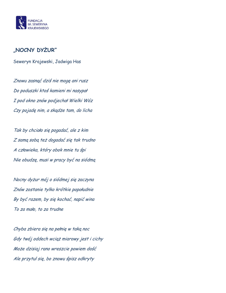 „NOCNY DYŻUR” Seweryn Krajewski, Jadwiga Has Znowu zasnąć dziś nie mogę ani rusz Do poduszki ktoś kamieni mi nasypał I pod okno znów podjechał Wielki Wóz Czy pojadę nim, a skądże tam, do licha Tak by chciało się pogadać, ale z kim Z samą sobą też dogadać się tak trudno A człowieka, który obok mnie tu śpi Nie obudzę, musi w pracy być na siódmą Nocny dyżur mój o siódmej się zaczyna Znów zostanie tylko krótkie popołudnie By być razem, by się kochać, napić wina To za mało, to za trudne Chyba zbiera się na pełnię w taką noc Gdy twój oddech wciąż miarowy jest i cichy Może dzisiaj rano wreszcie powiem dość Ale przytul się, bo znowu śpisz odkryty A tym czasem w okno znów zagląda świt I zdążyłam już wygładzić kształt kamieni W tej poduszce którą dzielisz ze mną ty W noc bezsenną, tu na ziemi Znam te drogę przez układy planetarne W chmury, bzdury i marzenia w nieskończoność Trzeba znaleźć, tu na ziemi swoją prawdę Nawet gorzką, nawet słoną A tym czasem w okno znów zagląda świt I zdążyłam już wygładzić kształt kamieni W tej poduszce, którą dzielisz ze mną ty W noc bezsenną, tu na ziemi Znam te drogę przez układy planetarne W chmury, bzdury i marzenia w nieskończoność Trzeba znaleźć, tu na ziemi swoją prawdę Nawet gorzką, nawet słoną A tym czasem w okno znów zagląda świt I zdążyłam już wygładzić kształt kamieni W tej poduszce, którą dzielisz ze mną ty W noc bezsenną, tu na ziemi