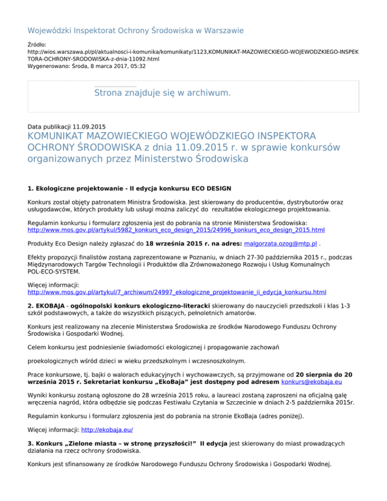Wojewódzki Inspektorat Ochrony Środowiska w Warszawie Źródło: http://wios.warszawa.pl/pl/aktualnosci-i-komunika/komunikaty/1123,KOMUNIKAT-MAZOWIECKIEGO-WOJEWODZKIEGO-INSPEK TORA-OCHRONY-SRODOWISKA-z-dnia-11092.html Wygenerowano: Środa, 8 marca 2017, 05:32 Strona znajduje się w archiwum. Data publikacji 11.09.2015 KOMUNIKAT MAZOWIECKIEGO WOJEWÓDZKIEGO INSPEKTORA OCHRONY ŚRODOWISKA z dnia 11.09.2015 r. w sprawie konkursów organizowanych przez Ministerstwo Środowiska 1. Ekologiczne projektowanie - II edycja konkursu ECO DESIGN Konkurs został objęty patronatem Ministra Środowiska. Jest skierowany do producentów, dystrybutorów oraz usługodawców, których produkty lub usługi można zaliczyć do rezultatów ekologicznego projektowania. Regulamin konkursu i formularz zgłoszenia jest do pobrania na stronie Ministerstwa Środowiska: http://www.mos.gov.pl/artykul/5982_konkurs_eco_design_2015/24996_konkurs_eco_design_2015.html Produkty Eco Design należy zgłaszać do 18 września 2015 r. na adres: [email protected] . Efekty propozycji finalistów zostaną zaprezentowane w Poznaniu, w dniach 27-30 października 2015 r., podczas Międzynarodowych Targów Technologii i Produktów dla Zrównoważonego Rozwoju i Usług Komunalnych POL-ECO-SYSTEM. Więcej informacji: http://www.mos.gov.pl/artykul/7_archiwum/24997_ekologiczne_projektowanie_ii_edycja_konkursu.html 2. EKOBAJA - ogólnopolski konkurs ekologiczno-literacki skierowany do nauczycieli przedszkoli i klas 1-3 szkół podstawowych, a także do wszystkich piszących, pełnoletnich amatorów. Konkurs jest realizowany na zlecenie Ministerstwa Środowiska ze środków Narodowego Funduszu Ochrony Środowiska i Gospodarki Wodnej. Celem konkursu jest podniesienie świadomości ekologicznej i propagowanie zachowań proekologicznych wśród dzieci w wieku przedszkolnym i wczesnoszkolnym. Prace konkursowe, tj. bajki o walorach edukacyjnych i wychowawczych, są przyjmowane od 20 sierpnia do 20 września 2015 r. Sekretariat konkursu „EkoBaja” jest dostępny pod adresem [email protected] Wyniki konkursu zostaną ogłoszone do 28 września 2015 roku, a laureaci zostaną zaproszeni na oficjalną galę wręczenia nagród, która odbędzie się podczas Festiwalu Czytania w Szczecinie w dniach 2-5 października 2015r. Regulamin konkursu i formularz zgłoszenia jest do pobrania na stronie EkoBaja (adres poniżej). Więcej informacji: http://ekobaja.eu/ 3. Konkurs „Zielone miasta – w stronę przyszłości!” II edycja jest skierowany do miast prowadzących działania na rzecz ochrony środowiska. Konkurs jest sfinansowany ze środków Narodowego Funduszu Ochrony Środowiska i Gospodarki Wodnej. Celem konkursu jest upowszechnianie nowoczesnej i proekologicznej polityki miejskiej w zgodzie z zasadami sozologii planistycznej, a także promowanie działań zmierzających do zrównoważonego rozwoju miast. Uczestnikami mogą być miasta na prawach powiatu i gminy miejskie, których przedsięwzięcia lub inwestycje rozpoczęły się nie wcześniej niż w 2006 r., a zakończyły co najmniej 1 miesiąc przed złożeniem wniosku konkursowego. Termin składania wniosków konkursowych upływa 12 października 2015 r. Dokumenty należy przesłać w wersji elektronicznej, skanem na adres: [email protected] Oficjalne ogłoszenie wyników nastąpi 27 października 2015 r. Regulamin konkursu i formularz wniosku konkursowego są do pobrania na stronie „Zielone miasta” w zakładce „Zgłoszenia” (adres poniżej). Więcej informacji: http://zielonemiasta.eu/ Data publikacji 11.09.2015 Data modyfikacji 11.09.2015Rejestr zmian Liczba wizyt: 471 Autor: Iwona Kalinowska-Witowska Opublikowane przez Ewa Pacholska