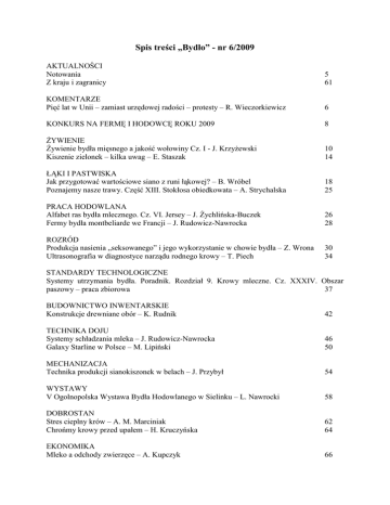 Spis treści „Bydło” - nr 6/2009 AKTUALNOŚCI Notowania Z kraju i zagranicy 5 61 KOMENTARZE Pięć lat w Unii – zamiast urzędowej radości – protesty – R. Wieczorkiewicz 6 KONKURS NA FERMĘ I HODOWCĘ ROKU 2009 8 śYWIENIE śywienie bydła mięsnego a jakość wołowiny Cz. I - J. KrzyŜewski Kiszenie zielonek – kilka uwag – E. Staszak 10 14 ŁĄKI I PASTWISKA Jak przygotować wartościowe siano z runi łąkowej? – B. Wróbel Poznajemy nasze trawy. Część XIII. Stokłosa obiedkowata – A. Strychalska 18 25 PRACA HODOWLANA Alfabet ras bydła mlecznego. Cz. VI. Jersey – J. śychlińska-Buczek Fermy bydła montbeliarde we Francji – J. Rudowicz-Nawrocka 26 28 ROZRÓD Produkcja nasienia „seksowanego” i jego wykorzystanie w chowie bydła – Z. Wrona Ultrasonografia w diagnostyce narządu rodnego krowy – T. Piech 30 34 STANDARDY TECHNOLOGICZNE Systemy utrzymania bydła. Poradnik. Rozdział 9. Krowy mleczne. Cz. XXXIV. Obszar paszowy – praca zbiorowa 37 BUDOWNICTWO INWENTARSKIE Konstrukcje drewniane obór – K. Rudnik 42 TECHNIKA DOJU Systemy schładzania mleka – J. Rudowicz-Nawrocka Galaxy Starline w Polsce – M. Lipiński 46 50 MECHANIZACJA Technika produkcji sianokiszonek w belach – J. Przybył 54 WYSTAWY V Ogolnopolska Wystawa Bydła Hodowlanego w Sielinku – L. Nawrocki 58 DOBROSTAN Stres cieplny krów – A. M. Marciniak Chrońmy krowy przed upałem – H. Kruczyńska 62 64 EKONOMIKA Mleko a odchody zwierzęce – A. Kupczyk 66 WETERYNARIA Higiena przychówka u bydła – B. Pilarczyk Ochrona bydła przed muchami i gzami bydlęcymi – S. Ignatowicz Pleśniakowiec lśniący – jego szkodliwość i zwalczanie - S. Ignatowicz Jak poprawić odporność cieląt? - K. Kotowski 69 72 78 82 PRZEPISY KULINARNE Szaszłyki mięsne z pikantnym sosem – R. Chojnacka 86 Na okładce: Cieliczka rasy jersey ze swoim opiekunem Bartoszem Matuszczakiem i jego siostrą, Katarzyną – Rusocin, woj. wielkopolskie Projekt okładki: Katarzyna DroŜdŜyńska Fot. Lech Nawrocki