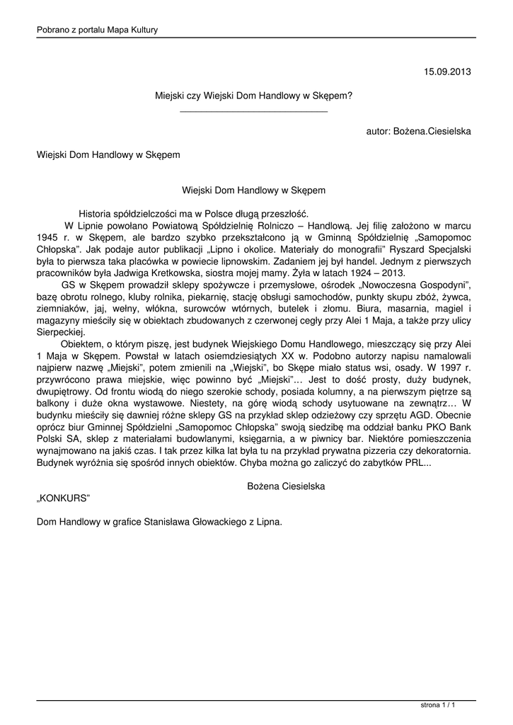 Pobrano z portalu Mapa Kultury 15.09.2013 Miejski czy Wiejski Dom Handlowy w Skępem? ____________________________ autor: Bożena.Ciesielska Wiejski Dom Handlowy w Skępem Wiejski Dom Handlowy w Skępem Historia spółdzielczości ma w Polsce długą przeszłość. W Lipnie powołano Powiatową Spółdzielnię Rolniczo – Handlową. Jej filię założono w marcu 1945 r. w Skępem, ale bardzo szybko przekształcono ją w Gminną Spółdzielnię „Samopomoc Chłopska”. Jak podaje autor publikacji „Lipno i okolice. Materiały do monografii” Ryszard Specjalski była to pierwsza taka placówka w powiecie lipnowskim. Zadaniem jej był handel. Jednym z pierwszych pracowników była Jadwiga Kretkowska, siostra mojej mamy. Żyła w latach 1924 – 2013. GS w Skępem prowadził sklepy spożywcze i przemysłowe, ośrodek „Nowoczesna Gospodyni”, bazę obrotu rolnego, kluby rolnika, piekarnię, stację obsługi samochodów, punkty skupu zbóż, żywca, ziemniaków, jaj, wełny, włókna, surowców wtórnych, butelek i złomu. Biura, masarnia, magiel i magazyny mieściły się w obiektach zbudowanych z czerwonej cegły przy Alei 1 Maja, a także przy ulicy Sierpeckiej. Obiektem, o którym piszę, jest budynek Wiejskiego Domu Handlowego, mieszczący się przy Alei 1 Maja w Skępem. Powstał w latach osiemdziesiątych XX w. Podobno autorzy napisu namalowali najpierw nazwę „Miejski”, potem zmienili na „Wiejski”, bo Skępe miało status wsi, osady. W 1997 r. przywrócono prawa miejskie, więc powinno być „Miejski”… Jest to dość prosty, duży budynek, dwupiętrowy. Od frontu wiodą do niego szerokie schody, posiada kolumny, a na pierwszym piętrze są balkony i duże okna wystawowe. Niestety, na górę wiodą schody usytuowane na zewnątrz… W budynku mieściły się dawniej różne sklepy GS na przykład sklep odzieżowy czy sprzętu AGD. Obecnie oprócz biur Gminnej Spółdzielni „Samopomoc Chłopska” swoją siedzibę ma oddział banku PKO Bank Polski SA, sklep z materiałami budowlanymi, księgarnia, a w piwnicy bar. Niektóre pomieszczenia wynajmowano na jakiś czas. I tak przez kilka lat była tu na przykład prywatna pizzeria czy dekoratornia. Budynek wyróżnia się spośród innych obiektów. Chyba można go zaliczyć do zabytków PRL... „KONKURS” Bożena Ciesielska Dom Handlowy w grafice Stanisława Głowackiego z Lipna. strona 1 / 1