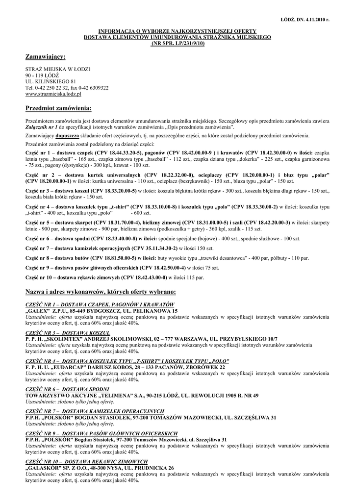 ŁÓDŹ, DN. 4.11.2010 r. INFORMACJA O WYBORZE NAJKORZYSTNIEJSZEJ OFERTY DOSTAWA ELEMENTÓW UMUNDUROWANIA STRAŻNIKA MIEJSKIEGO (NR SPR. LP/231/9/10) Zamawiający: STRAŻ MIEJSKA W ŁODZI 90 - 119 ŁÓDŹ UL. KILIŃSKIEGO 81 Tel. 0-42 250 22 32, fax 0-42 6309322 www.strazmiejska.lodz.pl Przedmiot zamówienia: Przedmiotem zamówienia jest dostawa elementów umundurowania strażnika miejskiego. Szczegółowy opis przedmiotu zamówienia zawiera Załącznik nr 1 do specyfikacji istotnych warunków zamówienia „Opis przedmiotu zamówienia”. Zamawiający dopuszcza składanie ofert częściowych, tj. na poszczególne części, na które został podzielony przedmiot zamówienia. Przedmiot zamówienia został podzielony na dziesięć części: Część nr 1 – dostawa czapek (CPV 18.44.33.20-5), pagonów (CPV 18.42.00.00-9 ) i krawatów (CPV 18.42.30.00-0) w ilości: czapka letnia typu „baseball” - 165 szt., czapka zimowa typu „baseball” - 112 szt., czapka dziana typu „dokerka” - 225 szt., czapka garnizonowa - 75 szt., pagony (dystynkcje) - 300 kpl., krawat - 100 szt. Część nr 2 – dostawa kurtek uniwersalnych (CPV 18.22.32.00-0), ocieplaczy (CPV 18.20.00.00-1) i bluz typu „polar” (CPV 18.20.00.00-1) w ilości: kurtka uniwersalna - 110 szt., ocieplacz (bezrękawnik) - 150 szt., bluza typu „polar” - 150 szt. Część nr 3 – dostawa koszul (CPV 18.33.20.00-5) w ilości: koszula błękitna krótki rękaw - 300 szt., koszula błękitna długi rękaw - 150 szt., koszula biała krótki rękaw - 150 szt. Część nr 4 – dostawa koszulek typu „t-shirt” (CPV 18.33.10.00-8) i koszulek typu „polo” (CPV 18.33.30.00-2) w ilości: koszulka typu „t-shirt” - 400 szt., koszulka typu „polo” - 600 szt. Część nr 5 – dostawa skarpet (CPV 18.31.70.00-4), bielizny zimowej (CPV 18.31.00.00-5) i szali (CPV 18.42.20.00-3) w ilości: skarpety letnie - 900 par, skarpety zimowe - 900 par, bielizna zimowa (podkoszulka + getry) - 360 kpl, szalik - 115 szt. Część nr 6 – dostawa spodni (CPV 18.23.40.00-8) w ilości: spodnie specjalne (bojowe) - 400 szt., spodnie służbowe - 100 szt. Część nr 7 – dostawa kamizelek operacyjnych (CPV 35.11.34.30-2) w ilości 150 szt. Część nr 8 – dostawa butów (CPV 18.81.50.00-5) w ilości: buty wysokie typu „trzewiki desantowca” - 400 par, półbuty - 110 par. Część nr 9 – dostawa pasów głównych oficerskich (CPV 18.42.50.00-4) w ilości 75 szt. Część nr 10 – dostawa rękawic zimowych (CPV 18.42.43.00-0) w ilości 115 par. Nazwa i adres wykonawców, których oferty wybrano: CZĘŚĆ NR 1 – DOSTAWA CZAPEK, PAGONÓW I KRAWATÓW „GALEX” Z.P.U., 85-449 BYDGOSZCZ, UL. PELIKANOWA 15 Uzasadnienie: oferta uzyskała najwyższą ocenę punktową na podstawie wskazanych w specyfikacji istotnych warunków zamówienia kryteriów oceny ofert, tj. cena 60% oraz jakość 40%. CZĘŚĆ NR 3 – DOSTAWA KOSZUL P. P. H. „SKOLIMTEX” ANDRZEJ SKOLIMOWSKI, 02 – 777 WARSZAWA, UL. PRZYBYLSKIEGO 10/7 Uzasadnienie: oferta uzyskała najwyższą ocenę punktową na podstawie wskazanych w specyfikacji istotnych warunków zamówienia kryteriów oceny ofert, tj. cena 60% oraz jakość 40%. CZĘŚĆ NR 4 – DOSTAWA KOSZULEK TYPU „T-SHIRT” I KOSZULEK TYPU „POLO” F. P. H. U. „EUDARCAP” DARIUSZ KOBOS, 28 – 133 PACANÓW, ZBORÓWEK 22 Uzasadnienie: oferta uzyskała najwyższą ocenę punktową na podstawie wskazanych w specyfikacji istotnych warunków zamówienia kryteriów oceny ofert, tj. cena 60% oraz jakość 40%. CZĘŚĆ NR 6 – DOSTAWA SPODNI TOWARZYSTWO AKCYJNE „TELIMENA” S.A., 90-215 ŁÓDŹ, UL. REWOLUCJI 1905 R. NR 49 Uzasadnienie: złożono tylko jedną ofertę. CZĘŚĆ NR 7 – DOSTAWA KAMIZELEK OPERACYJNYCH P.P.H. „POLSKÓR” BOGDAN STASIOŁEK, 97-200 TOMASZÓW MAZOWIECKI, UL. SZCZĘŚLIWA 31 Uzasadnienie: złożono tylko jedną ofertę. CZĘŚĆ NR 9 – DOSTAWA PASÓW GŁÓWNYCH OFICERSKICH P.P.H. „POLSKÓR” Bogdan Stasiołek, 97-200 Tomaszów Mazowiecki, ul. Szczęśliwa 31 Uzasadnienie: oferta uzyskała najwyższą ocenę punktową na podstawie wskazanych w specyfikacji istotnych warunków zamówienia kryteriów oceny ofert, tj. cena 60% oraz jakość 40%. CZĘŚĆ NR 10 – DOSTAWA RĘKAWIC ZIMOWYCH „GALASKÓR” SP. Z O.O., 48-300 NYSA, UL. PRUDNICKA 26 Uzasadnienie: oferta uzyskała najwyższą ocenę punktową na podstawie wskazanych w specyfikacji istotnych warunków zamówienia kryteriów oceny ofert, tj. cena 60% oraz jakość 40%. Wykaz wykonawców, którzy złożyli oferty wraz z punktacją przyznaną ofertom w każdym kryterium oceny ofert i łączną punktacją: Wykaz wykonawców, którzy złożyli oferty wraz z punktacją przyznaną ofertom w każdym kryterium oceny ofert i łączną punktacją: Nr oferty 4 6 Nazwa (firma) i adres wykonawcy Cena Liczba punktów w kryterium cena 60% Liczba punktów w kryterium jakość 40% Liczba uzyskanych punktów łącznie CZĘŚĆ NR 1 – DOSTAWA CZAPEK, PAGONÓW I KRAWATÓW „GALEX” Z.P.U. 11.847,62 300 200 85-449 Bydgoszcz, ul. Pelikanowa 15 zł. brutto „PASANIL” Sp. z o.o. 80-652 Gdańsk, ul. Nowotna 18 16.272,95 zł. brutto 219 200 500 419 CZĘŚĆ NR 2 – DOSTAWA KURTEK UNIWERSALNYCH, OCIEPLACZY I BLUZ TYPU „POLAR” 12 7 9 10 „Nieprzemakalni” Andrzej i Waldemar Kieresińscy 91-341 Łódź, ul. Brukowa 201 39.940,00 zł. brutto Oferta odrzucona CZĘŚĆ NR 3 – DOSTAWA KOSZUL Z.U.H.P „RUDEK” Andrzej Rudek 23.607,00 28 – 100 Busko Zdrój, ul. Królowej Jadwigi 17 zł. brutto P. P. H. „SKOLIMTEX” 26.809,50 Andrzej Skolimowski 300 zł. brutto 02 – 777 Warszawa, ul. Przybylskiego 10/7 KASTOR S. A. 40.992,00 195 98 – 100 Łask, ul. Przemysłowa 12 zł. brutto Oferta odrzucona 200 500 200 395 CZĘŚĆ NR 4 – DOSTAWA KOSZULEK TYPU „T-SHIRT” I KOSZULEK TYPU „POLO” 4 6 11 „GALEX” Z.P.U. 85-449 Bydgoszcz, ul. Pelikanowa 15 „PASANIL” Sp. z o.o. 80-652 Gdańsk, ul. Nowotna 18 28.840,00 zł. brutto 40.3