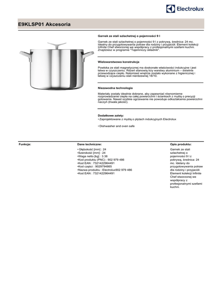 E9KLSP01 Akcesoria Garnek ze stali szlachetnej o pojemności 9 l Garnek ze stali szlachetnej o pojemności 9 l z pokrywą, średnica: 24 mc. Idealny do przygotowywania potraw dla rodziny i przyjaciół. Element kolekcji Infinite Chef stworzonej we współpracy z profesjonalnymi szefami kuchni. Znajdziesz w programie "Tajemniczy składnik". Wielowarstwowa konstrukcja Powłoka ze stali magnetycznej ma doskonałe właściwości indukcyjne i jest łatwa w czyszczeniu. Rdzeń stanowią trzy warstwy aluminium – świetnie przewodzące ciepło. Natomiast wnętrze zostało wykonane z higienicznej i łatwej w czyszczeniu stali nierdzewnej 18/10. Niezawodna technologia Materiały zostały idealnie dobrane, aby zapewniać równomierne rozprowadzanie ciepła na całej powierzchni i ściankach z myślą o precyzji gotowania. Nawet szybkie ogrzewanie nie powoduje odkształcenia powierzchni naczyń (trwała jakość). Dodatkowe zalety: • Zaprojektowane z myślą o płytach indukcyjnych Electrolux • Dishwasher and oven safe Funkcje: Dane techniczne: Opis produktu: • Głębokość [mm] : 24 •Szerokość [mm] : 24 •Waga netto [kg] : 3.38 •Kod produktu (PNC) : 902 979 486 •Kod EAN : 7321422964491 •Kod części : 9029794865 •Nazwa produktu : Electrolux902 979 486 •Kod EAN : 7321422964491 Garnek ze stali szlachetnej o pojemności 9 l z pokrywą, średnica: 24 mc. Idelany do przygotowywania potraw dla rodziny i przyjaciół. Element kolekcji Infinite Chef stworzonej we współpracy z profesjonalnymi szefami kuchni.