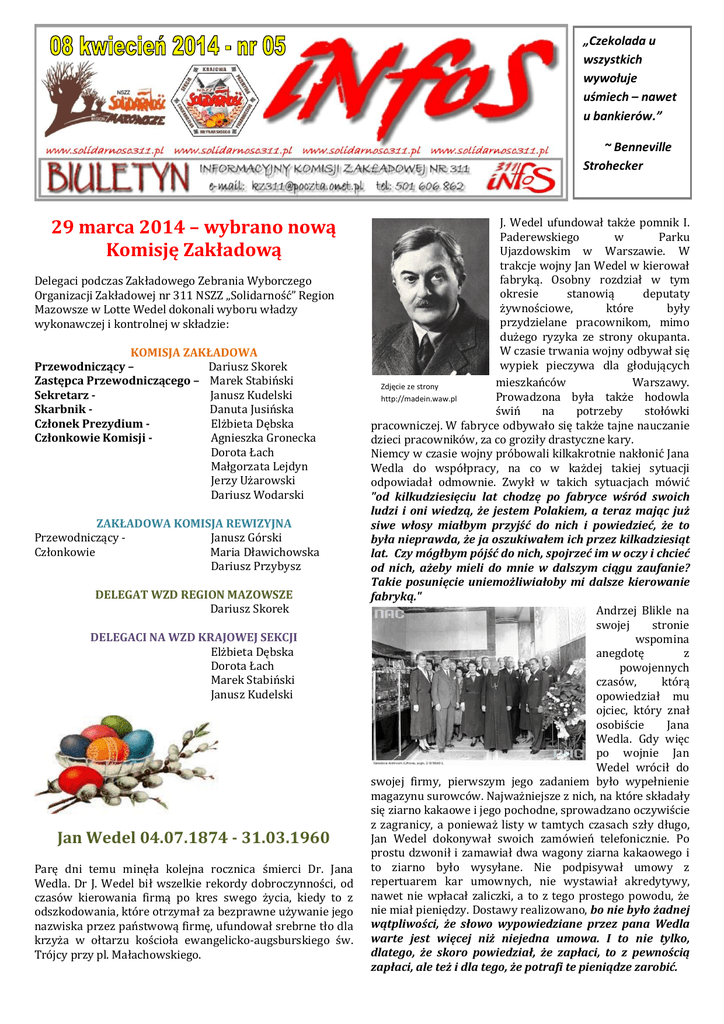 „Czekolada u wszystkich wywołuje uśmiech – nawet u bankierów.” ~ Benneville Strohecker 29 marca 2014 – wybrano nową Komisję Zakładową Delegaci podczas Zakładowego Zebrania Wyborczego Organizacji Zakładowej nr 311 NSZZ „Solidarność” Region Mazowsze w Lotte Wedel dokonali wyboru władzy wykonawczej i kontrolnej w składzie: KOMISJA ZAKŁADOWA Przewodniczący – Dariusz Skorek Zastępca Przewodniczącego – Marek Stabiński Sekretarz Janusz Kudelski Skarbnik Danuta Jusińska Członek Prezydium Elżbieta Dębska Członkowie Komisji Agnieszka Gronecka Dorota Łach Małgorzata Lejdyn Jerzy Użarowski Dariusz Wodarski ZAKŁADOWA KOMISJA REWIZYJNA Przewodniczący Janusz Górski Członkowie Maria Dławichowska Dariusz Przybysz DELEGAT WZD REGION MAZOWSZE Dariusz Skorek DELEGACI NA WZD KRAJOWEJ SEKCJI Elżbieta Dębska Dorota Łach Marek Stabiński Janusz Kudelski Jan Wedel 04.07.1874 - 31.03.1960 Parę dni temu minęła kolejna rocznica śmierci Dr. Jana Wedla. Dr J. Wedel bił wszelkie rekordy dobroczynności, od czasów kierowania firmą po kres swego życia, kiedy to z odszkodowania, które otrzymał za bezprawne używanie jego nazwiska przez państwową firmę, ufundował srebrne tło dla krzyża w ołtarzu kościoła ewangelicko-augsburskiego św. Trójcy przy pl. Małachowskiego. J. Wedel ufundował także pomnik I. Paderewskiego w Parku Ujazdowskim w Warszawie. W trakcje wojny Jan Wedel w kierował fabryką. Osobny rozdział w tym okresie stanowią deputaty żywnościowe, które były przydzielane pracownikom, mimo dużego ryzyka ze strony okupanta. W czasie trwania wojny odbywał się wypiek pieczywa dla głodujących mieszkańców Warszawy. Zdjęcie ze strony Prowadzona była także hodowla http://madein.waw.pl świń na potrzeby stołówki pracowniczej. W fabryce odbywało się także tajne nauczanie dzieci pracowników, za co groziły drastyczne kary. Niemcy w czasie wojny próbowali kilkakrotnie nakłonić Jana Wedla do współpracy, na co w każdej takiej sytuacji odpowiadał odmownie. Zwykł w takich sytuacjach mówić "od kilkudziesięciu lat chodzę po fabryce wśród swoich ludzi i oni wiedzą, że jestem Polakiem, a teraz mając już siwe włosy miałbym przyjść do nich i powiedzieć, że to była nieprawda, że ja oszukiwałem ich przez kilkadziesiąt lat. Czy mógłbym pójść do nich, spojrzeć im w oczy i chcieć od nich, ażeby mieli do mnie w dalszym ciągu zaufanie? Takie posunięcie uniemożliwiałoby mi dalsze kierowanie fabryką." Andrzej Blikle na swojej stronie wspomina anegdotę z powojennych czasów, którą opowiedział mu ojciec, który znał osobiście Jana Wedla. Gdy więc po wojnie Jan Wedel wrócił do swojej firmy, pierwszym jego zadaniem było wypełnienie magazynu surowców. Najważniejsze z nich, na które składały się ziarno kakaowe i jego pochodne, sprowadzano oczywiście z zagranicy, a ponieważ listy w tamtych czasach szły długo, Jan Wedel dokonywał swoich zamówień telefonicznie. Po prostu dzwonił i zamawiał dwa wagony ziarna kakaowego i to ziarno było wysyłane. Nie podpisywał umowy z repertuarem kar umownych, nie wystawiał akredytywy, nawet nie wpłacał zaliczki, a to z tego prostego powodu, że nie miał pieniędzy. Dostawy realizowano, bo nie było żadnej wątpliwości, że słowo wypowiedziane przez pana Wedla warte jest więcej niż niejedna umowa. I to nie tylko, dlatego, że skoro powiedział, że zapłaci, to z pewnością zapłaci, ale też i dla tego, że potrafi te pieniądze zarobić. XVIII SPARTAKIADA PRZEMYSŁU SPOŻYWCZEGO W dniach 19 – 22 czerwca w Pasymiu koło Szczytna odbędzie się XVIII Międzynarodowa Spartakiada Przemysłu Spożywczego, której organizatorem jest Krajowy Sekretariat Przemysłu Spożywczego NSZZ „Solidarność”. Do kilku lat jesteśmy stałym uczestnikiem tej imprezy i nie inaczej będzie w tym roku. Na chwilę obecną przydzielono drużynie z Lotte Wedel przydzielono 30 miejsc. Wystartujemy w następujących konkurencjach sportowych: - piłka siatkowa kobiet – 4 zawodniczki - piłka siatkowa mężczyzn – 6 zawodników - przeciąganie liny kobiet – 3 zawodniczki - przeciąganie liny mężczyzn – 5 zawodników - skok w dal z miejsca – 2 kobiety + 2 mężczyzn - rzut lotką – 2 kobiety + 1 mężczyzna - tenis stołowy kobiet – 2 zawodniczki - tenis stołowy mężczyzn – 2 zawodników - bieg przełajowy mężczyzn – 1 zawodnik - bieg przełajowy kobiet – 1 zawodniczka - ciężarek pań (5kg) – 2 zawodniczki - ciężarek mężczyzn – 2 zawodników - rzut do kosza – 2 mężczyzn + 1 kobieta - sztafeta mieszana (wymyślone konkurencje) 2k +2m Koszt pełnego pobytu z wyżywieniem to kwota 380 złotych od osoby. Dojdzie do tego koszt podróży autokarem. Część tej kwoty refundowana będzie przez Fundusz Socjalny. Członkowie NSZZ „Solidarność” otrzymają także dopłatę z budżetu Komisji Zakładowej. Zapisy na Spartakiadę prowadzić będzie: - Elżbieta Dębska - Dariusz Wodarski Jesteśmy już po wyborach. Teraz całą nowa Komisję Zakładową czeka ciężka czteroletnia kadencja. Po rozmowach z poszczególnymi członkami Komisji Zakładowej powstały zespoły robocze: Żeby Wielkanoc w tym roku, przyszła z sukcesem u boku. Aby żyło się Wam zdrowo, prywatnie i zawodowo. Wielu, wielu chwil radosnych i cudownej, ciepłej wiosny życzy Komisja Zakładowa A TEN TO SKĄD ? Komisja Socjalna – E. Dębska, D. Łach, A. Gronecka Komisja BHP – M. Stabiński, D. Wodarski, J. Użarowski Komisja Programowa – J. Kudelski, D. Jusińska, M. Lejdyn Życzę wszystkim naszym pracownikom, aby Wielkanoc ogarnęła Was szczególną tradycją i nowymi szczęśliwymi przeżyciami, Ale przede wszystkim by Wielkanoc umocniła Waszą wiarę, podniosła na duchu i napełniła Wasze serca radością. Dariusz Skorek Pierwsze zadania dostała Komisja programowa, która przygotuje nowe uchwały dotyczące działalności statutowej. Uchwały dotyczyć bę