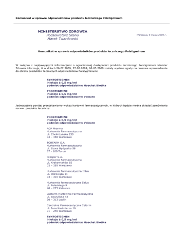 Komunikat w sprawie odpowiedników produktu leczniczego Polstigminum MINISTERSTWO ZDROWIA Podsekretarz Stanu Marek Twardowski Warszawa, 9 marca 2009 r . Komunikat w sprawie odpowiedników produktu leczniczego Polstigminum W związku z napływającymi informacjami o ograniczonej dostępności produktu leczniczego Polstigminum Minister Zdrowia informuje, iż w dniach 26.02.2009, 27.02.2009, 06.03.2009 zostały wydane zgody na czasowe wprowadzenie do obrotu produktów leczniczych odpowiedników Polstygminum: SYNTOSTIGMIN iniekcje á 0,5 mg/ml podmiot odpowiedzialny: Hoechst Biotika PROSTIGMINE iniekcje á 0,5 mg/ml podmiot odpowiedzialny: Valeant Jednocześnie poniżej przedstawiamy wykaz hurtowni farmaceutycznych, w których będzie można składać zamówienia na ww. produktu lecznicze: PROSTIGMINE iniekcje á 0,5 mg/ml podmiot odpowiedzialny: Valeant ACP Pharma Hurtownia Farmaceutyczna ul. Chełmżyńska 239 04 – 458 Warszawa TORFARM S.A. Hurtownia Farmaceutyczna ul. Szosa Bydgoska 58 87 - 100 Toruń Prosper S.A. Hurtownia Farmaceutyczna ul. Krakowiaków 65 02 – 255 Warszawa Hurtownia Farmaceutyczna Intra ul. Odrowąża 11 03 – 310 Warszawa Hurtownia farmaceutyczna Salus ul. Pułaskiego 9 40 – 273 Katowice Lubfarm Hurtownia Farmaceutyczna ul. Łęczyńska 43 20 – 313 Lublin Centralna Farmaceutyczna Cefarm ul. Jana Kazimierza 16 01 – 248 Warszawa SYNTOSTIGMIN iniekcje á 0,5 mg/ml podmiot odpowiedzialny: Hoechst Biotika Hurtownia farmaceutyczna Salus ul. Pułaskiego 9 40 – 273 Katowice Polska Grupa farmaceutyczna Oddział Katowice ul. Kolista 5 40 – 486 Katowice Polska Grupa farmaceutyczna Oddział w Łodzi ul. Zbąszyńska 1 90 – 342 Łódź Podsekretarz Stanu Marek Twardowski © 2007 Ministerstwo Zdrowia © 2002-2007 Platforma Activeweb Medical Solutions.