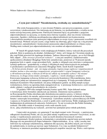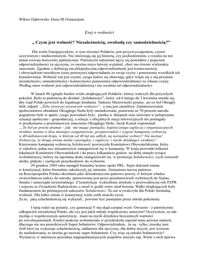 Wiktor Dąbrowski- klasa III Gimnazjum Esej o wolności „ Czym jest wolność? Niezależnością, swobodą czy samodzielnością?” Dla wielu Europejczyków, w tym również Polaków, jest przyzwyczajeniem, czymś oczywistym i niedocenionym. Nie interesują się jej historią, czy pochodzeniem, a wiedza na ten temat rozwija horyzonty patriotyzmu. Patriotyzm natomiast łączy się pośrednio z pojęciem odpowiedzialności za ojczyznę, co można nieco łatwiej wyjaśnić, choć ma równie wielorakie znaczenie. Zgodnie z definicją encyklopedyczną odpowiedzialność jest koniecznością i obowiązkiem moralnym (oraz prawnym) odpowiadania za swoje czyny i ponoszenia wszelkich ich konsekwencji. Wolność zaś jest czymś, czego ludzie się obawiają, gdyż wiąże się z nią przymus niezależności, samodzielności i konieczności ponoszenia odpowiedzialności za własne czyny. Według mnie wolność jest odpowiedzialnością i nie uwalnia od odpowiedzialności. W latach 80 zginęło bardzo wielu strajkujących Polaków, którzy walczyli dla przyszłych pokoleń. Było to podstawą do działań „Solidarności”, która od 6 lutego do 5 kwietnia starała się, aby rząd Polski powrócił do legalnego działania. Tadeusz Mazowiecki pytany, po co był Okrągły Stół, odparł: „Żeby stworzyć przestrzeń wolności”, a ona jest zaraźliwa. Zainteresowania społeczeństwa obradami Okrągłego Stołu były umiarkowane, ponieważ aż 70 procent narodu pogrążone było w apatii, czego powodami były: pustka w sklepach oraz niewiara w polepszenie sytuacji społeczno - gospodarczej, a relacje z oficjalnych stacji telewizyjnych nie pomagały w przekonaniu o przełomowym znaczeniu Okrągłego Stołu. Jacek Kuroń wspominał: „ To był po prostu dramat – jak, nie mając pieniędzy, logistycznego zaplecza i organizacyjnych struktur, można w dwa miesiące zorganizować, przeprowadzić i wygrać kampanię wyborczą w 40-milionowym kraju, w którym od 40 lat nie odbyły się normalne wybory? Nie można! Zwłaszcza, że druga strona miała i pieniądze, i zaplecze, i nieźle działające struktury”. Kierowanie kampanią wyborczą Solidarność powierzyła Komitetowi Obywatelskiemu, który w zaledwie jedną noc niesamowicie zaangażował się w kampanię. W kraju powstało kilkaset lokalnych Komitetów Obywatelskich i do pracy kilkanaście godzin na dobę stanęło tysiące wolontariuszy, którzy na ogromną skalę zaangażowali się w promocję Solidarności, czyli roznosili ulotki, plakaty i zachęcali przechodniów do wyborów. 29 grudnia 1989 roku nastąpił formalny koniec epoki PRL. Sejm dokonał zmian w konstytucji, które formalnie zakończyły jej istnienie. Zmieniono nazwę państwa na Rzeczpospolita Polska określana jako demokratyczne państwo prawa, w którym władza zwierzchnicza należy do narodu, sprawowana jest przez przedstawicieli wybranych do Sejmu, Senatu i samorządu terytorialnego. Z konstytucji wykreślono artykuły o przewodniczej roli PZPR i sojuszu ze Związkiem Radzieckim, a orzeł w godle znów miał koroną. Walki strajkujących były fundamentem do późniejszych sukcesów Solidarności. Ta zaś wywalczyła dla Polski formalną wolność. Dla kilku zmian w konstytucji wiele osób straciło życie. Za to, jaką szlachetnością się wykazali, powinni być pamiętani przez młode pokolenia. I tutaj rodzi się pytanie, czy generacja Y ma skąd czerpać wzór. Owszem - z patriotyzmu odkupicieli niezależnej Polski, ale czy jest jakiś młody współczesny autorytet? Oczywiście, że takmyśląc o współczesnym autorytecie, mam na myśli dziedzica bezcennych wartości po rewolucjonistach. Kiedyś podczas wolontariatu w przedszkolu zapytał mnie pewien maluch, dlaczego nie ma prawdziwych Super bohaterów. Odpowiedziałem, że są - tylko, troszkę inni. Jeśli ktoś się wykazuje szlachetnością, oddaniem dla ojczyzny, dla dobra innych, jest wzorem do naśladowania, to można go nazwać super bohaterem. Czy więc są młodzi bohaterowie? Wystarczy w internecie poszukać najpopularniejszych zespołów muzyki rap. Wiele z nich śpiewa piosenki upamiętniające ofiary II wojny światowej czy wiosennej i letniej fali strajków 1988 r. Sporo z tych utworów ma bardzo dużo wyświetleń, co świadczy o zainteresowaniu odbiorców, czyli głównie nastolatków, historią Polski. Jeżeli ktoś pamięta, jest patriotą, a patriota to bohater państwowy, bo wyraża miłość do ojczyzny. Młody bohater pracuje dla zachowania polskości, czyli dziedzictwa narodowego, rozwoju naszego niepodległego państwa, uczy się, aby w przyszłości przejąć pałeczkę po politykach w rządzie, aby kontynuować ich pracę. Ja w związku z tymi przemyśleniami chciałbym zaproponować trochę inne ujęcie, czyli przenieść tę sytuacje na poziom polityczny. Czy nie byłoby łatwiej, gdyby wszystkie partie były jednomyślne. Uważam, że świadczyłoby to o chęci zmiany Polski na najlepszy z możliwych sposobów, bo patriotyzm nie cechuje się racją, tylko chęcią posiadania racji w sprawach Polski, a jak wiadomo, ludzie mają różne poglądy, obywatele podczas wyborów wybierają, jaką drogą ich kraj ma podążać przez następne 4 lata. Należy zauważyć, że wszystkie znane partie pragną zapewnić obywatelom godne życie i poprawę jego warunków, czyli lepszej sytuacji ekonomicznej, lepszej obrony państwa, zarówno dyplomatycznej jak i militarnej, poprawy systemu edukacji, aby pokazać, że gdy świat idzie do przodu, to Polska podąża za nim, z podwojoną prędkością. No właśnie... . Nie od dzisiaj wiadomo, że Polska bardzo dużo przeszła – czasy komunizmu zubożyły jej zasoby. Obecnie jednak szybko się pnie, aby dorównać reszcie Europy, a wstąpienie do NATO poprawiło bezpieczeństwo. Po tak wielu doświadczeniach Polacy powinni pamiętać, że tylko wspólne budowanie silnego i rozwiniętego państwa, kochanego przez swych obywateli dostrzegających potrz