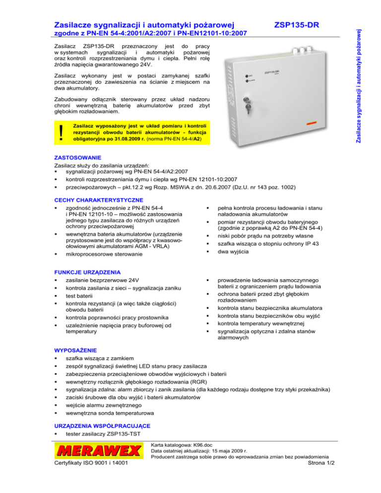 ZSP135-DR zgodne z PN-EN 54-4:2001/A2:2007 i PN-EN12101-10:2007 Zasilacz ZSP135-DR przeznaczony jest do pracy w systemach sygnalizacji i automatyki poŜarowej oraz kontroli rozprzestrzeniania dymu i ciepła. Pełni rolę źródła napięcia gwarantowanego 24V. Zasilacz wykonany jest w postaci zamykanej szafki przeznaczonej do zawieszenia na ścianie z miejscem na dwa akumulatory. Zabudowany odłącznik sterowany przez układ nadzoru chroni wewnętrzną baterię akumulatorów przed zbyt głębokim rozładowaniem. ! Zasilacz wyposaŜony jest w układ pomiaru i kontroli rezystancji obwodu baterii akumulatorów - funkcja obligatoryjna po 31.08.2009 r. (norma PN-EN 54-4/A2) ZASTOSOWANIE Zasilacz słuŜy do zasilania urządzeń: sygnalizacji poŜarowej wg PN-EN 54-4/A2:2007 kontroli rozprzestrzeniania dymu i ciepła wg PN-EN 12101-10:2007 przeciwpoŜarowych – pkt.12.2 wg Rozp. MSWiA z dn. 20.6.2007 (Dz.U. nr 143 poz. 1002) CECHY CHARAKTERYSTYCZNE zgodność jednocześnie z PN-EN 54-4 i PN-EN 12101-10 – moŜliwość zastosowania jednego typu zasilacza do róŜnych urządzeń ochrony przeciwpoŜarowej wewnętrzna bateria akumulatorów (urządzenie przystosowane jest do współpracy z kwasowoołowiowymi akumulatorami AGM - VRLA) mikroprocesorowe sterowanie pełna kontrola procesu ładowania i stanu naładowania akumulatorów pomiar rezystancji obwodu bateryjnego (zgodnie z poprawką A2 do PN-EN 54-4) niski pobór prądu na potrzeby własne szafka wisząca o stopniu ochrony IP 43 dwa wyjścia FUNKCJE URZĄDZENIA zasilanie bezprzerwowe 24V kontrola zasilania z sieci – sygnalizacja zaniku test baterii kontrola rezystancji (a więc takŜe ciągłości) obwodu baterii kontrola poprawności pracy prostownika uzaleŜnienie napięcia pracy buforowej od temperatury prowadzenie ładowania samoczynnego baterii z ograniczeniem prądu ładowania ochrona baterii przed zbyt głębokim rozładowaniem kontrola stanu bezpiecznika akumulatora kontrola stanu bezpieczników obu wyjść kontrola temperatury wewnętrznej sygnalizacja optyczna i zdalna stanów alarmowych WYPOSAśENIE szafka wisząca z zamkiem zespół sygnalizacji świetlnej LED stanu pracy zasilacza zabezpieczenia przeciąŜeniowe obwodów wyjściowych i baterii wewnętrzny rozłącznik głębokiego rozładowania (RGR) sygnalizacja zdalna: alarm zbiorczy i zanik zasilania (dla kaŜdego rodzaju dostępne trzy styki przekaźnika) zaciski śrubowe dla obu wyjść i baterii akumulatorów wejście alarmu zewnętrznego wewnętrzna sonda temperaturowa URZĄDZENIA WSPÓŁPRACUJĄCE tester zasilaczy ZSP135-TST MERAWEX Certyfikaty ISO 9001 i 14001 Karta katalogowa: K96.doc Data ostatniej aktualizacji: 15 maja 2009 r. Producent zastrzega sobie prawo do wprowadzania zmian bez powiadomienia Strona 1/2 Zasilacze sygnalizacji i automatyki poŜarowej Zasilacze sygnalizacji i automatyki poŜarowej Zasilacze sygnalizacji i automatyki poŜarowej Zasilacze sygnalizacji i automatyki poŜarowej ZSP135-DR zgodne z PN-EN 54-4:2001/A2:2007 i PN-EN12101-10:2007 PODSTAWOWE PARAMETRY ZASILACZA Parametry wspólne Parametry wejściowe Napięcie zasilania 184…230…253V Parametry wyjściowe Napięcie pracy buforowej (25°C) 26,8V Zakres zmian napięcia wyjściow. 20…28V Warunki uŜytkowania -25ºC...+55ºC, +75ºC przez 2 godziny 25 ppm SO2 w +25º i 93% wilgotności Zakres temp. pracy Odporność antykorozyjna Ogólne Sprawność Współczynnik kompensacji temperaturowej Chłodzenie Pobór prądu na potrzeby własne Maks. rezystancja obw. baterii min 77…82% -48mV/ ºC konwekcyjne max 35mA 250mΩ Maks. prąd ładowania akumulatora 2A Zgodność z wymogami bezpieczeństwa Wibracje sinusoidalne 10…50Hz 50…150Hz Stopień ochrony PN-EN 60529:2003 Kl. funkcjonalna PN-EN 12101-10 Kl. środowiskowa PN-EN 12101-10 Kl. klimatyczna Rozp. MSWiA z dn. 20.6.2007 Dz. U. 143 poz. 1002 Bezpieczeństwo elektryczne 1g 3g IP 43 PN-EN 60950-1:2007 kl. I Zakłócenia elektromagnetyczne A 2 I PN-EN 55022:2006 /A1:2008 poziom B PN-EN 54-4:2001/A2:2007 PN-EN 501304:2002/A2:2007 Odporność EMC Parametry indywidualne Indeks ZSP135-DR-2A-1 ZSP135-DR-3A-1 ZSP135-DR-3A-2 ZSP135-DR-5A-1 ZSP135-DR-5A-2 ZSP135-DR-5A-3 ZSP135-DR-7A-1 ZSP135-DR-7A-2 ZSP135-DR-7A-3 Maksymalny prąd wyjściowy Imax b 2,0A Nominalny prąd wyjściowy Imax a 1,0A 2,0A 1,5A 4,0A 3,5A 3,0A 6,0A 5,5A 5,0A 3,0A 5,0A 7,0A Maks. pojemność baterii akumulatorów ) 18Ah * ) 18Ah * 28Ah ) 18Ah * 28Ah 40Ah ) 18Ah * 28Ah 40Ah ) * W miejsce akumulatora 18Ah moŜe być montowany akumulator o pojemności 17Ah. Typ szafki (ostatnia część indeksu) 1 2 3 Wymiary (SxWxG), mm 390x350x90 390x350x140 450x350x180 Masa zasilacza z baterią akumulatorów 18kg 28kg 42kg Zasilacze ZSP135-DR wymagają oddzielnego zamówienia akumulatorów. Przykład zamówienia Zasilacz sygnalizacji i automatyki poŜarowej ZSP135-DR-5A-1 Akumulator 12V/18Ah 2szt PRODUCENT UWAGI MERAWEX Sp. z o.o. Toruńska 8, 44-122 Gliwice NIP 631-000-04-40 www.merawex.com.pl [email protected] tel. 032 23 99 400 fax 032 23 99 409 MERAWEX Certyfikaty ISO 9001 i 14001 Karta katalogowa: K96.doc Data ostatniej aktualizacji: 15 maja 2009 r. Producent zastrzega sobie prawo do wprowadzania zmian bez powiadomienia Strona 2/2