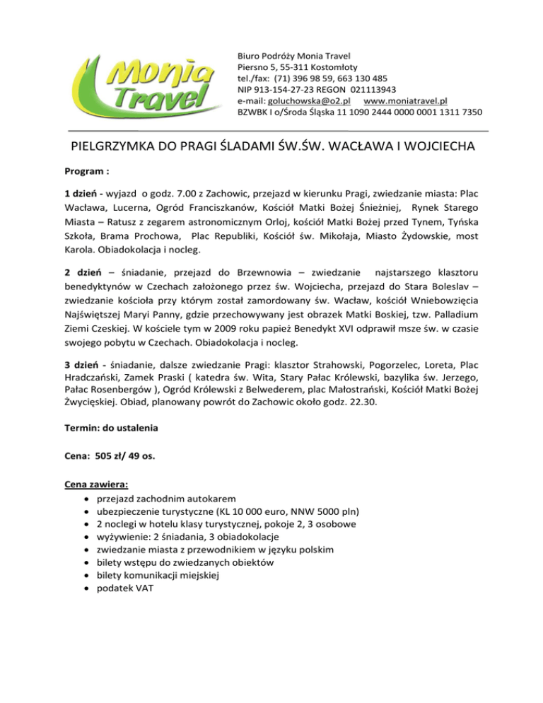 Biuro Podróży Monia Travel Piersno 5, 55-311 Kostomłoty tel./fax: (71) 396 98 59, 663 130 485 NIP 913-154-27-23 REGON 021113943 e-mail: [email protected] www.moniatravel.pl BZWBK I o/Środa Śląska 11 1090 2444 0000 0001 1311 7350 PIELGRZYMKA DO PRAGI ŚLADAMI ŚW.ŚW. WACŁAWA I WOJCIECHA Program : 1 dzień - wyjazd o godz. 7.00 z Zachowic, przejazd w kierunku Pragi, zwiedzanie miasta: Plac Wacława, Lucerna, Ogród Franciszkanów, Kościół Matki Bożej Śnieżniej, Rynek Starego Miasta – Ratusz z zegarem astronomicznym Orloj, kościół Matki Bożej przed Tynem, Tyńska Szkoła, Brama Prochowa, Plac Republiki, Kościół św. Mikołaja, Miasto Żydowskie, most Karola. Obiadokolacja i nocleg. 2 dzień – śniadanie, przejazd do Brzewnowia – zwiedzanie najstarszego klasztoru benedyktynów w Czechach założonego przez św. Wojciecha, przejazd do Stara Boleslav – zwiedzanie kościoła przy którym został zamordowany św. Wacław, kościół Wniebowzięcia Najświętszej Maryi Panny, gdzie przechowywany jest obrazek Matki Boskiej, tzw. Palladium Ziemi Czeskiej. W kościele tym w 2009 roku papież Benedykt XVI odprawił msze św. w czasie swojego pobytu w Czechach. Obiadokolacja i nocleg. 3 dzień - śniadanie, dalsze zwiedzanie Pragi: klasztor Strahowski, Pogorzelec, Loreta, Plac Hradczański, Zamek Praski ( katedra św. Wita, Stary Pałac Królewski, bazylika św. Jerzego, Pałac Rosenbergów ), Ogród Królewski z Belwederem, plac Małostrański, Kościół Matki Bożej Żwycięskiej. Obiad, planowany powrót do Zachowic około godz. 22.30. Termin: do ustalenia Cena: 505 zł/ 49 os. Cena zawiera:  przejazd zachodnim autokarem  ubezpieczenie turystyczne (KL 10 000 euro, NNW 5000 pln)  2 noclegi w hotelu klasy turystycznej, pokoje 2, 3 osobowe  wyżywienie: 2 śniadania, 3 obiadokolacje  zwiedzanie miasta z przewodnikiem w języku polskim  bilety wstępu do zwiedzanych obiektów  bilety komunikacji miejskiej  podatek VAT