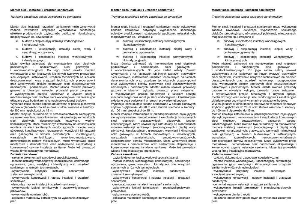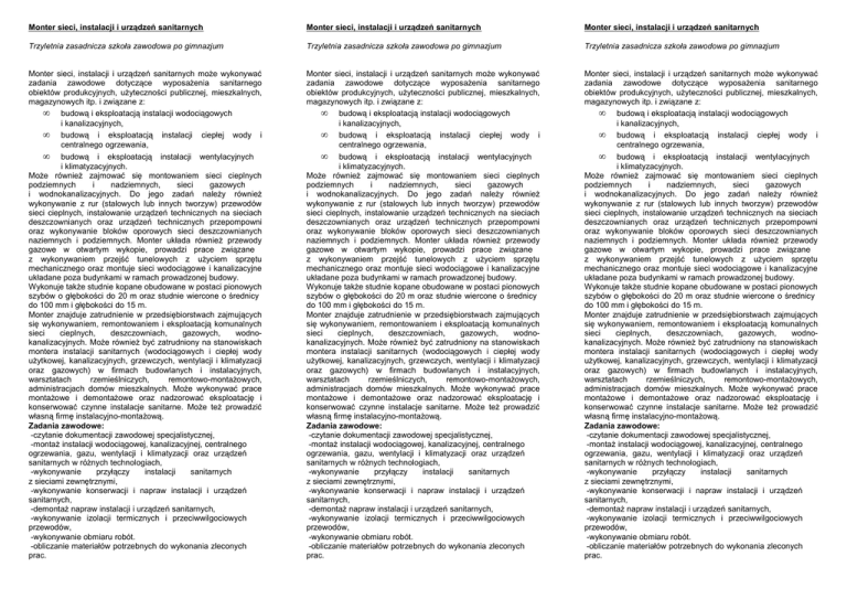 Monter sieci, instalacji i urządzeń sanitarnych Monter sieci, instalacji i urządzeń sanitarnych Monter sieci, instalacji i urządzeń sanitarnych Trzyletnia zasadnicza szkoła zawodowa po gimnazjum Trzyletnia zasadnicza szkoła zawodowa po gimnazjum Trzyletnia zasadnicza szkoła zawodowa po gimnazjum Monter sieci, instalacji i urządzeń sanitarnych może wykonywać zadania zawodowe dotyczące wyposażenia sanitarnego obiektów produkcyjnych, użyteczności publicznej, mieszkalnych, magazynowych itp. i związane z: • budową i eksploatacją instalacji wodociągowych i kanalizacyjnych, • budową i eksploatacją instalacji ciepłej wody i centralnego ogrzewania, • budową i eksploatacją instalacji wentylacyjnych i klimatyzacyjnych. Może również zajmować się montowaniem sieci cieplnych podziemnych i nadziemnych, sieci gazowych i wodnokanalizacyjnych. Do jego zadań należy również wykonywanie z rur (stalowych lub innych tworzyw) przewodów sieci cieplnych, instalowanie urządzeń technicznych na sieciach deszczownianych oraz urządzeń technicznych przepompowni oraz wykonywanie bloków oporowych sieci deszczownianych naziemnych i podziemnych. Monter układa również przewody gazowe w otwartym wykopie, prowadzi prace związane z wykonywaniem przejść tunelowych z użyciem sprzętu mechanicznego oraz montuje sieci wodociągowe i kanalizacyjne układane poza budynkami w ramach prowadzonej budowy. Wykonuje także studnie kopane obudowane w postaci pionowych szybów o głębokości do 20 m oraz studnie wiercone o średnicy do 100 mm i głębokości do 15 m. Monter znajduje zatrudnienie w przedsiębiorstwach zajmujących się wykonywaniem, remontowaniem i eksploatacją komunalnych sieci cieplnych, deszczowniach, gazowych, wodnokanalizacyjnych. Może również być zatrudniony na stanowiskach montera instalacji sanitarnych (wodociągowych i ciepłej wody użytkowej, kanalizacyjnych, grzewczych, wentylacji i klimatyzacji oraz gazowych) w firmach budowlanych i instalacyjnych, warsztatach rzemieślniczych, remontowo-montażowych, administracjach domów mieszkalnych. Może wykonywać prace montażowe i demontażowe oraz nadzorować eksploatację i konserwować czynne instalacje sanitarne. Może też prowadzić własną firmę instalacyjno-montażową. Zadania zawodowe: -czytanie dokumentacji zawodowej specjalistycznej, -montaż instalacji wodociągowej, kanalizacyjnej, centralnego ogrzewania, gazu, wentylacji i klimatyzacji oraz urządzeń sanitarnych w różnych technologiach, -wykonywanie przyłączy instalacji sanitarnych z sieciami zewnętrznymi, -wykonywanie konserwacji i napraw instalacji i urządzeń sanitarnych, -demontaż napraw instalacji i urządzeń sanitarnych, -wykonywanie izolacji termicznych i przeciwwilgociowych przewodów, -wykonywanie obmiaru robót. -obliczanie materiałów potrzebnych do wykonania zleconych prac. Monter sieci, instalacji i urządzeń sanitarnych może wykonywać zadania zawodowe dotyczące wyposażenia sanitarnego obiektów produkcyjnych, użyteczności publicznej, mieszkalnych, magazynowych itp. i związane z: • budową i eksploatacją instalacji wodociągowych i kanalizacyjnych, • budową i eksploatacją instalacji ciepłej wody i centralnego ogrzewania, • budową i eksploatacją instalacji wentylacyjnych i klimatyzacyjnych. Może również zajmować się montowaniem sieci cieplnych podziemnych i nadziemnych, sieci gazowych i wodnokanalizacyjnych. Do jego zadań należy również wykonywanie z rur (stalowych lub innych tworzyw) przewodów sieci cieplnych, instalowanie urządzeń technicznych na sieciach deszczownianych oraz urządzeń technicznych przepompowni oraz wykonywanie bloków oporowych sieci deszczownianych naziemnych i podziemnych. Monter układa również przewody gazowe w otwartym wykopie, prowadzi prace związane z wykonywaniem przejść tunelowych z użyciem sprzętu mechanicznego oraz montuje sieci wodociągowe i kanalizacyjne układane poza budynkami w ramach prowadzonej budowy. Wykonuje także studnie kopane obudowane w postaci pionowych szybów o głębokości do 20 m oraz studnie wiercone o średnicy do 100 mm i głębokości do 15 m. Monter znajduje zatrudnienie w przedsiębiorstwach zajmujących się wykonywaniem, remontowaniem i eksploatacją komunalnych sieci cieplnych, deszczowniach, gazowych, wodnokanalizacyjnych. Może również być zatrudniony na stanowiskach montera instalacji sanitarnych (wodociągowych i ciepłej wody użytkowej, kanalizacyjnych, grzewczych, wentylacji i klimatyzacji oraz gazowych) w firmach budowlanych i instalacyjnych, warsztatach rzemieślniczych, remontowo-montażowych, administracjach domów mieszkalnych. Może wykonywać prace montażowe i demontażowe oraz nadzorować eksploatację i konserwować czynne instalacje sanitarne. Może też prowadzić własną firmę instalacyjno-montażową. Zadania zawodowe: -czytanie dokumentacji zawodowej specjalistycznej, -montaż instalacji wodociągowej, kanalizacyjnej, centralnego ogrzewania, gazu, wentylacji i klimatyzacji oraz urządzeń sanitarnych w różnych technologiach, -wykonywanie przyłączy instalacji sanitarnych z sieciami zewnętrznymi, -wykonywanie konserwacji i napraw instalacji i urządzeń sanitarnych, -demontaż napraw instalacji i urządzeń sanitarnych, -wykonywanie izolacji termicznych i przeciwwilgociowych przewodów, -wykonywanie obmiaru robót. -obliczanie materiałów potrzebnych do wykonania zleconych prac. Monter sieci, instalacji i urządzeń sanitarnych może wykonywać zadania zawodowe dotyczące wyposażenia sanitarnego obiektów produkcyjnych, użyteczności publicznej, mieszkalnych, magazynowych itp. i związane z: • budową i eksploatacją instalacji wodociągowych i kanalizacyjnych, • budową i eksploatacją instalacji ciepłej wody i centralnego ogrzewania, • budową i eksploatacją instalacji wentylacyjnych i klimatyzacyjnych. Może również zajmować się montowaniem sieci cieplnych podziemnych i nadz