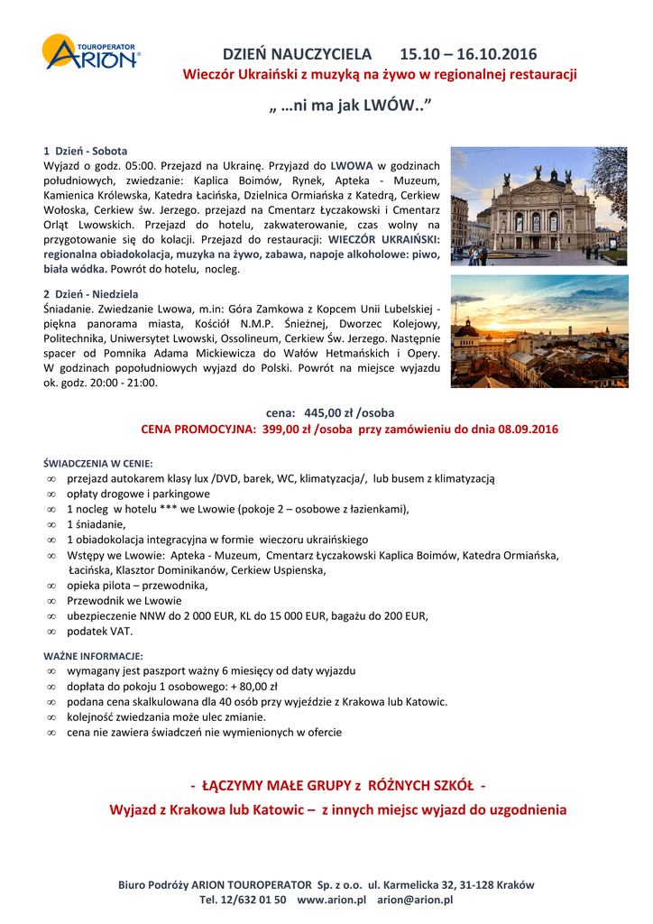 DZIEŃ NAUCZYCIELA 15.10 – 16.10.2016 Wieczór Ukraiński z muzyką na żywo w regionalnej restauracji „ …ni ma jak LWÓW..” 1 Dzień - Sobota Wyjazd o godz. 05:00. Przejazd na Ukrainę. Przyjazd do LWOWA w godzinach południowych, zwiedzanie: Kaplica Boimów, Rynek, Apteka - Muzeum, Kamienica Królewska, Katedra Łacińska, Dzielnica Ormiańska z Katedrą, Cerkiew Wołoska, Cerkiew św. Jerzego. przejazd na Cmentarz Łyczakowski i Cmentarz Orląt Lwowskich. Przejazd do hotelu, zakwaterowanie, czas wolny na przygotowanie się do kolacji. Przejazd do restauracji: WIECZÓR UKRAIŃSKI: regionalna obiadokolacja, muzyka na żywo, zabawa, napoje alkoholowe: piwo, biała wódka. Powrót do hotelu, nocleg. 2 Dzień - Niedziela Śniadanie. Zwiedzanie Lwowa, m.in: Góra Zamkowa z Kopcem Unii Lubelskiej piękna panorama miasta, Kościół N.M.P. Śnieżnej, Dworzec Kolejowy, Politechnika, Uniwersytet Lwowski, Ossolineum, Cerkiew Św. Jerzego. Następnie spacer od Pomnika Adama Mickiewicza do Wałów Hetmańskich i Opery. W godzinach popołudniowych wyjazd do Polski. Powrót na miejsce wyjazdu ok. godz. 20:00 - 21:00. cena: 445,00 zł /osoba CENA PROMOCYJNA: 399,00 zł /osoba przy zamówieniu do dnia 08.09.2016 ŚWIADCZENIA W CENIE: • • • • • • • • • • przejazd autokarem klasy lux /DVD, barek, WC, klimatyzacja/, lub busem z klimatyzacją opłaty drogowe i parkingowe 1 nocleg w hotelu *** we Lwowie (pokoje 2 – osobowe z łazienkami), 1 śniadanie, 1 obiadokolacja integracyjna w formie wieczoru ukraińskiego Wstępy we Lwowie: Apteka - Muzeum, Cmentarz Łyczakowski Kaplica Boimów, Katedra Ormiańska, Łacińska, Klasztor Dominikanów, Cerkiew Uspienska, opieka pilota – przewodnika, Przewodnik we Lwowie ubezpieczenie NNW do 2 000 EUR, KL do 15 000 EUR, bagażu do 200 EUR, podatek VAT. WAŻNE INFORMACJE: • • • • • wymagany jest paszport ważny 6 miesięcy od daty wyjazdu dopłata do pokoju 1 osobowego: + 80,00 zł podana cena skalkulowana dla 40 osób przy wyjeździe z Krakowa lub Katowic. kolejność zwiedzania może ulec zmianie. cena nie zawiera świadczeń nie wymienionych w ofercie - ŁĄCZYMY MAŁE GRUPY z RÓŻNYCH SZKÓŁ Wyjazd z Krakowa lub Katowic – z innych miejsc wyjazd do uzgodnienia Biuro Podróży ARION TOUROPERATOR Sp. z o.o. ul. Karmelicka 32, 31-128 Kraków Tel. 12/632 01 50 www.arion.pl [email protected]