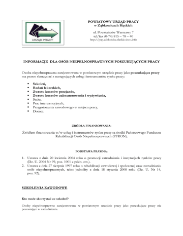 POWIATOWY URZĄD PRACY w Ząbkowicach Śląskich ul. Powstańców Warszawy 7 tel/fax (0-74) 815 – 78 – 40 http://pup.zabkowice.slaskie.sisco.info INFORMACJE DLA OSÓB NIEPEŁNOSPRAWNYCH POSZUKUJĄCYCH PRACY Osoba niepełnosprawna zarejestrowana w powiatowym urzędzie pracy jako poszukująca pracy ma prawo skorzystać z następujących usług i instrumentów rynku pracy: Szkoleń, Badań lekarskich, Zwrotu kosztów przejazdu, Zwrotu kosztów zakwaterowania i wyżywienia, Stażu, Prac interwencyjnych, Przygotowania zawodowego w miejscu pracy, Dotacji. ŹRÓDŁA FINANSOWANIA: Źródłem finansowania w/w usług i instrumentów rynku pracy są środki Państwowego Funduszu Rehabilitacji Osób Niepełnosprawnych (PFRON). PODSTAWA PRAWNA: 1. Ustawa z dnia 20 kwietnia 2004 roku o promocji zatrudnienia i instytucjach rynków pracy (Dz. U. 2004 Nr 99, poz. 1001 z późn. zm.). 2. Ustawa z dnia 27 sierpnia 1997 roku o rehabilitacji zawodowej i społecznej oraz zatrudnianiu osób niepełnosprawnych, tekst jednolity z dnia 18 stycznia 2008 roku (Dz. U. Nr 14, poz. 92). SZKOLENIA ZAWODOWE Kto może skorzystać ze szkoleń? Osoby niepełnosprawne zarejestrowane w powiatowym urzędzie pracy jako poszukujące pracy nie pozostające w zatrudnieniu. Cel szkoleń zawodowych? Celem szkoleń jest zwiększenie szans osób uprawnionych do szkoleń na uzyskanie zatrudnienia lub innej pracy zarobkowej, podwyższenie kwalifikacji zawodowych lub zwiększenie aktywności zawodowej. Zakończenie udziału w szkoleniu wiąże się z uzyskaniem przez uczestnika szkolenia zaświadczenia bądź certyfikatu potwierdzającego zdobycie kwalifikacji. Formy szkoleń zawodowych. Szkolenia zawodowe organizowane są w dwóch formach: • • Grupowa – szkolenia grupowe organizowane zgodnie z planem szkoleń, Indywidualna – w przypadku uprawdopodobnienia zatrudnienia lub podjęcia działalności gospodarczej. BADANIA LEKARSKIE Osoby niepełnosprawne zarejestrowane w powiatowym urzędzie pracy jako poszukujące pracy niepozostające w zatrudnieniu przed uzyskaniem skierowania na szkolenie, na wniosek powiatowego urzędu pracy odbywają badania lekarskie, mające na celu stwierdzenie ogólnej zdolności osoby niepełnosprawnej do podjęcia szkolenia. Koszty tych badań finansowane są ze środków Funduszu PFRON. ZWROT KOSZTÓW PRZEJAZDU Kto może ubiegać się o zwrot kosztów przejazdu? Osoba niepełnosprawna zarejestrowana w powiatowym urzędzie pracy jako poszukująca pracy niepozostająca w zatrudnieniu. Warunki ubiegania się o zwrot kosztów przejazdu. Zwrotu kosztów przejazdu z miejsca zamieszkania i powrotu do miejsca zatrudnienia lub innej pracy zarobkowej, odbywania u pracodawcy stażu, przygotowania zawodowego w miejscu pracy, szkolenia lub odbywania zajęć z zakresu poradnictwa zawodowego może być dokonywany przez okres do 12 miesięcy. O zwrot kosztów przejazdu może ubiegać się osoba, która spełnia łącznie następujące warunki: 1) na podstawie skierowania powiatowego urzędu pracy podjęła zatrudnienie lub inna pracę zarobkową, przygotowanie zawodowe w miejscu pracy, szkolenie, staż lub została skierowana na zajęcia z zakresu poradnictwa zawodowego poza miejscem zamieszkania, 2) uzyskuje wynagrodzenie w wysokości nieprzekraczającej 200% minimalnego wynagrodzenia za pracę. ZWROT KOSZTÓW ZAKWATEROWANIA I WYŻYWIENIA Kto może ubiegać się o zwrot kosztów zakwaterowania? Osoba niepełnosprawna zarejestrowana w powiatowym urzędzie pracy jako poszukująca pracy niepozostająca w zatrudnieniu. Warunki ubiegania się o zwrot kosztów zakwaterowania i wyżywienia. Zwrot kosztów zakwaterowania może być dokonywany przez okres do 12 miesięcy, osobie która spełnia łącznie następujące warunki: 1) na podstawie skierowania powiatowego urzędu pracy podjęła zatrudnienie lub inna pracę zarobkową, staż, przygotowanie zawodowe w miejscu pracy lub szkolenie poza miejscem zamieszkania w miejscowości, do której czas dojazdu i powrotu do miejsca stałego zamieszkania wynosi łącznie ponad 3 godziny dziennie, 2) mieszka w hotelu lub wynajętym mieszkaniu w miejscowości lub w pobliżu miejscowości, w której jest zatrudniona, wykonuje inną pracę zarobkową, odbywa staż lub przygotowanie zawodowe w miejscu pracy, 3) uzyskuje wynagrodzenie w wysokości nieprzekraczajacej 200% minimalnego wynagrodzenia za pracę obowiązującego w miesiącu, za który jest dokonywany zwrot kosztów zakwaterowania. Zwrot kosztów zakwaterowania i wyżywienia osoby uprawnionej, skierowanej na szkolenie odbywane poza miejscem zamieszkania przysługuje, jeżeli wynika to z umowy zawartej z instytucją szkoleniową. Gdzie można uzyskać dodatkowe informacje? Bliższych informacji udziela Powiatowy Urząd Pracy w Ząbkowicach Śląskich, Dział Aktywnych Form Rynku Pracy – pokój szkoleń (niski parter) w poniedziałek, środę, czwartek i piątek w godz. od 7.30 do 15.30 oraz we wtorek od 7.30 do 18.00 lub pod numerem tel. (074) 8 157 840 do 42 wew. 117 oraz drogą e-mailową: [email protected]
