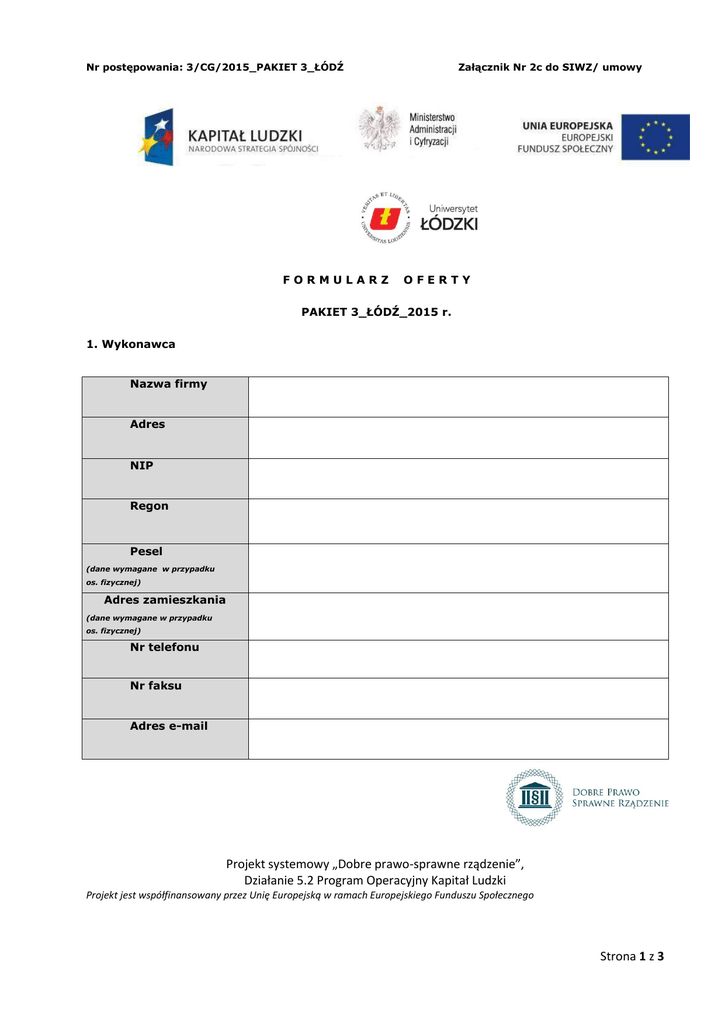 Nr postępowania: 3/CG/2015_PAKIET 3_ŁÓDŹ FORMULARZ Załącznik Nr 2c do SIWZ/ umowy OFERTY PAKIET 3_ŁÓDŹ_2015 r. 1. Wykonawca Nazwa firmy Adres NIP Regon Pesel (dane wymagane w przypadku os. fizycznej) Adres zamieszkania (dane wymagane w przypadku os. fizycznej) Nr telefonu Nr faksu Adres e-mail Projekt systemowy „Dobre prawo-sprawne rządzenie”, Działanie 5.2 Program Operacyjny Kapitał Ludzki Projekt jest współfinansowany przez Unię Europejską w ramach Europejskiego Funduszu Społecznego Strona 1 z 3 Nr postępowania: 3/CG/2015_PAKIET 3_ŁÓDŹ Załącznik Nr 2c do SIWZ/ umowy 2. Zamawiający : Uniwersytet Łódzki, ul. Narutowicza 65, 90-131 Łódź. Wydział Prawa i Administracji, ul. Kopcińskiego 8/12, 90-232 Łódź tel. (42) 635 63 48 3. Przedmiot zamówienia: usługa hotelarska i restauracyjna na potrzeby organizacji szkoleń dla pracowników Jednostek Samorządu Terytorialnego w Krakowie oraz na potrzeby seminarium dla członków Samorządowych Kolegiów Odwoławczych w Krakowie, w ramach projektu „Dobre prawo - sprawne rządzenie” Działanie 5.2 PO KL 4. Wartość oferty brutto w złotych polskich: Pakiet nr 3: Cena brutto (w zł): ……………………………………………………………………… Słownie :……………………………………………………………………………………………………………………………..…..… 5. Pożądany termin realizacji zamówienia: w dniach oraz w dniach 05-06 maja 2015 r. (szkolenie nr 1 i 2) 20-21 maja 2015 r. (szkolenie nr 3 i 4), zgodnie z harmonogramem, wskazanym w Załączniku nr 1 i 1c do SIWZ 6. Składający ofertę oświadcza, że: po zapoznaniu się z warunkami zamówienia przedstawionymi w SIWZ w pełni je akceptuje i nie wnosi do nich zastrzeżeń, akceptuje 30. dniowy termin związania ofertą liczony od daty ostatecznego składania ofert, w przypadku wybrania jego oferty jako najkorzystniejszej zobowiązuje się do zawarcia umowy zgodnej z projektem przedstawionym w Załączniku nr 5 do SIWZ, w oparciu o stawki zaoferowane w pkt 7. niniejszego Formularza oferty, w terminie i miejscu wyznaczonym przez Zamawiającego, akceptuje terminy wykonywania usługi, do oferty załącza (proszę zaznaczyć i uzupełnić w przypadku załączenia odpowiedniego dokumentu): decyzja Marszałka Województwa o zaszeregowaniu hotelu do odpowiedniej kategorii, inne ………………………………………………………………………………………………………………….. …………………………………………………………………………………………………………………… …………………………………………………………………………………………………………………… Data............................... ..................................................... Podpis i pieczęć Wykonawcy bądź osoby uprawnionej do występowania w jego imieniu Strona 2 z 3 Nr postępowania: 3/CG/2015_PAKIET 3_ŁÓDŹ Załącznik Nr 2c do SIWZ/ umowy 7. A r k u s z c e n o w y Pakiet nr 3: Szkolenie pracowników Jednostek Samorządu Terytorialnego w Łodzi rodzaj usługi stawka jednostkowa liczba Wartość wynagrodzenia w zł brutto w zł brutto 1 2 zakwaterowanie (z wliczonym śniadaniem) (2 x 3) 4 3 88 noclegów 352 serwisy wyżywienie (serwis kawowy) 176 wyżywienie (obiad) obiadów 8 wynajem sal konferencyjnych najmów RAZEM (proszę wstawić do pkt 4. Formularza ofertowego) 8. O F E R O W A N E P A R A M E T R Y (proszę wpisać bądź zaznaczyć opcję wyboru): Nazwa, adres i lokalizacja hotelu/ośrodka: ........................................................................................................ ............................................................................................................................................................. . ............................................................................................................................................................ , Kategoria: ..................................... (proszę wpisać liczba przyznanych gwiazdek i proszę załączyć odpowiedni dokument, a w przypadku nieposiadania kategorii wpisać „bez kategorii”) Parking (liczba miejsc).......................................................................................................................................... , Dojazd komunikacją miejską (rodzaj, liczba linii) ................................................................................................. ............................................................................................................................................................................. , Sale restauracyjne (liczba miejsc, lokalizacja) ...................................................................................................... ............................................................................................................................................................................. , Sale konferencyjne: • Wyposażenie pokoju: /proszę obowiązkowo wypełnić i zaznaczyć (odpowiednio poprzez wpisanie bądź skreślenie) odpowiednie opcje w tabeli poniżej/ Sale konferencyjne liczba osób (pierwsza sala)…... rzutnik multimed. tak/nie ekran do projekcji tak/nie flipchart (blok, pisaki) Wyposażenie pokoju nocny stolik tak/nie lampka nocna tak/nie krzesła tak/nie tak/nie telewizor klimatyzacja tak/nie tak/nie biurko zaciemnienie tak/nie tak/nie łazienka (prysznic i umywalka) tak/nie wymiana ręczników (druga sala) …... tak/nie tak/nie tak/nie tak/nie tak/nie tak/nie ............................................ Podpis i pieczęć Wykonawcy Strona 3 z 3