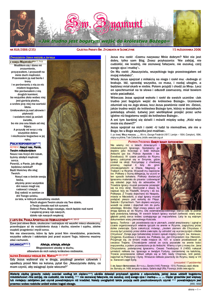 Sw. Zygmunt «Jak trudno jest bogatym wejść do królestwa Bożego» NR XLII/2006 (23 (235) GAZETKA PARAFII ŚW. ZYGMUNTA W SŁOMCZYNIE DWUDZIESTA ÓSMA NIEDZIELA ZWYKŁA Z KSIĘGI MĄDROŚCIMdr 7, 7-11 Modliłem się i dano mi zrozumienie, przyzywałem, i przyszedł na mnie duch mądrości. Przeniosłem ją nad berła i trony i w porównaniu z nią za nic miałem bogactwa. Nie porównałem z nią drogich kamieni, bo wszystko złoto wobec niej jest garścią piasku, a srebro przy niej ma wartość błota. Umiłowałem ją nad zdrowie i piękność i wolałem mieć ją aniżeli światło, bo nie zna snu blask od niej bijący. A przyszły mi wraz z nią wszystkie dobra i niezliczone bogactwa w jej ręku. P SALM RESPONSORYJNYPs 90 REFREN: Nasyć nas, Panie, Twoim miłosierdziem Naucz nas liczyć dni nasze, byśmy zdobyli mądrość serca. Powróć, o Panie, jak długo będziesz zwlekał? Bądź litościwy dla sług Twoich. Nasyć nas o świcie swoją łaską, abyśmy przez wszystkie dni nasze mogli się radować i cieszyć. Daj radość w zamian za dni Twego ucisku, za lata, w których zaznaliśmy niedoli. Niech sługom Twoim ukaże się Twe dzieło, a Twoja chwała nad ich synami. Dobroć Pana, Boga naszego, niech będzie nad nami i wspieraj pracę rąk naszych, dzieło rąk naszych wspieraj. Z LISTU ŚW. PAWŁA APOSTOŁA DO HEBRAJCZYKÓWHbr 4, 12-13 Żywe jest słowo Boże, skuteczne i ostrzejsze niż wszelki miecz obosieczny, przenikające aż do rozdzielenia duszy i ducha, stawów i szpiku, zdolne osądzić pragnienia i myśli serca. Nie ma stworzenia, które by było przed Nim niewidzialne, przeciwnie, wszystko odkryte i odsłonięte jest przed oczami Tego, któremu musimy zdać rachunek. AKLAMACJAMt 5, 3 Alleluja, alleluja, alleluja Błogosławieni ubodzy w duchu, albowiem do nich należy królestwo niebieskie. SŁOWA EWANGELII WEDŁUG ŚW. MARKAMk 10, 17-27 Gdy Jezus wybierał się w drogę, przybiegł pewien człowiek i upadłszy przed Nim na kolana, pytał Go: „Nauczycielu dobry, co mam czynić, aby osiągnąć życie wieczne?” 15 PAŹDZIERNIKA 2006 Jezus mu rzekł: «Czemu nazywasz Mnie dobrym? Nikt nie jest dobry, tylko sam Bóg. Znasz przykazania: ‘Nie zabijaj, nie cudzołóż, nie kradnij, nie zeznawaj fałszywie, nie oszukuj, czcij swego ojca i matkę’». On Mu rzekł: „Nauczycielu, wszystkiego tego przestrzegałem od mojej młodości”. Wtedy Jezus spojrzał z miłością na niego i rzekł mu: «Jednego ci brakuje. Idź, sprzedaj wszystko, co masz, i rozdaj ubogim, a będziesz miał skarb w niebie. Potem przyjdź i chodź za Mną». Lecz on spochmurniał na te słowa i odszedł zasmucony, miał bowiem wiele posiadłości. Wówczas Jezus spojrzał wokoło i rzekł do swoich uczniów: «Jak trudno jest bogatym wejść do królestwa Bożego». Uczniowie zdumieli się na Jego słowa, lecz Jezus powtórnie rzekł im: «Dzieci, jakże trudno wejść do królestwa Bożego tym, którzy w dostatkach pokładają ufność. Łatwiej jest wielbłądowi przejść przez ucho igielne niż bogatemu wejść do królestwa Bożego». A oni tym bardziej się dziwili i mówili między sobą: „Któż więc może się zbawić?” Jezus spojrzał na nich i rzekł: «U ludzi to niemożliwe, ale nie u Boga; bo u Boga wszystko jest możliwe». il. po lewej: WIELE POSIADAŁ …, WATTS, George Frederick (1817, Londyn – 1904, Compton), 1894, olejny na płótnie, Tate Collections; źródło www.tate.org.uk PATRON TYGODNIA: ŚWIĘTY IGNACY ANTIOCHEŃSKI Nie wiemy nic o latach dziecięcych i młodzieńczych Ignacego. Spotykamy go dopiero jako trzeciego z kolei biskupa Antiochii (po św. Piotrze Apostole i św. Ewodiuszu). W czasie podróży do Rzymu Ignacy zatrzymał się w Smyrnie, gdzie czekał na okręt. Korzystając z chwilowej przerwy, napisał 4 listy do gmin chrześcijańskich: w Efezie, Magnezji, w Trallach i w Rzymie. Wyszedł mu naprzeciw św. Polikarp z liczną delegacją, by uczcić w ten sposób bohatera. Polikarp dostarczył Ignacemu materiału do pisania i zobowiązał się odesłać jego listy do adresatów. W Troadzie Ignacy musiał ponownie przesiąść się na inny okręt. Skorzystał z okazji, by napisać listy do Filadelfii, Smyrny i do św. Polikarpa. Z Troady dojechano do Neapolu, miasta w Macedonii, a stąd Ignacy musiał podążać pieszo pod eskortą do Filippi, Salonik i Dyrrachium. Tam dopiero wszyscy wsiedli na statek i dojechali nim do portu włoskiego, Brindisi. Stąd znowu pieszo szli drogą lądową aż do Rzymu. Dla osiemdziesięcioletniego starca cała ta podróż była prawdziwą katorgą. W swoich listach Ignacy wyraził żarliwość wiary oraz głęboki pokój serca wobec czekającego go męczeństwa. Listy te są ważnym dokumentem wiary pierwotnego Kościoła. Ignacy, Teoforos - jak przedstawia się w pismach, został aresztowany i zginął w czasie organizowanych właśnie igrzysk na arenie w Rzymie, zagryziony przez dzikie zwierząta. Życie zakończył, mówiąc, „Jestem ziarnem dla Chrystusa. I muszę być przeżuty przez dzikie zwierzęta, by odrodzić się w przeczystym chlebie Chrystusa”. Dzieje jego bohaterskiej śmierci opisali między innymi: św. Ireneusz, Orygenes, Euzebiusz z Cezarei, św. Polikarp, św. Jan Chryzostom i św. Hieronim. Przyjmuje się, że śmierć miała miejsce ok. 107, w czasie prześladowań za cesarza Trajana. Chrześcijanie zebrali ze czcią pozostałe na arenie kości męczennika, a potem przewieziono je do Antiochii. Wiemy o tym z mowy św. Jana Chryzostoma, poświęconej Ignacemu. Cesarz Teodozjusz II (†450) nakazał umieścić relikwie św. Ignacego w świątyni Fortuny, zamienionej na katolicką. Trzecie przeniesienie relikwii odbyło się w 540, kiedy Chozroes, król perski. najechał na Palestynę i Syrię. Wreszcie relikwie powróciły do Rzymu, kiedy w VII w. Saraceni zajęli Syrię. (uroczystość 17 października) il. ŚW . I GNACY ANTIOCHEŃSKI ; BOTTICELLI , Sandro (1445, Florencja - 1510, Florencja),