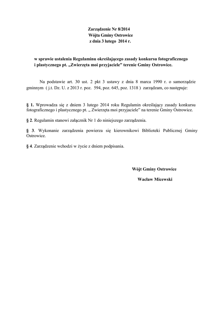 Zarządzenie Nr 8/2014 Wójta Gminy Ostrowice z dnia 3 lutego 2014 r. w sprawie ustalenia Regulaminu określającego zasady konkursu fotograficznego i plastycznego pt. „Zwierzęta moi przyjaciele” terenie Gminy Ostrowice. Na podstawie art. 30 ust. 2 pkt 3 ustawy z dnia 8 marca 1990 r. o samorządzie gminnym ( j.t. Dz. U. z 2013 r. poz. 594, poz. 645, poz. 1318 ) zarządzam, co następuje: § 1. Wprowadza się z dniem 3 lutego 2014 roku Regulamin określający zasady konkursu fotograficznego i plastycznego pt. „ Zwierzęta moi przyjaciele” na terenie Gminy Ostrowice. § 2. Regulamin stanowi załącznik Nr 1 do niniejszego zarządzenia. § 3. Wykonanie zarządzenia powierza się kierownikowi Biblioteki Publicznej Gminy Ostrowice. § 4. Zarządzenie wchodzi w życie z dniem podpisania. Wójt Gminy Ostrowice Wacław Micewski