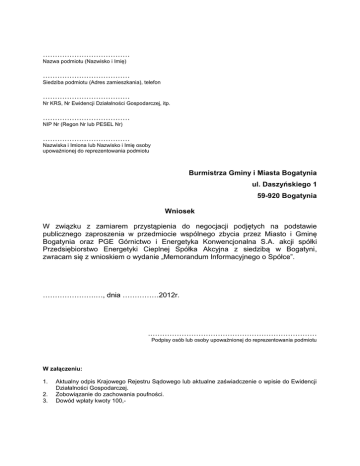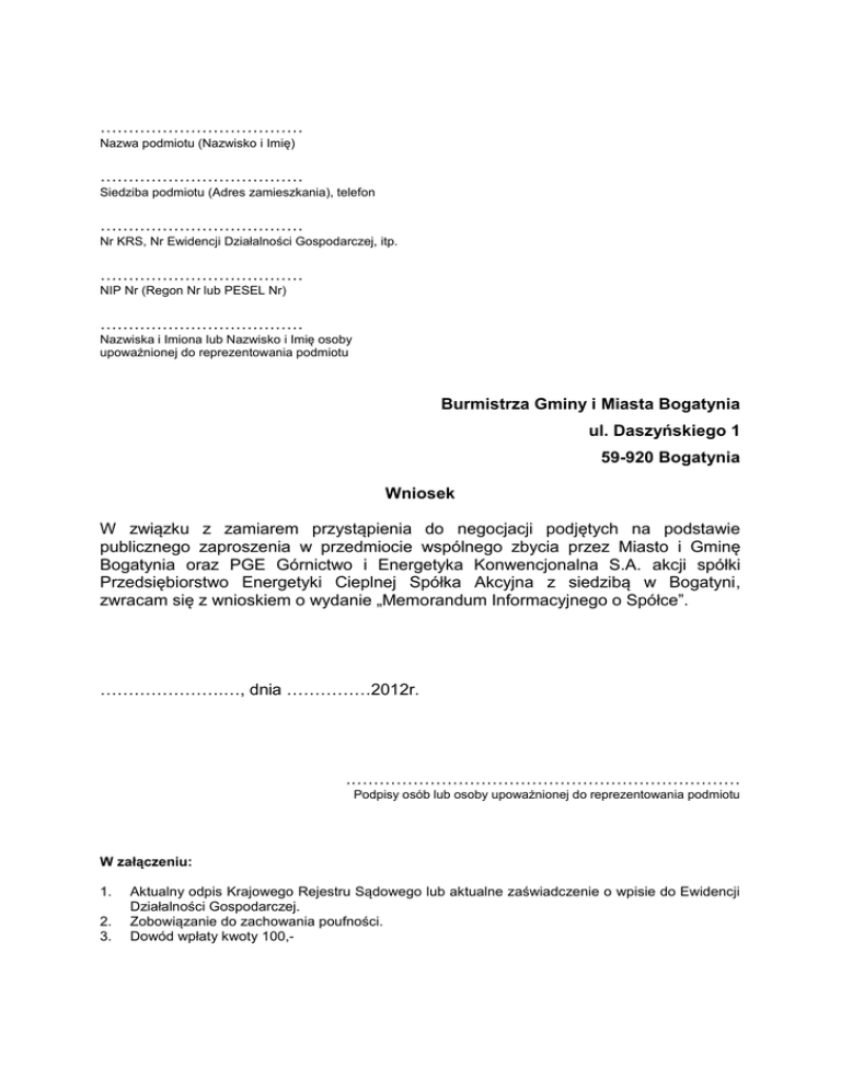 ……………………………… Nazwa podmiotu (Nazwisko i Imię) ……………………………… Siedziba podmiotu (Adres zamieszkania), telefon ……………………………… Nr KRS, Nr Ewidencji Działalności Gospodarczej, itp. ……………………………… NIP Nr (Regon Nr lub PESEL Nr) ……………………………… Nazwiska i Imiona lub Nazwisko i Imię osoby upoważnionej do reprezentowania podmiotu Burmistrza Gminy i Miasta Bogatynia ul. Daszyńskiego 1 59-920 Bogatynia Wniosek W związku z zamiarem przystąpienia do negocjacji podjętych na podstawie publicznego zaproszenia w przedmiocie wspólnego zbycia przez Miasto i Gminę Bogatynia oraz PGE Górnictwo i Energetyka Konwencjonalna S.A. akcji spółki Przedsiębiorstwo Energetyki Cieplnej Spółka Akcyjna z siedzibą w Bogatyni, zwracam się z wnioskiem o wydanie „Memorandum Informacyjnego o Spółce”. ………………….…, dnia ……………2012r. .…………………………………………………………… Podpisy osób lub osoby upoważnionej do reprezentowania podmiotu W załączeniu: 1. 2. 3. Aktualny odpis Krajowego Rejestru Sądowego lub aktualne zaświadczenie o wpisie do Ewidencji Działalności Gospodarczej. Zobowiązanie do zachowania poufności. Dowód wpłaty kwoty 100,- Zobowiązanie do zachowania poufności ………………………………………………………………………………….………………. ……………………………………………………………………………………….…………. (pełne dane podmiotu) w związku z zamiarem przystąpienia do negocjacji podjętych na podstawie publicznego zaproszenia w przedmiocie wspólnego zbycia przez Miasto i Gminę Bogatynia oraz PGE Górnictwo i Energetyka Konwencjonalna S.A. akcji spółki Przedsiębiorstwo Energetyki Cieplnej Spółka Akcyjna z siedzibą w Bogatyni, niniejszym oświadczam, iż zobowiązuję się do zachowania w tajemnicy wszelkich informacji uzyskanych w związku z zamiarem kupna akcji, w szczególności wynikających z treści dokumentów informujących o stanie Spółki, w tym „Memorandum Informacyjnego o Spółce”. ………………….. , dnia ………….. .…………………………………………………………… Podpisy osób/osoby upoważnionych/ej do reprezentowania podmiotu