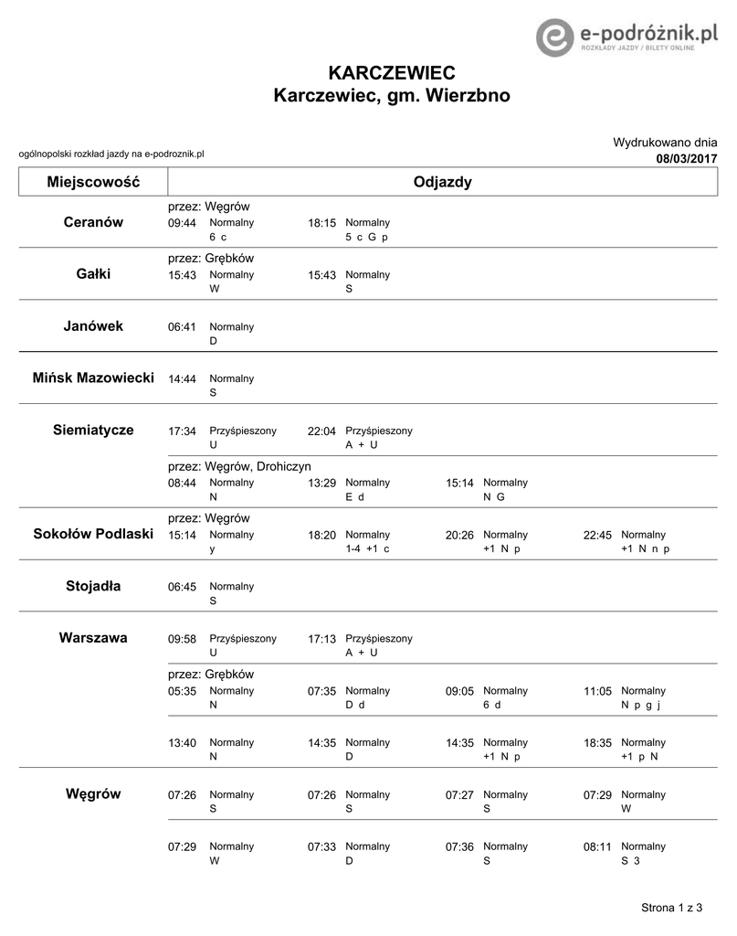 KARCZEWIEC Karczewiec, gm. Wierzbno Wydrukowano dnia 08/03/2017 ogólnopolski rozkład jazdy na e-podroznik.pl Miejscowość Odjazdy przez: Węgrów Ceranów 09:44 Normalny 6 c 18:15 Normalny 5 c G p przez: Grębków Gałki 15:43 Normalny W Janówek 06:41 Normalny D Mińsk Mazowiecki 14:44 Normalny S Siemiatycze 17:34 Przyśpieszony U 15:43 Normalny S 22:04 Przyśpieszony A + U przez: Węgrów, Drohiczyn 08:44 Normalny N 13:29 Normalny E d 15:14 Normalny N G przez: Węgrów Sokołów Podlaski 15:14 Normalny y Stojadła 06:45 Normalny S Warszawa 09:58 Przyśpieszony U 18:20 Normalny 1-4 +1 c 20:26 Normalny +1 N p 22:45 Normalny +1 N n p 17:13 Przyśpieszony A + U przez: Grębków 05:35 13:40 Węgrów 07:26 07:29 Normalny N 07:35 Normalny Normalny N 14:35 Normalny Normalny S 07:26 Normalny 07:27 Normalny 07:29 Normalny S S W Normalny W 07:33 Normalny 07:36 Normalny 08:11 Normalny D S D d D 09:05 Normalny 6 d 14:35 Normalny +1 N p 11:05 Normalny N p g j 18:35 Normalny +1 p N S 3 Strona 1 z 3 KARCZEWIEC Karczewiec, gm. Wierzbno Wydrukowano dnia 08/03/2017 ogólnopolski rozkład jazdy na e-podroznik.pl Miejscowość Odjazdy 08:11 09:49 15:14 18:20 Normalny S ł 08:41 Normalny 08:44 Normalny S N Normalny S 13:29 Normalny 14:17 Normalny 14:54 Normalny S W Normalny N G 15:14 Normalny 16:26 Normalny 18:15 Normalny y S Normalny 1-4 +1 c 20:26 Normalny 22:45 Normalny E d +1 N p 09:44 Normalny 6 c 5 c G p +1 N n p przez: Wierzbno 07:52 Normalny S przez: Czerwonka 14:04 Normalny S 3 14:04 Normalny S ł Oznaczenia + Kursuje w dni wolne od pracy (niedziele i święta) +1 kursuje w dni wolne od pracy (niedziele i święta) 1-4 kursuje od poniedziałku do czwartku 3 KURSUJE W ŚRODY 5 kursuje w piątki 6 kursuje w soboty A Kursuje od poniedziałku do piątku D kursuje od poniedziałku do piątku oprócz świąt E kursuje od poniedziałku do soboty oprócz świąt G nie kursuje 24 i 31 grudnia N NIE KURSUJE 25 XII i I DZIEŃ ŚWIĄT WIELKANOCNYCH S kursuje w dni nauki szkolnej U nie kursuje 25.XII, 1.I, 1-dzień Wielkanocy W kursuje od poniedziałku do piątku w okresie ferii letnich, zimowych, przerw c nie kursuje w dniu 1.I, w pierwszy dzień Świąt Wielkanocnych oraz w dniach 25 i 26 d nie kursuje w dniu 01.I, w pierwszy i drugi dzień Świąt Wielkanocnych oraz w dniach g nie kursuje w dniu 24.XII j nie kursuje w dniu 07.01 n NIE KURSUJE 24 i 31 XII ORAZ W WIELKĄ SOBOTĘ p nie kursuje 6.01 y kursuje dnia 24.12 i 31.12 ł nie kursuje w środy