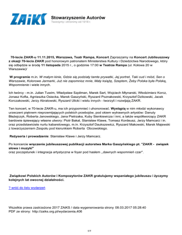 70-lecie ZAKR-u 11.11.2015, Warszawa, Teatr Rampa, Koncert Zapraszamy na Koncert Jubileuszowy z okazji 70-lecia ZAKR pod honorowym patronatem Ministerstwa Kultury i Dziedzictwa Narodowego, który się odbędzie w środę 11 listopada 2015 r., o godzinie 17:00 w Teatrze Rampa (ul. Kołowa 20 w Warszawie)/ W programie m.in. W małym kinie, Gdzie się podziały tamte prywatki, Jej portret, Taki cud i miód, Sen o Warszawie, Kolorowe Jarmarki, Już nie zapomnisz mnie, Mały książę, Szeptem, Żeby Polska była Polską, Wspomnienie i wiele innych. Ich twórcy - m.in. Julian Tuwim, Władysław Szpilman, Marek Sart, Wojciech Młynarski, Włodzimierz Korcz, Jonasz Kofta, Agnieszka Osiecka, Marek Gaszyński, Ryszard Poznakowski, Krzysztof Dzikowski, Jacek Korczakowski, Jerzy Abratowski, Ryszard Ulicki i wielu innych - tworzyli i rozwijają ZAKR. Ten koncert, w 70-lecie ZAKR-u, ma ich przypomnieć i uhonorować. Wystąpią w nim młodzi wykonawcy urzeczeni pięknem nieprzemijających polskich przebojów, pod okiem wytrawnych artystów: Danuty Błażejczyk, Roberta Janowskiego, Jana Pietrzaka, Kuby Sienkiewicza i inni, a także współtworzący ZAKR bardowie śpiewający własne utwory: Piotr Bakal, Stanisław Klawe, Tomasz Kordeusz, Jerzy Mamcarz i in. oraz przedstawiciele nurtu kabaretowego, m.in. Krzysztof Daukszewicz, Ryszard Makowski, Marek Majewski z towarzyszeniem Zespołu pod kierunkiem Roberta Obcowskiego. Reżyseria i prowadzenie: Stanisław Klawe i Jerzy Mamcarz. Po koncercie wręczenie jubileuszowej publikacji autorstwa Marka Gaszyńskiego pt. "ZAKR - związek słowa i muzyki" oraz poczęstunek i integracja artystyczna w foyer pod hasłem ,,dawnych wspomnień czar''. Związkowi Polskich Autorów i Kompozytorów ZAKR gratulujemy wspaniałego jubileuszu i życzymy kolejnych lat owocnej działalności. ? wróć do listy wydarzeń Wszelkie prawa zastrzeżone 2017 ZAiKS / data wygenerowania strony 08.03.2017 05:28:40 PDF ze strony: http://zaiks.org.pl/wydarzenia,406 1/1