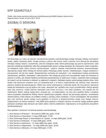 KPP SZAMOTUŁY Źródło: http://www.szamotuly.policja.gov.pl/w26/prewencja/128483,Zadbaj-o-Seniora.html Wygenerowano: Środa, 8 marca 2017, 05:32 ZADBAJ O SENIORA Od dłuższego już czasu do domów mieszkańców powiatu szamotulskiego pukają różnego rodzaju nieznajome osoby. Jedne roznoszą ulotki, drugie proszą o pomoc dla innych osób a jeszcze inne oferują do sprzedaży różnego rodzaju towary i przedmioty. Jest też kategoria osób, które podszywają się pod te wymienione i pod pozorem podobnej działalności albo bez jakiegokolwiek pozoru usiłują wtargnąć do mieszkania celem kradzieży. To kategoria osób, którą chcemy zainteresować i polecić uwadze mieszkańców powiatu szamotulskiego. Najczęściej osoby takie trafiają do domów gdzie mieszkają osoby starsze, niedosłyszące, mające problemy z poruszaniem się lub bez opieki. Bezpardonowo wchodzą do mieszkań i nie niepokojone kradną przedmioty wartościowe, portfele z pieniędzmi i dokumentami. Nie ostają się przed nimi oszczędności wielu lat schowane w pościeli w szafie, jak również telefony komórkowe pozostawione w widocznym miejscu. Zjawisko takie występuje od małych wsi do mieszkań w blokach w większych miastach. Złodzieje zawsze wykorzystają otwarte drzwi, brak opieki nad starszymi osobami oraz ich łatwowierność a w końcu nieporadność jak również chęć niesienia pomocy osobom jej poszukującym. Wiele razy senior poproszony o szklankę wody lub inną pomoc wpuszcza osobę do mieszkania a po jej wyjściu nie może „doszukać się” portfela oraz innych przedmiotów. Policja apeluje więc aby seniorzy, osoby starsze zamykały swe drzwi na klucz i nie ufały każdemu, kto zapuka do ich mieszkania. Warto, widząc osoby obce „kręcące się „ w miejscowości, na ulicy lub w pobliżu domu, o każdym takim przypadku zawiadomić Policję. Numer rejestracyjny pojazdu, którym się poruszają zapisany i przekazany dzielnicowemu może okazać się źródłem wiedzy o sprawcy wielu kradzieży i innych przestępstw. Nie pozwólmy aby nasi seniorzy jesień swego życia spędzali w strachu o bezpieczeństwo swoje oraz swego mienia. Zaplanowano na koniec kwietnia i maj 2009 serię spotkań w klubach seniora na terenie całego powiatu gdzie policjanci przekażą rady starszym jak radzić sobie z takimi problemami. Zapraszamy na te spotkania wszystkich zainteresowanych. Plan spotkań z seniorami na terenie powiatu szamotulskiego 1. Klub Seniora w Pniewach – 30 kwietnia 2009 roku godz. 15.00 2. Klub Seniora w Dusznikach- 5 maja 2009 godz. 17.00 3. Dom Dziennego Pobytu w Szamotułach ul. Lipowa – 6 maja 2009 godz. 14.00 4. Klub Seniora w Piotrowie – 6 maja 2009 godz. 19.00 5. Klub Seniora w Kaźmierzu – 11 maja 2009 roku godz. 10.00 6. Klub Seniora w Słopanowie – 12 maja 2009 roku godz. 16.00 7. Klub Seniora w Obrzycku- 21 maja 2009 godz. 17.00 8. Klub Seniora w Ostrorogu -28 maja 2009 roku godz. 16.00 9. Stowarzyszenie Emerytów i Rencistów w Szamotułach- 2 czerwca 2009 roku godz. 10.00 Zapraszamy wszelkiego rodzaju stowarzyszenia i kluby skupiające wokół siebie seniorów do współpracy, ponieważ plan nie jest zamknięty. Poniżej zamieszczamy treść ulotki jaka kolportowana jest dzięki uprzejmości Dyrektorów i Kierowników OPS, a która powstała dzięki pomocy Starostwa Powiatowego w Szamotułach oraz Ośrodków Pomocy Społecznej na terenie Powiatu Szamotulskiego. Dobre Rady dla Seniora ● ● ● ● ● ● ● ● ● ● ● ● ● ● ● ● ● ● ● ● ● Zamknij drzwi i furtkę na posesję, utrudnisz wejście złodziejowi Ważne klucze miej zawsze przy sobie, nie zostawiaj pod wycieraczką lub w doniczce Nie przechowuj większej ilości pieniędzy w domu, spisuj wszystkie wydatki Nie chowaj pieniędzy w pościeli a biżuterię nie przechowuj przy lustrze w szkatułce Nie pożyczaj pieniędzy i nie dawaj obcym Nie wpuszczaj do domu osób, których nie znasz, pomocy, wody możesz udzielić na podwórzu Miej zawsze kontakt telefoniczny z rodziną i znajomymi Telefon staraj się mieć zawsze blisko siebie a numery alarmowe „pod ręką” Portfel kładź zawsze do szuflady, nigdy nie na stół lub szafkę Nie ufaj handlującym obwoźnie osobom Niezapowiedziane wizyty obcych traktuj z dystansem Decyzje finansowe podejmuj po konsultacji z wiarygodną osobą Informacje dotyczące „szczęsliwych losowań i wygranych traktuj z dystansem Nie płać „z góry” lub zaliczkowo za usługę lub towar Nie kupuj lekarstw poza apteką Nie przyjmuj poczęstunku od osób obcych Staraj się zapamiętać wygląd i ubiór osób które odwiedziły cię bez powodu Notuj numery rejestracyjne samochodów, którymi poruszają się obcy Nie wierz i nie dawaj pieniędzy osobom podającym się za znajomych lub rodzinę, których nie rozpoznajesz z całą pewnością W wypadku gdy potrzebujesz pomocy pamiętaj numery telefonów 112, 997, 998 i 999 Przedstawiaj się i podawaj adres gdy prosisz o pomoc Ocena: 0/5 (0) Tweetnij