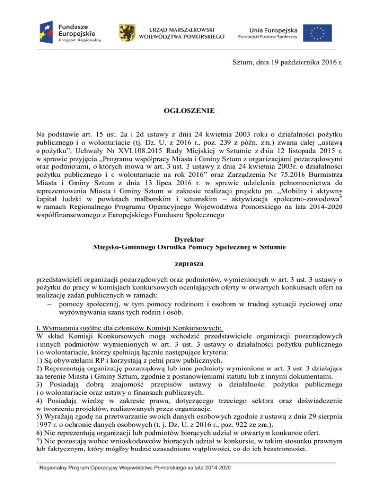 Sztum, dnia 19 października 2016 r. OGŁOSZENIE Na podstawie art. 15 ust. 2a i 2d ustawy z dnia 24 kwietnia 2003 roku o działalności pożytku publicznego i o wolontariacie (tj. Dz. U. z 2016 r., poz. 239 z późn. zm.) zwana dalej „ustawą o pożytku”, Uchwały Nr XVI.108.2015 Rady Miejskiej w Sztumie z dnia 12 listopada 2015 r. w sprawie przyjęcia „Programu współpracy Miasta i Gminy Sztum z organizacjami pozarządowymi oraz podmiotami, o których mowa w art. 3 ust. 3 ustawy z dnia 24 kwietnia 2003r. o działalności pożytku publicznego i o wolontariacie na rok 2016” oraz Zarządzenia Nr 75.2016 Burmistrza Miasta i Gminy Sztum z dnia 13 lipca 2016 r. w sprawie udzielenia pełnomocnictwa do reprezentowania Miasta i Gminy Sztum w zakresie realizacji projektu pn. „Mobilny i aktywny kapitał ludzki w powiatach malborskim i sztumskim – aktywizacja społeczno-zawodowa” w ramach Regionalnego Programu Operacyjnego Województwa Pomorskiego na lata 2014-2020 współfinansowanego z Europejskiego Funduszu Społecznego Dyrektor Miejsko-Gminnego Ośrodka Pomocy Społecznej w Sztumie zaprasza przedstawicieli organizacji pozarządowych oraz podmiotów, wymienionych w art. 3 ust. 3 ustawy o pożytku do pracy w komisjach konkursowych oceniających oferty w otwartych konkursach ofert na realizację zadań publicznych w ramach: pomocy społecznej, w tym pomocy rodzinom i osobom w trudnej sytuacji życiowej oraz wyrównywania szans tych rodzin i osób. I. Wymagania ogólne dla członków Komisji Konkursowych: W skład Komisji Konkursowych mogą wchodzić przedstawiciele organizacji pozarządowych i innych podmiotów wymienionych w art. 3 ust. 3 ustawy o działalności pożytku publicznego i o wolontariacie, którzy spełniają łącznie następujące kryteria: 1) Są obywatelami RP i korzystają z pełni praw publicznych. 2) Reprezentują organizację pozarządową lub inne podmioty wymienione w art. 3 ust. 3 działające na terenie Miasta i Gminy Sztum, zgodnie z postanowieniami statutu lub z innymi dokumentami. 3) Posiadają dobrą znajomość przepisów ustawy o działalności pożytku publicznego i o wolontariacie oraz ustawy o finansach publicznych. 4) Posiadają wiedzę w zakresie prawa, dotyczącego trzeciego sektora oraz doświadczenie w tworzeniu projektów, realizowanych przez organizacje. 5) Wyrażają zgodę na przetwarzanie swoich danych osobowych zgodnie z ustawą z dnia 29 sierpnia 1997 r. o ochronie danych osobowych (t. j. Dz. U. z 2016 r., poz. 922 ze zm.). 6) Nie reprezentują organizacji lub podmiotów biorących udział w otwartym konkursie ofert. 7) Nie pozostają wobec wnioskodawców biorących udział w konkursie, w takim stosunku prawnym lub faktycznym, który mógłby budzić uzasadnione wątpliwości, co do ich bezstronności. 8) Dostarczą formularz zgłoszeniowy, stanowiący załącznik nr 1 do ogłoszenia, podpisany i wypełniony przez podmiot zgłaszający kandydata, jak również przez samego kandydata. II. Udział w pracach Komisji Konkursowych jest nieodpłatny i za udział w posiedzeniu komisji jej członkom nie przysługuje zwrot kosztów podróży. III. Zgłoszenia kandydatów na członków Komisji Konkursowych podpisane przez zainteresowaną osobę oraz organizację zgłaszającą należy przesłać na adres: Miejsko-Gminny Ośrodek Pomocy Społecznej w Sztumie ul. Mickiewicza 39 82-400 Sztum lub złożyć w sekretariacie MGOPS w Sztumie pok. nr 11, w terminie do 26.10.2016 r., do godz. 15:00. Osobą do kontaktu jest: Teresa Bieniek, Inspektor – Koordynator Działu Projektów MGOPS w Sztumie tel.: 55-640-63-67, e-mail: [email protected] IV. Wybór kandydatów do prac w Komisjach Konkursowych: l. Ze zgłoszonych kandydatów zostanie wybranych dwóch członków, reprezentujących podmioty wymienione w przywołanej ustawie, do udziału w pracach Komisji Konkursowych, powołanych przez Dyrektora Miejsko-Gminnego Ośrodka Pomocy Społecznej w Sztumie zgodnie z upoważnieniem Burmistrza Miasta i Gminy Sztum w drodze zarządzenia. 2. Jeżeli wybrani członkowie Komisji Konkursowych oceniający złożone oferty, nie będą mogli uczestniczyć w ocenie ofert, wówczas zgodnie z art.15 ust. 2a i 2da ustawy, Komisje Konkursowe będą działać bez ich udziału. 3. Zgodnie z art. 15 ust. 2da ustawy o działalności pożytku publicznego i o wolontariacie Komisje Konkursowe mogą działać bez udziału osób wskazanych przez organizacje pozarządowe lub podmioty wymienione w art. 3 ust. 3 ustawy, jeżeli: 1) żadna organizacja nie wskaże osób do składu komisji konkursowej, lub 2) wskazane osoby nie wezmą udziału w pracach komisji konkursowej, lub 3) wszystkie powołane w skład komisji konkursowej osoby podlegają wyłączeniu na podstawie art. 15 ust. 2d lub art. 15 ust. 2f ustawy. VI. Kandydaci wytypowani do komisji konkursowych zostaną o tym fakcie poinformowani telefonicznie lub w formie elektronicznej. VII. Formularz zgłoszeniowy kandydata na członka komisji konkursowych stanowi załącznik do niniejszego ogłoszenia. VIII. Członkowie komisji konkursowych. 1. Celem działania Komisji Konkursowych jest przeprowadzenie analizy, dokonanie oceny oraz określenie propozycji wysokości dofinansowania ofert zgłoszonych w konkursie na realizację zadania publicznego. 2. Do obowiązków członków Komisji Konkursowych należy w szczególności: 1) czynny udział w pracach Komisji, 2) niezwłoczne informowanie Przewodniczącego o okolicznościach uniemożliwiających wykonanie obowiązków członka Komisji, 3) członkowie Komisji nie mogą ujawnić informacji o przebiegu prac Komisji podmiotom biorącym udział w konkursie oraz innym organizacjom pozarządowym. 3. Skład Komisji Konkursowych określać będzie Zarządzenie Dyrektora Miejsko-Gminnego Ośrodka Pomocy Społecznej w Sztumie. 4. W ocenie oferty złożonej w konkursie, nie może brać udziału osoba, której powiązania ze składającym ją podmiotem mogą budzić zastrzeżenia, co do jej bezstron