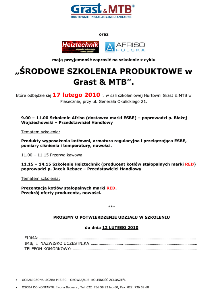oraz mają przyjemność zaprosić na szkolenie z cyklu „ŚRODOWE SZKOLENIA PRODUKTOWE w Grast & MTB”. które odbędzie się 17 lutego 2010 r. w sali szkoleniowej Hurtowni Grast & MTB w Piasecznie, przy ul. Generała Okulickiego 21. 9.00 – 11.00 Szkolenie Afriso (dostawca marki ESBE) – poprowadzi p. Błażej Wojciechowski – Przedstawiciel Handlowy Tematem szkolenia: Produkty wyposażenia kotłowni, armatura regulacyjna i przełączająca ESBE, pomiary ciśnienia i temperatury, nowości. 11.00 – 11.15 Przerwa kawowa 11.15 – 14.15 Szkolenie Heiztechnik (producent kotłów stałopalnych marki RED) poprowadzi p. Jacek Rebacz – Przedstawiciel Handlowy Tematem szkolenia: Prezentacja kotłów stałopalnych marki RED. Przekrój oferty producenta, nowości. *** PROSIMY O POTWIERDZENIE UDZIAŁU W SZKOLENIU do dnia 12 LUTEGO 2010 FIRMA:…………………………………………………………………………………………………………………………………… IMIĘ I NAZWISKO UCZESTNIKA:……..…………………..…………………………………………………………… TELEFON KOMÓRKOWY: …………………………….………………………………………………………………………… • OGRANICZONA LICZBA MIEJSC – OBOWIĄZUJE KOLEJNOŚĆ ZGŁOSZEŃ. • OSOBA DO KONTAKTU: Iwona Bednarz , Tel. 022 736 59 92 lub 60; Fax. 022 736 59 68