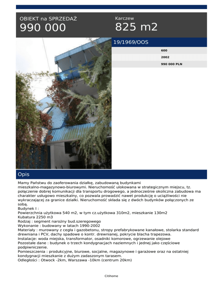 OBIEKT na SPRZEDAŻ 990 000 Karczew 825 m2 19/1969/OOS 600 2002 990 000 PLN Opis Mamy Państwu do zaoferowania działkę, zabudowaną budynkami mieszkalno-magazynowo-biurowymi. Nieruchomość ulokowana w strategicznym miejscu, tz. połączenie dobrej komunikacji dla transportu drogowego, a jednocześnie okoliczna zabudowa ma charakter usługowo mieszkalny, co pozwala prowadzić nawet produkcję o uciążliwości nie wykraczającej za granice działki. Nieruchomość składa się z dwóch budynków połączonych ze sobą. Budynek I : Powierzchnia użytkowa 540 m2, w tym cz.użytkowa 310m2, mieszkanie 130m2 Kubatura 2250 m3 Rodzaj : segment narożny bud.szeregowego Wykonanie : budowany w latach 1990-2002 Materiały : murowany z cegła i gazobetonu, stropy prefabrykowane kanałowe, stolarka standard drewniana i PCV, dachy spadowe o kontr. drewnianej, pokrycie blacha trapezowa. Instalacje: woda miejska, transformator, osadniki komorowe, ogrzewanie olejowe Pozostałe dane : budynek o trzech kondygnacjach naziemnych i jednej jako częściowe podpiwniczenie. Pomieszczenia : produkcyjne, biurowe, socjalne, magazynowe i garażowe oraz na ostatniej kondygnacji mieszkanie z dużym zadaszonym tarasem. Odległości : Otwock -2km, Warszawa -10km (centrum 20km) Citihome Wykaz pomieszczeń: Piwnice 31 m2 1 pomieszczenie gosp. 25 m2 2 kotłownia 6 m2 Parter 211 m2 3 Hala prod. 88 m2 4 Biuro 17 m2 5 Łazienka / WC 6 m2 6 Pom.socjalne 8 m2 7 Magazyn 40 m2 8 Garaż - magazyn 18 m2 9 Garaż 26 m2 10 Wejscie / komunikacja 8 m2 Pierwsze piętro 168 m2 11 Hala prod. 65 m2 12 Pom.prod.K 12 m2 13 Łazienka / WC / pom.socjal. 19 m2 14 Biuro 1 14 m2 15 Biuro 2 15 m2 16 Pom.magazyn.A 14 m2 17 Antresola (z windą) 12 m2 18 Magazynek 6 m2 19 Łącznik 7 m2 20 komunikacja 4 m2 II piętro (mieszkanie) 130 m2 21 Salon 30 m2 22 Sypialnia 12 m2 23 Jadalnia 22 m2 24 Pokój 15 m2 25 Kuchnia 10 m2 26 Łazienka /WC 7 m2 27 Pokój P 16 m2 28 Spiżarka 2 m2 29 Holl / komunikacja 16 m2 Wykaz pomieszczeń budynku II: piwnice 62,70 1 pomieszczenia gospodarcze 42,40 2 kotłownia 20,30 parter 73,50 3 hala produkcyjna 47,20 4 magazynek 12,50 5 pom.socjalne 4,60 6 wiatrołap 1,70 7 komunikacja 7,50 piętro 77,10 7 biuro 15,10 8 WC 1,30 9 hala prod.-magazynowa 52,10 10 komunikacja 8,60 pietro II 71,70 11 mieszkanie gościnne -kuchn./jadaln. 13,50 12 -pokój 8,80 13 -łazienka 1,80 14 -wc 1,10 15 -hall 3,40 16 magazyn 38,00 17 klatka schod. 5,10 Citihome Zachęcam do oglądania Jakub Guziewski Specjalista ds sprzedaży [email protected] 0 516 085 587 Jakub Guziewski tel. 516-085-587 email: [email protected] Citihome Powered by TCPDF (www.tcpdf.org)