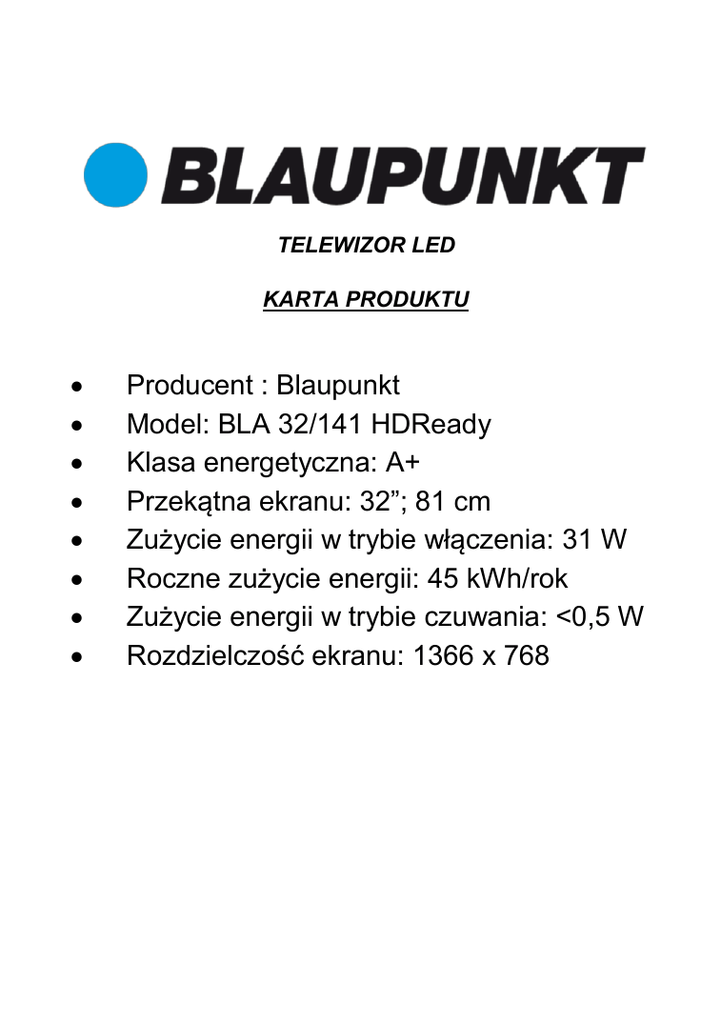 TELEWIZOR LED KARTA PRODUKTU Producent : Blaupunkt Model: BLA 32/141 HDReady Klasa energetyczna: A+ Przekątna ekranu: 32”; 81 cm Zużycie energii w trybie włączenia: 31 W Roczne zużycie energii: 45 kWh/rok Zużycie energii w trybie czuwania: <0,5 W Rozdzielczość ekranu: 1366 x 768
