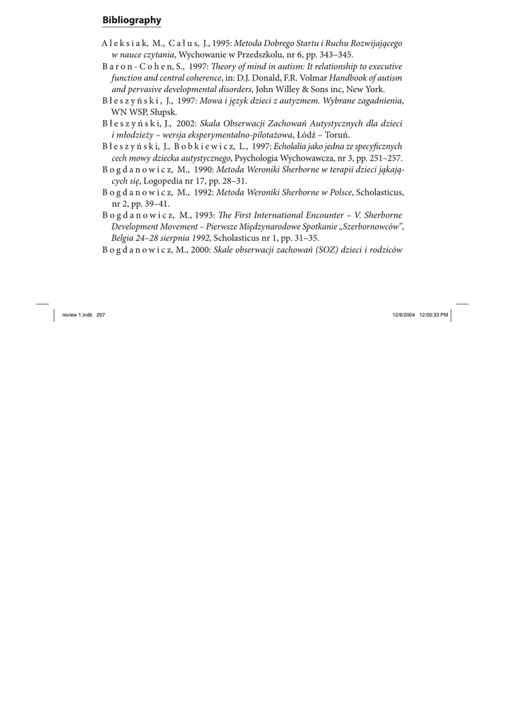 Bibliography A l e k s i a k, M., C a ł u s, J., 1995: Metoda Dobrego Startu i Ruchu Rozwijającego w nauce czytania, Wychowanie w Przedszkolu, nr 6, pp. 343–345. B a r o n - C o h e n, S., 1997: Theory of mind in autism: It relationship to executive function and central coherence, in: D.J. Donald, F.R. Volmar Handbook of autism and pervasive developmental disorders, John Willey & Sons inc, New York. B ł e s z y ń s k i , J., 1997: Mowa i język dzieci z autyzmem. Wybrane zagadnienia, WN WSP, Słupsk. B ł e s z y ń s k i, J., 2002: Skala Obserwacji Zachowań Autystycznych dla dzieci i młodzieży – wersja eksperymentalno-pilotażowa, Łódź – Toruń. B ł e s z y ń s k i, J., B o b k i e w i c z, L., 1997: Echolalia jako jedna ze specyficznych cech mowy dziecka autystycznego, Psychologia Wychowawcza, nr 3, pp. 251–257. B o g d a n o w i c z, M., 1990: Metoda Weroniki Sherborne w terapii dzieci jąkających się, Logopedia nr 17, pp. 28–31. B o g d a n o w i c z, M., 1992: Metoda Weroniki Sherborne w Polsce, Scholasticus, nr 2, pp. 39–41. B o g d a n o w i c z, M., 1993: The First International Encounter – V. Sherborne Development Movement – Pierwsze Międzynarodowe Spotkanie „Szerbornowców”, Belgia 24–28 sierpnia 1992, Scholasticus nr 1, pp. 31–35. B o g d a n o w i c z, M., 2000: Skale obserwacji zachowań (SOZ) dzieci i rodziców review 1.indb 207 12/6/2004 12:00:33 PM 208 Jacek Błeszyński uczestniczących w zajęciach Ruchu Rozwijającego Weroniki Sherborne, W FOKUS, Gdańsk. B o g d a n o w i c z, M., K i s i e l, B., P r z a s n y s k a, M., 1996: Metoda Weroniki Sherborne w terapii i wspomaganiu rozwoju dziecka, WSiP, Warszawa. B r e d a, E., 1998: Radość i poczucie bezpieczeństwa. Zajęcia Metodą Ruchu Rozwijającego Weroniki Sherborne, Wychowanie w Przedszkolu, nr 2, pp. 125–128. B r z e z i ń s k i, J., Badania eksperymentalne w psychologii i pedagogice, WN Scholar, Warszawa. C z a r n e c k a, E., 1994: Metoda Weroniki Sherborne w pracy przedszkola, Wychowanie w Przedszkolu nr 9, pp. 553 –556. D e r u l s k a, I., P i e l a k, H., 1989: Metoda Weroniki Sherborne, in: M. Borkowskiej (ed.), ABC rehabilitacji dzieci z mózgowym porażeniem dziecięcym, Pelikan, Warszawa. G n i e w k o w s k i, W., 1983: Przegląd współczesnych kierunków i tendencji wiązania ruchu z muzyką, Nowa Szkoła, nr 2, p. 76–81. G n i e w k o w s k i, W., W l a ź n i a k, K., 1991: Program wychowania fizycznego dla klas początkowych, WSiP, Warszawa. G o r z e l i ń s k a, J., 2003: Tresowanie do życia, Przekrój, nr 30/3031 from 27 july 2003, p. 36–39. J a k l e w i c z, H., 2002: Diagnostyka autyzmu dziecięcego. Badania longituidalne, Psychiatria Polska t. XXXVI, nr 1, p. 109 –120. J a t o w c z y c, A., 1998: Partnerstwo w „szkole dla rodziców”, Wychowanie w Przedszkolu nr 5, p. 637. K a j a, B., 1995: Zarys terapii dziecka, WSP, Bydgoszcz. K r a w i e c, M., C h u d o b a, U., 1994: Z doświadczeń wspomagania terapii dzieci z wadą słuchu Weroniki Sherborne, Scholasticus nr 7– 8, p. 71–78. K r o c z a k, J., 1989: Przytul mnie, baw i dotykaj, Wychowanie w Przedszkolu, nr 6, pp. 469 – 472. K r u p a, M., 1998 „Mamo, tato, na zabawę czas!”, Wychowanie w Przedszkolu, nr 5, p. 365 –366. K u ś, E., 1994: Metoda Weroniki Shelborne w pracy z dziećmi z mózgowym porażeniem dziecięcym, Szkoła Specjalna, nr 4, pp. 225–228. L u b i a n i e c, E., 1992: Terapia ruchowa W. Sherborne w pracy domu małego dziecka, Problemy Opiekuńczo-Wychowawcze, nr 10, pp. 437– 438. O k o ń, W., 1987: Zabawa a rzeczywistość, WSiP, Warszawa. O r z e c h o w s k a - M i k u l s k a, G., 1998: „Zaraziłam się” Weroniką Sherborne, Wychowanie w Przedszkolu, nr 5, pp. 356 –357. P a r z y b o k, M., 1992: Ruch rozwijający w pracy domu dziecka, Problemy Opiekuńczo-Wychowawcze, nr 10, pp. 434 –437. review 1.indb 208 12/6/2004 12:00:33 PM Application of the Developmental Movement Method in the Therapy… 209 P i s u l a, E., 1994: Zespół wypalania się sił u rodziców dzieci autystycznych, Nowiny Psychologiczne nr 3, p. 83– 89. P i s u l a, E., 2000: Autyzm u dzieci. Diagnoza, klasyfikacja, etiologia, PWN, Warszawa. P r z a s n y s k a, M., 1989: Nauczanie kultury fizycznej w „szkole życia” według „Programu Ruchu” Weroniki Sherborne, Szkoła Specjalna, nr 2, p. 130 –136. S e k u ł o w i c z, M., 2002: Wypalanie zawodowe nauczycieli pracujących z osobami z niepełnosprawnością intelektualną, UW, Wrocław. S ę k o w s k a, Z., 1998:Wprowadzenie do pedagogiki specjalnej, WSPS, Warszawa. S h e r b o r n e, W., 1993: Developmental Movement for Children. Mainstream special needs and pre-school, The Press Sindicate of the University of Cambridge. S o b o l e w s k a, B., 1994: Bawimy się razem z mamą i tatą, Wychowanie w Przedszkolu, nr 8, p. 496–498. S z o t, Z., B ł e s z y ń s k i, J., 2002: Terapia ruchowa a rozwój osób autystycznych, Rocznik Naukowy Akademii Wychowania Fizycznego i Sportu im. J. Śniadeckiego w Gdańsku, t. XIII, p. 5 –18. Ś l i ż, M., 1994: „Sprawni inaczej” są wśród nas, otwórzmy przed nimi życie, Szkoła Specjalna nr 1, s. 45 – 49. The Dance Handbook. The Birth of Modern Dance, 1988, Longman, London. The New Encyclopaedia Britanica, 1987, vol. 7, Chicago. Z a b ł o c k i, J. Z., 1998: Mózgowe porażenie dziecięce w teorii i praktyce, WA “Żak”, Warszawa. Z g o n d e k , E., 1998: Jak powstał Ośrodek Twórczości Pedagogicznej, Wychowanie w Przedszkolu, nr 5, p. 351–354. review 1.indb 209 12/6/2004 12:00:33 PM