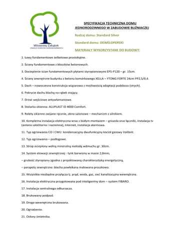 SPECYFIKACJA TECHNICZNA DOMU JEDNORODZINNEGO W ZABUDOWIE BLIŹNIACZEJ Rodzaj domu: Standard Silver Standard domu: DEWELOPERSKI MATERIAŁY WYKORZYSTANE DO BUDOWY: 1. Ławy fundamentowe żelbetowe prostokątne. 2. Ściany fundamentowe z bloczków betonowych. 3. Docieplenie ścian fundamentowych płytami styropianowymi EPS-P120 – gr. 15cm. 4. Ściany zewnętrzne budynku z betonu komórkowego XELLA – YTONG FORTE 24cm PP2,5/0,4. 5. Dach – nowoczesna konstrukcja wiązarowa z możliwością adaptacji poddasza (strych). 6. Pokrycie dachu blachą na rąbek stojący. 7. Drzwi wejściowe antywłamaniowe. 8. Stolarka okienna: ALUPLAST ID 4000 Comfort. 9. Rolety okienne zwijane ręcznie, okno salonowe – mechanizm z silnikiem. 10. Kompletna instalacja elektryczna wraz z białym montażem – gniazda oraz łączniki, instalacja tv (antena satelitarna i naziemna), Internet, instalacja alarmowa. 11. Typ ogrzewania CO i CWU: kondensacyjny dwufunkcyjny kocioł gazowy Vaillant. 12. Typ ogrzewania – podłogowe. 13. Strop ocieplony wełną mineralną metodą wdmuchu gr. 30cm. 14. System elewacji zewnętrznej - tynk barwiony w masie 2,0mm; – grubość styropianu zgodna z projektowaną charakterystyką energetyczną, – parapety zewnętrzne: blacha powlekana malowana proszkowo. 15. Wszystkie niezbędne przyłącza tj. prąd, woda, gaz, sieć kanalizacyjna wewnętrzna. 16. Instalacja elektryczna przygotowana pod inteligentny dom – system FIBARO. 17. Instalacja centralnego odkurzacza. 18. Brukowany podjazd. 19. Droga wewnętrzna brukowana. 20. Ogrodzenie. 21. Osłony śmietnika. FAKULTATYWNE OPCJE PŁATNE DODATKOWO: 1. Rolety okienne z pełną automatyką. 2. Przesuwne rolety przeciwsłoneczne. 3. Alarm. 4. Taras – wylewka betonowa lub drewniany 5. Wiata garażowa. 6. Kominek wg projektu indywidualnego. 7. FIBARO – inteligentny dom wraz z centralą zarządzającą, dającą nieograniczone możliwości. 8. Jednofunkcyjny kocioł gazowy z zasobnikiem. 9. System nawadniania ogrodu wraz z gotowym trawnikiem (trawa z rolki). 10. Grzejnik drabinkowy łazienkowy elektryczny.