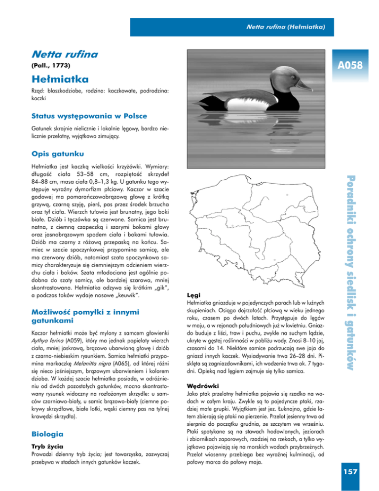 Netta rufina (He∏miatka) Netta rufina A058 (Pall., 1773) He∏miatka Rzàd: blaszkodziobe, rodzina: kaczkowate, podrodzina: kaczki Status wyst´powania w Polsce Gatunek skrajnie nielicznie i lokalnie l´gowy, bardzo nielicznie przelotny, wyjàtkowo zimujàcy. Opis gatunku Mo˝liwoÊç pomy∏ki z innymi gatunkami Kaczor he∏miatki mo˝e byç mylony z samcem g∏owienki Aythya ferina (A059), który ma jednak popielaty wierzch cia∏a, mniej jaskrawà, bràzowo ubarwionà g∏ow´ i dziób z czarno-niebieskim rysunkiem. Samica he∏miatki przypomina markaczk´ Melanitta nigra (A065), od której ró˝ni si´ nieco jaÊniejszym, bràzowym ubarwieniem i kolorem dzioba. W ka˝dej szacie he∏miatka posiada, w odró˝nieniu od dwóch pozosta∏ych gatunków, mocno skontrastowany rysunek widoczny na roz∏o˝onym skrzydle: u samców czarniawo-bia∏y, u samic bràzowo-bia∏y (ciemne pokrywy skrzyd∏owe, bia∏e lotki, wàski ciemny pas na tylnej kraw´dzi skrzyd∏a). Biologia Tryb ˝ycia Prowadzi dzienny tryb ˝ycia; jest towarzyska, zazwyczaj przebywa w stadach innych gatunków kaczek. he∏miatka L´gi He∏miatka gniazduje w pojedynczych parach lub w luênych skupieniach. Osiàga dojrza∏oÊç p∏ciowà w wieku jednego roku, czasem po dwóch latach. Przyst´puje do l´gów w maju, a w rejonach po∏udniowych ju˝ w kwietniu. Gniazdo buduje z liÊci, traw i puchu, zwykle na suchym làdzie, ukryte w g´stej roÊlinnoÊci w pobli˝u wody. Znosi 8–10 jaj, czasami do 14. Niektóre samice podrzucajà swe jaja do gniazd innych kaczek. Wysiadywanie trwa 26–28 dni. Piskl´ta sà zagniazdownikami, ich wodzenie trwa ok. 7 tygodni. Opiekà nad l´giem zajmuje si´ tylko samica. Poradniki ochrony siedlisk i gatunków He∏miatka jest kaczkà wielkoÊci krzy˝ówki. Wymiary: d∏ugoÊç cia∏a 53–58 cm, rozpi´toÊç skrzyde∏ 84–88 cm, masa cia∏a 0,8–1,3 kg. U gatunku tego wyst´puje wyraêny dymorfizm p∏ciowy. Kaczor w szacie godowej ma pomaraƒczowobràzowà g∏ow´ z krótkà grzywà, czarnà szyj´, pierÊ, pas przez Êrodek brzucha oraz ty∏ cia∏a. Wierzch tu∏owia jest brunatny, jego boki bia∏e. Dziób i t´czówka sà czerwone. Samica jest brunatna, z ciemnà czapeczkà i szarymi bokami g∏owy oraz jasnobràzowym spodem cia∏a i bokami tu∏owia. Dziób ma czarny z ró˝owà przepaskà na koƒcu. Samiec w szacie spoczynkowej przypomina samic´, ale ma czerwony dziób, natomiast szata spoczynkowa samicy charakteryzuje si´ ciemniejszym odcieniem wierzchu cia∏a i boków. Szata m∏odociana jest ogólnie podobna do szaty samicy, ale bardziej szarawa, mniej skontrastowana. He∏miatka odzywa si´ krótkim „gik”, a podczas toków wydaje nosowe „keuwik”. W´drówki Jako ptak przelotny he∏miatka pojawia si´ rzadko na wodach w ca∏ym kraju. Zwykle sà to pojedyncze ptaki, rzadziej ma∏e grupki. Wyjàtkiem jest jez. ¸uknajno, gdzie latem zbierajà si´ ptaki na pierzenie. Przelot jesienny trwa od sierpnia do poczàtku grudnia, ze szczytem we wrzeÊniu. Ptaki spotykane sà na stawach hodowlanych, jeziorach i zbiornikach zaporowych, rzadziej na rzekach, a tylko wyjàtkowo pojawiajà si´ na morskich wodach przybrze˝nych. Przelot wiosenny przebiega bez wyraênej kulminacji, od po∏owy marca do po∏owy maja. 157 Ptaki (cz´Êç I) Poradniki ochrony siedlisk i gatunków A058 Zimowanie Europejskie he∏miatki sp´dzajà zim´ na po∏udniu Europy, g∏ównie w basenie Morza Âródziemnego. Cz´Êç polskiej populacji pozostaje w kraju do pierwszych mrozów, ale obserwacje zimowe z okresu od 2. po∏owy grudnia do po∏owy lutego nale˝à do rzadkoÊci i zanotowano zaledwie oko∏o 20 takich przypadków. Najcz´Êciej przypadki zimowania powtarzajà si´ w Wielkopolsce, rzadziej na Âlàsku, a zupe∏nie wyjàtkowo na pó∏nocy kraju. Pokarm He∏miatka ˝ywi si´ liÊçmi, korzeniami i nasionami roÊlin wodnych. Ulubionym pokarmem sà glony zwane ramienicami, tworzàce podwodne ∏àki na dnie p∏ytkich akwenów. Zjada tak˝e niewielkie iloÊci pokarmu zwierz´cego, g∏ównie wodne bezkr´gowce. ˚eruje zarówno nurkujàc, jak i zbierajàc pokarm z powierzchni wody. Wyst´powanie Siedlisko Zamieszkuje ró˝nego rodzaju wody Êródlàdowe, p∏ytkie jeziora i stawy hodowlane z bujnymi szuwarami, a tak˝e wody s∏onawe, zw∏aszcza delty rzek. W kraju stwierdzono jà na kompleksach stawów, naturalnych jeziorach, a tak˝e na zalewach nadmorskich. Siedliska z za∏àcznika I Dyrektywy Siedliskowej 1150 Zalewy i jeziora przymorskie (laguny) 3140 Twardowodne oligo- i mezotroficzne zbiorniki z podwodnymi ∏àkami ramienic Charetea 3150 Starorzecza i naturalne eutroficzne zbiorniki wodne ze zbiorowiskami z Nymphaeion, Potamion Rozmieszczenie geograficzne Area∏ l´gowy jest mocno porozrywany i obejmuje obszar od po∏udniowej Hiszpanii i Francji przez Europ´ Ârodkowà i rejon Morza Czarnego i Morza Kaspijskiego a˝ po Azj´ Ârodkowà. Zimuje w po∏udniowej Europie, na Bliskim i Ârodkowym Wschodzie oraz w pó∏nocnych Indiach i po∏udniowo-wschodniej Azji. Rozmieszczenie w Polsce He∏miatka gniazduje w kraju tylko na kilku rozproszonych stanowiskach. Szereg z nich znanych z lat 70. i 80. i zlokalizowanych na Mazurach, np. na jez. KaraÊ i Warno∏ty, na Zalewie WiÊlanym i w Wielkopolsce, prawdopodobnie nie jest obecnie zajmowanych, a jedynym aktualnym l´gowiskiem w pó∏nocnej Polsce pozostaje jez. ¸uknajno. Do najbardziej sta∏ych stanowisk nale˝à obecnie: stawy ¸´˝czok i stawy Wielikàt na Opolszczyênie oraz stawy w Górkach w dolinie Nidy. Ponadto bezsporny l´g stwierdzono na stawach w Mi∏os∏awiu w Wielkopolsce. Mo˝liwe jest tak˝e gniazdowanie he∏miatki na Stawach Milickich w dolinie Baryczy. 158 Status ochronny Ochrona gatunkowa w Polsce: gatunek obj´ty ochronà Êcis∏à (Dz U z 2004 r. Nr 220, poz. 2237) Polska czerwona ksi´ga zwierzàt (2001): LC gatunek mniejszego ryzyka, ale wymagajàcy szczególnej uwagi Status zagro˝enia 