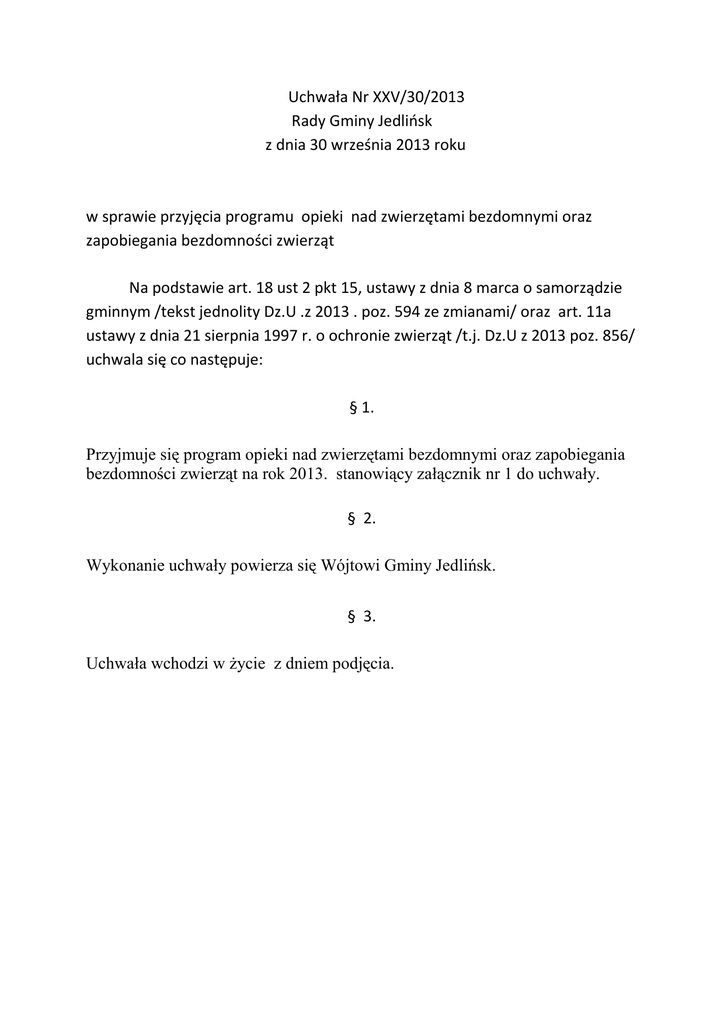 Uchwała Nr XXV/30/2013 Rady Gminy Jedlińsk z dnia 30 września 2013 roku w sprawie przyjęcia programu opieki nad zwierzętami bezdomnymi oraz zapobiegania bezdomności zwierząt Na podstawie art. 18 ust 2 pkt 15, ustawy z dnia 8 marca o samorządzie gminnym /tekst jednolity Dz.U .z 2013 . poz. 594 ze zmianami/ oraz art. 11a ustawy z dnia 21 sierpnia 1997 r. o ochronie zwierząt /t.j. Dz.U z 2013 poz. 856/ uchwala się co następuje: § 1. Przyjmuje się program opieki nad zwierzętami bezdomnymi oraz zapobiegania bezdomności zwierząt na rok 2013. stanowiący załącznik nr 1 do uchwały. § 2. Wykonanie uchwały powierza się Wójtowi Gminy Jedlińsk. § 3. Uchwała wchodzi w życie z dniem podjęcia. UZASADNIENIE Zapewnienie opieki bezdomnym zwierzętom oraz ich wyłapywanie należy do zadań własnych gminy. Od pierwszego stycznia 2012 r. obowiązuje znowelizowana ustawa o ochronie zwierząt, która nakłada na gminy obowiązek corocznego opracowywania programu zapobiegania bezdomności zwierząt. Program na rok 2013 uwzględnia uwagi Wojewody Mazowieckiego i Powiatowego Inspektora Weterynarii z 2012 r. Projekt Program na rok 2013 został pozytywnie zaopiniowany przez Powiatowego Inspektora Weterynarii Załącznik nr 1 do Uchwały Rady Gminy Jedlińsk Nr XXV/30/2013 z dnia 30 września 2013r. PROGRAM OPIEKI NAD ZWIERZĘTAMI BEZDOMNYMI ORAZ ZAPOBIEGANIA BEZDOMNOŚCI ZWIERZĄT Rozdział I Postanowienia ogólne §1 Uchwała ma zastosowanie do wszystkich zwierząt domowych i gospodarskich w tym w szczególności do psów i kotów przebywających w granicach administracyjnych Gminy Jedlińsk. §2 Celem Programu jest zapewnienie opieki nad zwierzętami bezdomnymi poprzez: 1. 2. 3. 4. Zapobieganie bezdomności bezpańskich zwierząt, Ograniczenie niekontrolowanego rozrodu psów i kotów, Usypianie ślepych miotów psów i kotów, Edukacja mieszkańców gminy w zakresie zasad humanitarnego traktowania zwierząt oraz obowiązków właścicieli zwierząt domowych, 5. Opieka nad zwierzętami bezdomnymi, 6. Zapewnienie bezpieczeństwa mieszkańcom gminy. §3 Wykonawcami programu są: 1. Gmina Jedlińsk 2. Zakład Gospodarki Komunalnej w Jedlińsku w zakresie zadań wynikających z rozdziału II programu z wyłączeniem pkt. 7. 3. Funkcję koordynatora działań obejmujących zadania wynikające z rozdziału III i IV programu pełni Referat Rolnictwa, Środowiska i Gospodarki Gruntami 4. Osoby prawne i fizyczne działające na rzecz zapewnienia opieki bezdomnym zwierzętom we współpracy z organami gminy 5. Dzierżawcy obwodów łowieckich na terenie gminy we współpracy z organami gminy. Rozdział II Zapewnienie opieki bezdomnym zwierzętom §4 W celu zapewnienia opieki bezdomnym zwierzętom przewiduje się realizację następujących zadań: 1. Odławianie bezdomnych zwierząt: a. Stałe, na interwencję - w szczególności zwierząt chorych lub zagrażających życiu, zdrowiu i bezpieczeństwu ludzi. b. Okresowe, po wcześniejszym ogłoszeniu. Informacje o akcji wyłapywania bezdomnych zwierząt podawane będą do publicznej wiadomości poprzez ogłoszenie na tablicy ogłoszeń Urzędu Gminy i stronie internetowej urzędu co najmniej 21 dni przed planowanym terminem rozpoczęcia działań. 2. Zapewnienie wyłapanym zwierzętom miejsc w Schronisku dla Zwierząt. 3. Wyłapywanie bezdomnych zwierząt będzie prowadzone przez przeszkolonych pracowników przy użyciu specjalistycznego sprzętu przeznaczonego do wyłapywania zwierząt, który nie stwarza zagrożenia dla zdrowia zwierząt, a także nie będzie zadawał im cierpienia. Wyłapane zwierzęta do czasu przekazania do adopcji lub schroniska będą przebywały w pomieszczeniach budynku do czasowej kwarantanny prowadzonym przez ZGK. 4. Zapewnienie całodobowej opieki weterynaryjnej w przypadku zdarzeń drogowych z udziałem zwierząt. 5. Poszukiwanie nowych właścicieli dla bezdomnych zwierząt. a. Za poszukiwanie nowych właścicieli dla psów i kotów odpowiedzialni są ich dotychczasowi właściciele. b. ZGK będzie poszukiwał nowych właścicieli dla wyłapanych psów i kotów poprzez zwyczajowo przyjęty sposób informowania o możliwości adopcji tych zwierząt. 6. Dokarmianie wolno żyjących kotów podejmowane będzie przez ZGK w przypadkach uzasadnionych, na interwencję. 7. Zwierzętom gospodarskim zapewnia się miejsce w gospodarstwie Pana Oklei w Lisowie. Rozdział III Zmniejszenie populacji bezdomnych zwierząt §5 W celu zmniejszenia populacji bezdomnych zwierząt domowych planuje się realizację następujących zadań: 1. Prowadzenie akcji zachęcającej właścicieli psów i kotów do wykonywania zabiegów sterylizacji i kastracji na niżej wymienionych zasadach: a/ dofinansowanie w wysokości 50 % kosztów sterylizacji samic i kastracji samców. b/ o dofinansowanie mogą się ubiegać właściciele zwierząt, którzy są: - mieszkańcami gminy Jedlińsk, - oznakowali zwierzę elektronicznie lub tatuażem, - przedstawią aktualne zaświadczenie o zaszczepieniu zwierzęcia przeciw wściekliźnie. - jeden właściciel może się ubiegać o dofinansowanie zabiegu u maksymalnie 2 szt. zwierząt domowych. 2. Wykonywanie na koszt gminy sterylizacji i kastracji bezdomnych zwierząt pozostających pod czasową opieką gminy 3. Umożliwienie bezpłatnego usypiania ślepych miotów właścicielom suk pod warunkiem poddania suki sterylizacji. Koszty zabiegu ponoszone będą w 50 % przez właściciela a 50 % należności pokryje gmina. 4. Zabiegi sterylizacji i kastracji mogą być prowadzone tylko przez wskazanego przez gminę lekarza weterynarii. 5. Zadania wymienione w pkt 3 realizowane będą w ramach posiadanych przez gminę środków finansowych. 6. Informacje o możliwości skorzystania z dofinansowania zostaną przekazane do publicznej wiadomości poprzez ogłoszenie na tablicy ogłoszeń Urzędu Gminy i stronie internetowej urzędu. Rozdział IV Edukacja w zakresie ochrony zwierząt §6 W celu edukacji w zakresie ochrony 
