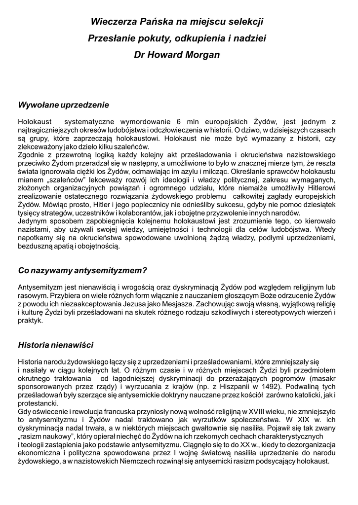 Wieczerza Pańska na miejscu selekcji Przesłanie pokuty, odkupienia i nadziei Dr Howard Morgan Wywołane uprzedzenie Holokaust systematyczne wymordowanie 6 mln europejskich Żydów, jest jednym z najtragiczniejszych okresów ludobójstwa i odczłowieczenia w historii. O dziwo, w dzisiejszych czasach są grupy, które zaprzeczają holokaustowi. Holokaust nie może być wymazany z historii, czy zlekceważony jako dzieło kilku szaleńców. Zgodnie z przewrotną logiką każdy kolejny akt prześladowania i okrucieństwa nazistowskiego przeciwko Żydom przeradzał się w następny, a umożliwione to było w znacznej mierze tym, że reszta świata ignorowała ciężki los Żydów, odmawiając im azylu i milcząc. Określanie sprawców holokaustu mianem „szaleńców” lekceważy rozwój ich ideologii i władzy politycznej, zakresu wymaganych, złożonych organizacyjnych powiązań i ogromnego udziału, które niemalże umożliwiły Hitlerowi zrealizowanie ostatecznego rozwiązania żydowskiego problemu całkowitej zagłady europejskich Żydów. Mówiąc prosto, Hitler i jego poplecznicy nie odnieśliby sukcesu, gdyby nie pomoc dziesiątek tysięcy strategów, uczestników i kolaborantów, jak i obojętne przyzwolenie innych narodów. Jedynym sposobem zapobiegnięcia kolejnemu holokaustowi jest zrozumienie tego, co kierowało nazistami, aby używali swojej wiedzy, umiejętności i technologii dla celów ludobójstwa. Wtedy napotkamy się na okrucieństwa spowodowane uwolnioną żądzą władzy, podłymi uprzedzeniami, bezduszną apatią i obojętnością. Co nazywamy antysemityzmem? Antysemityzm jest nienawiścią i wrogością oraz dyskryminacją Żydów pod względem religijnym lub rasowym. Przybiera on wiele różnych form włącznie z nauczaniem głoszącym Boże odrzucenie Żydów z powodu ich niezaakceptowania Jezusa jako Mesjasza. Zachowując swoją własną, wyjątkową religię i kulturę Żydzi byli prześladowani na skutek różnego rodzaju szkodliwych i stereotypowych wierzeń i praktyk. Historia nienawiści Historia narodu żydowskiego łączy się z uprzedzeniami i prześladowaniami, które zmniejszały się i nasilały w ciągu kolejnych lat. O różnym czasie i w różnych miejscach Żydzi byli przedmiotem okrutnego traktowania od łagodniejszej dyskryminacji do przerażających pogromów (masakr sponsorowanych przez rządy) i wyrzucania z krajów (np. z Hiszpanii w 1492). Podwaliną tych prześladowań były szerzące się antysemickie doktryny nauczane przez kościół zarówno katolicki, jak i protestancki. Gdy oświecenie i rewolucja francuska przyniosły nową wolność religijną w XVIII wieku, nie zmniejszyło to antysemityzmu i Żydów nadal traktowano jak wyrzutków społeczeństwa. W XIX w. ich dyskryminacja nadal trwała, a w niektórych miejscach gwałtownie się nasiliła. Pojawił się tak zwany „rasizm naukowy”, który opierał niechęć do Żydów na ich rzekomych cechach charakterystycznych i teologii zastąpienia jako podstawie antysemityzmu. Ciągnęło się to do XX w., kiedy to dezorganizacja ekonomiczna i polityczna spowodowana przez I wojnę światową nasiliła uprzedzenie do narodu żydowskiego, a w nazistowskich Niemczech rozwinął się antysemicki rasizm podsycający holokaust. Żydzi - klucz do powrotu Jezusa Antysemityzm to coś więcej niż religijne, społeczne, ekonomiczne czy polityczne zjawisko. Jest to strategia zainspirowana przez demoniczne duchy, którym zależy nie tylko na tym, aby skrzywdzić czy zabić Żydów, ale żeby tak naprawdę zapobiec powtórnemu przyjściu Jezusa (Jeszui) Mesjasza. Żydzi są celem szatana, nie dlatego, że są po prostu Żydami, ale dlatego, że mają centralne miejsce w Bożym planie powrotu Mesjasza na ziemię (Zach. 12:10-11, 14:4, Ew. Mat. 23:39, Rzym. 11:15). Musimy to zrozumieć, żebyśmy mogli rozpoznać i skutecznie zdemaskować źródła antysemityzmu i jeśli Bóg daje nam taką możliwość, stać razem przeciwko wszelkiego rodzaju działaniom antysemickim i zwalczać ich skutki. Pozwólcie, że wyjaśnię wam to trochę lepiej. Ostateczny cel demonów inspirujących antysemityzm jest zawsze taki sam zniszczenie narodu żydowskiego. Dlaczego? Ponieważ szatan wie, że naród żydowski ma kluczową rolę w Bożym planie powtórnego przyjścia Jezusa. W Ew. Mat. 23:39 Jezus mówi Żydom, że nie ujrzą Go dopóki nie powiedzą do Niego: Błogosławiony, który przychodzi w imieniu Pańskim. Proszę, zwróćcie uwagę na to, że powiedzenie poprzedza ujrzenie. Innymi słowy, Żydzi, którzy odrzucili Jezusa muszą Go przyjąć. Muszą wołać, aby powrócił. W Dz. Ap. 3:21 Piotr mówi, że Jezusa musi przyjąć niebo aż do czasu odnowienia wszechrzeczy, o czym od wieków mówił Bóg przez usta świętych proroków swoich. Prorocy ogłaszali wiele rzeczy o narodzie żydowskim, włącznie z ich ponownym zebraniem w Ziemi Izraela. Prorok Zachariasz powiedział, że kiedy Bóg wyleje na naród żydowski ducha łaski i błagania, oni spojrzą na mnie, na tego, którego przebodli, i będą go opłakiwać, jak opłakuje się jedynaka, i będą gorzko biadać nad nim, jak gorzko biadają na pierworodnym (Zach. 12:10). W tym wielkim narodowym dniu objawienia naród żydowski będzie przywoływał Jezusa z nieba. Wierzę, że apostoł Paweł potwierdza to w Rzym. 11:15: Jeśli bowiem odrzucenie ich jest pojednaniem świata, to czym będzie przyjęcie ich, jeśli nie powstaniem do życia z martwych?. Ponieważ z wersetu 1 tego rozdziału wiemy, że Bóg nie odrzucił narodu żydowskiego, to odrzucenie, o którym mówi tutaj Paweł jest odrzuceniem Jezusa przez Żydów. Dr David H. Stern w przekładzie Biblii żydowskieJ tłumaczy to tak: Jeżeli ich odrzucenie Jeszui oznacza pojednanie dla świata, co będzie znaczyło ich przyjęcie Go? To będzie jak powstanie ze śmierci do życia! Ich odrzucenie Jezusa oznacza pojednanie dla świata. Ich przyjęcie Go będzie oznaczało życie ze śmierci. Osobi