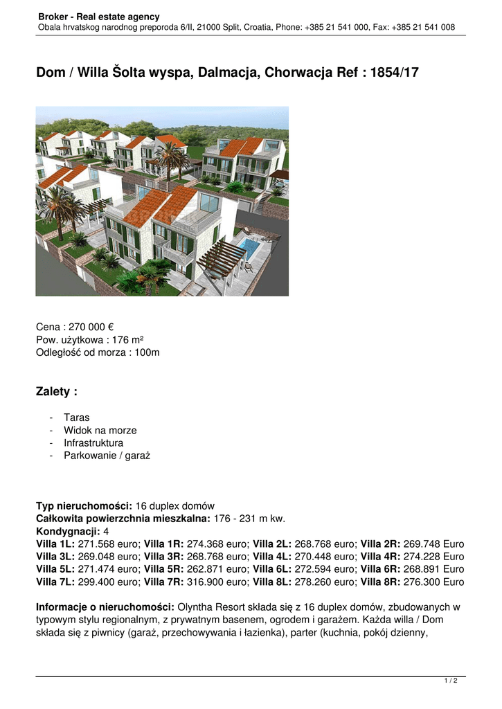 Broker - Real estate agency Obala hrvatskog narodnog preporoda 6/II, 21000 Split, Croatia, Phone: +385 21 541 000, Fax: +385 21 541 008 Dom / Willa Šolta wyspa, Dalmacja, Chorwacja Ref : 1854/17 Cena : 270 000 € Pow. użytkowa : 176 m² Odległość od morza : 100m Zalety : - Taras Widok na morze Infrastruktura Parkowanie / garaż Typ nieruchomości: 16 duplex domów Całkowita powierzchnia mieszkalna: 176 - 231 m kw. Kondygnacji: 4 Villa 1L: 271.568 euro; Villa 1R: 274.368 euro; Villa 2L: Villa 3L: 269.048 euro; Villa 3R: 268.768 euro; Villa 4L: Villa 5L: 271.474 euro; Villa 5R: 262.871 euro; Villa 6L: Villa 7L: 299.400 euro; Villa 7R: 316.900 euro; Villa 8L: 268.768 euro; 270.448 euro; 272.594 euro; 278.260 euro; Villa 2R: Villa 4R: Villa 6R: Villa 8R: 269.748 Euro 274.228 Euro 268.891 Euro 276.300 Euro Informacje o nieruchomości: Olyntha Resort składa się z 16 duplex domów, zbudowanych w typowym stylu regionalnym, z prywatnym basenem, ogrodem i garażem. Każda willa / Dom składa się z piwnicy (garaż, przechowywania i łazienka), parter (kuchnia, pokój dzienny, 1/2 Broker - Real estate agency Obala hrvatskog narodnog preporoda 6/II, 21000 Split, Croatia, Phone: +385 21 541 000, Fax: +385 21 541 008 łazienka), 1 piętro (3 sypialnie, 2 łazienki, balkon) i poddasze (strych, łazienka, taras ). Wszystkie domy podziwiać wspaniałe widoki na morze i są wyposażone w wysokiej specyfikacji z wbudowanym w kuchni i klimatyzacja w standardzie. Istnieje możliwość pełnego wyposażenia mieszkania przez inwestorów na kolejne 50.000 Euro 2/2