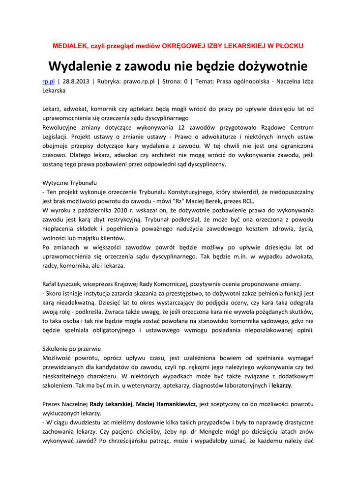 MEDIALEK, czyli przegląd mediów OKRĘGOWEJ IZBY LEKARSKIEJ W PŁOCKU Wydalenie z zawodu nie będzie dożywotnie rp.pl | 28.8.2013 | Rubryka: prawo.rp.pl | Strona: 0 | Temat: Prasa ogólnopolska - Naczelna Izba Lekarska Lekarz, adwokat, komornik czy aptekarz będą mogli wrócić do pracy po upływie dziesięciu lat od uprawomocnienia się orzeczenia sądu dyscyplinarnego Rewolucyjne zmiany dotyczące wykonywania 12 zawodów przygotowało Rządowe Centrum Legislacji. Projekt ustawy o zmianie ustawy - Prawo o adwokaturze i niektórych innych ustaw obejmuje przepisy dotyczące kary wydalenia z zawodu. W tej chwili nie jest ona ograniczona czasowo. Dlatego lekarz, adwokat czy architekt nie mogą wrócić do wykonywania zawodu, jeśli zostaną tego prawa pozbawieni przez odpowiedni sąd dyscyplinarny. Wytyczne Trybunału - Ten projekt wykonuje orzeczenie Trybunału Konstytucyjnego, który stwierdził, że niedopuszczalny jest brak możliwości powrotu do zawodu - mówi "Rz" Maciej Berek, prezes RCL. W wyroku z października 2010 r. wskazał on, że dożywotnie pozbawienie prawa do wykonywania zawodu jest karą zbyt restrykcyjną. Trybunał podkreślał, że może być ona orzeczona z powodu niepłacenia składek i popełnienia poważnego nadużycia zawodowego kosztem zdrowia, życia, wolności lub majątku klientów. Po zmianach w większości zawodów powrót będzie możliwy po upływie dziesięciu lat od uprawomocnienia się orzeczenia sądu dyscyplinarnego. Tak będzie m.in. w wypadku adwokata, radcy, komornika, ale i lekarza. Rafał Łyszczek, wiceprezes Krajowej Rady Komorniczej, pozytywnie ocenia proponowane zmiany. - Skoro istnieje instytucja zatarcia skazania za przestępstwo, to dożywotni zakaz pełnienia funkcji jest karą nieadekwatną. Dziesięć lat to okres wystarczający do podjęcia oceny, czy kara taka odegrała swoją rolę - podkreśla. Zwraca także uwagę, że jeśli orzeczona kara nie wywoła pożądanych skutków, to taka osoba i tak nie będzie mogła zostać powołana na stanowisko komornika sądowego, gdyż nie będzie spełniała obligatoryjnego i ustawowego wymogu posiadania nieposzlakowanej opinii. Szkolenie po przerwie Możliwość powrotu, oprócz upływu czasu, jest uzależniona bowiem od spełniania wymagań przewidzianych dla kandydatów do zawodu, czyli np. rękojmi jego należytego wykonywania czy też nieskazitelnego charakteru. W niektórych wypadkach może być także związane z dodatkowym szkoleniem. Tak ma być m.in. u weterynarzy, aptekarzy, diagnostów laboratoryjnych i lekarzy. Prezes Naczelnej Rady Lekarskiej, Maciej Hamankiewicz, jest sceptyczny co do możliwości powrotu wykluczonych lekarzy. - W ciągu dwudziestu lat mieliśmy dosłownie kilka takich przypadków i były to naprawdę drastyczne zachowania lekarzy. Czy pacjenci chcieliby, żeby np. dr Mengele mógł po dziesięciu latach znów wykonywać zawód? Po chrześcijańsku patrząc, może i wypadałoby uznać, że każdemu należy dać szansę. Ale dla mnie ważniejsze jest stworzenie pacjentom szansy, by nie zetknęli się z niektórymi osobami - wyjaśnia. Prezes RCL podkreśla, że skoro wyroki sądów powszechnych ulegają zatarciu, to trudno uznać za słuszne, że wyroki sądów dyscyplinarnych obowiązują bez takich ograniczeń. - Oczywiście, wczytamy się w uwagi samorządów - zapewnia. Notariusze i doradcy podatkowi mogą już dziś powrócić do zawodu po pięciu latach od kary. W tych wypadkach projekt wyłącznie doprecyzowuje, że muszą dawać rękojmię należytego wykonywania zawodu. Po pięciu latach o wpis będzie się mógł także starać skreślony karnie z listy psycholog. Powrót po dziesięciu latach Po dziesięciu latach od uprawomocnienia się kary skutkującej zakazem działalności będą mogli starać się o powrót do zawodu: * adwokaci, radcy prawni, weterynarze, architekci, inżynierowie budownictwa, urbaniści, rzecznicy patentowi, diagności labolatoryjni, lekarze. Po upływie pięciu lat o ponowny wpis na listę osób wykonujących zawód będą mogli się ubiegać: * notariusze, doradcy podatkowi (tak jak dziś) oraz psychologowie. Etap legislacyjny: konsultacje społeczne