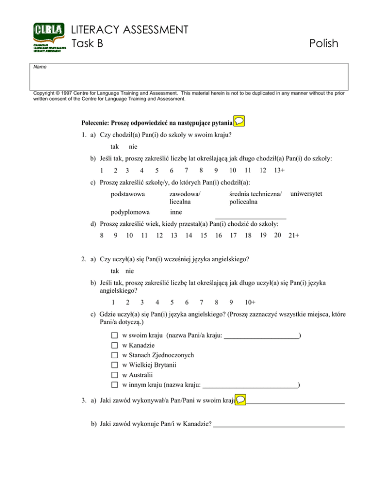 LITERACY ASSESSMENT Task B Polish Name Copyright © 1997 Centre for Language Training and Assessment. This material herein is not to be duplicated in any manner without the prior written consent of the Centre for Language Training and Assessment. Polecenie: Proszę odpowiedzieć na następujące pytania 1. a) Czy chodził(a) Pan(i) do szkoły w swoim kraju? tak nie b) Jeśli tak, proszę zakreślić liczbę lat określającą jak długo chodził(a) Pan(i) do szkoły: 1 2 3 4 5 6 7 8 9 10 11 12 13+ c) Proszę zakreślić szkołę/y, do których Pan(i) chodził(a): podstawowa zawodowa/ licealna podyplomowa inne średnia techniczna/ policealna uniwersytet d) Proszę zakreślić wiek, kiedy przestał(a) Pan(i) chodzić do szkoły: 8 9 10 11 12 13 14 15 16 17 18 19 20 21+ 2. a) Czy uczył(a) się Pan(i) wcześniej języka angielskiego? tak nie b) Jeśli tak, proszę zakreślić liczbę lat określającą jak długo uczył(a) się Pan(i) języka angielskiego? 1 2 3 4 5 6 7 8 9 10+ c) Gdzie uczył(a) się Pan(i) języka angielskiego? (Proszę zaznaczyć wszystkie miejsca, które Pani/a dotyczą.) w swoim kraju (nazwa Pani/a kraju: ______________________) w Kanadzie w Stanach Zjednoczonych w Wielkiej Brytanii w Australii w innym kraju (nazwa kraju: ____________________________) 3. a) Jaki zawód wykonywał/a Pan/Pani w swoim kraju: b) Jaki zawód wykonuje Pan/i w Kanadzie? LITERACY ASSESSMENT 4. Co Pan/i czyta Task A -- Polish po polsku? po angielsku? słowa zdania serie zdań listy formularze czasopisma gazety ________________ ________________ inne 5. Co Pan/i pisze po polsku? po angielsku? alfabet słowa zdania serie zdań notatki listy wypracowania teksty fachowe inne _________________ _________________ 6. Dlaczego chce Pan/i uczyć się języka angielskiego? Co chciał/a by Pan/i osiągnąć przy pomocy tego języka? ___________________________________________________________________________ ___________________________________________________________________________